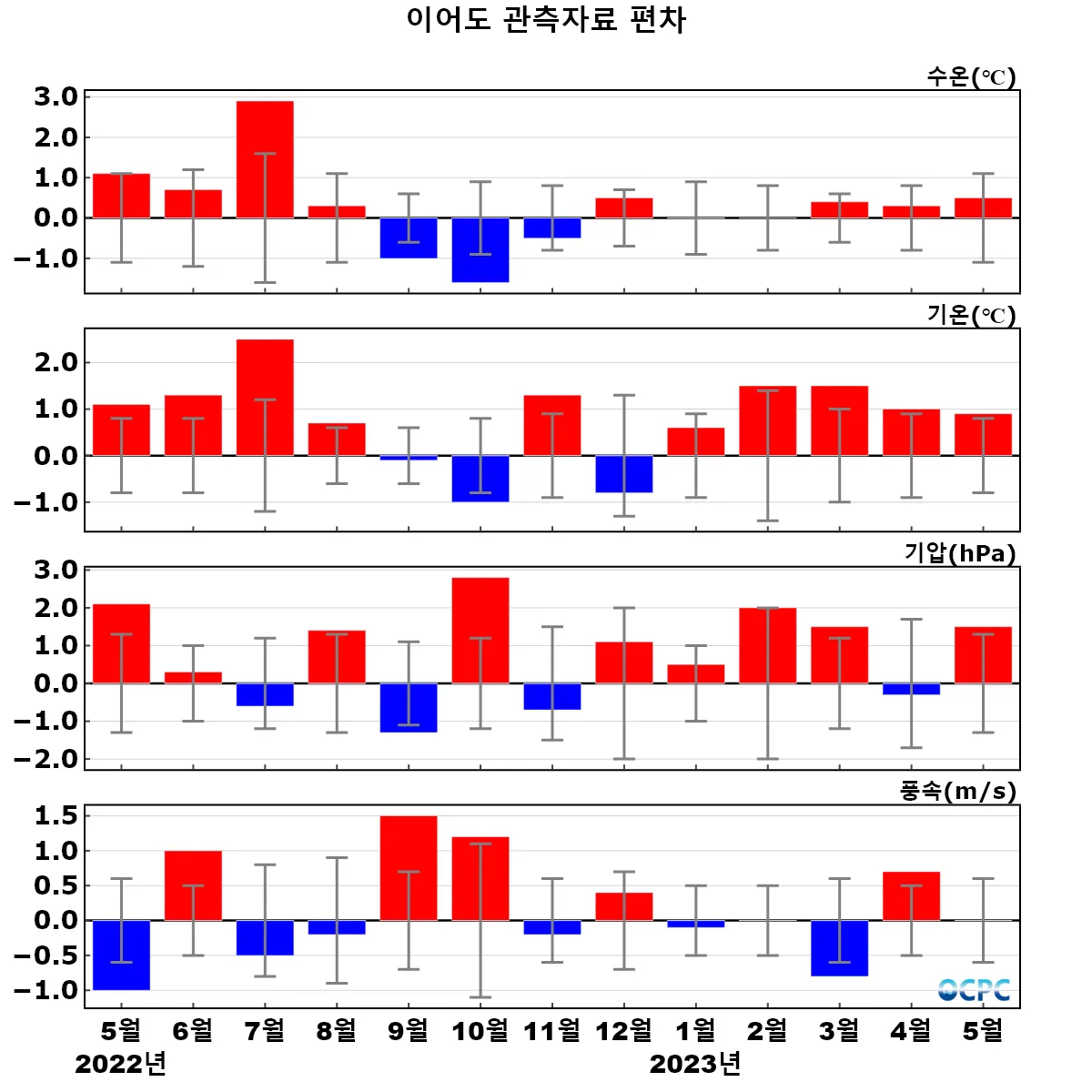 관측기간(2004~2023년) 월평균 대비 최근 13개월 편차 (세로 막대는 관측기간 중 월별 표준편차 구간) (수온은 수심 3m, 기온은 해상 42.1m, 기압은 해상 35.9m 값이며, 풍속은 해상 42.9m 관측값을 해상 10m 값으로 환산하였음)