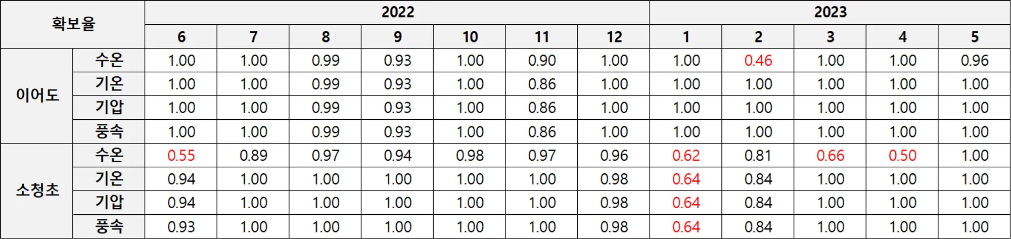 해양과학기지 관측요소별 관측자료 월별 확보율(2022-2023). 최대가 1.0이며 붉은색은 월 확보율 0.8(수온은 0.7) 미만인 자료로 분석에서 제외