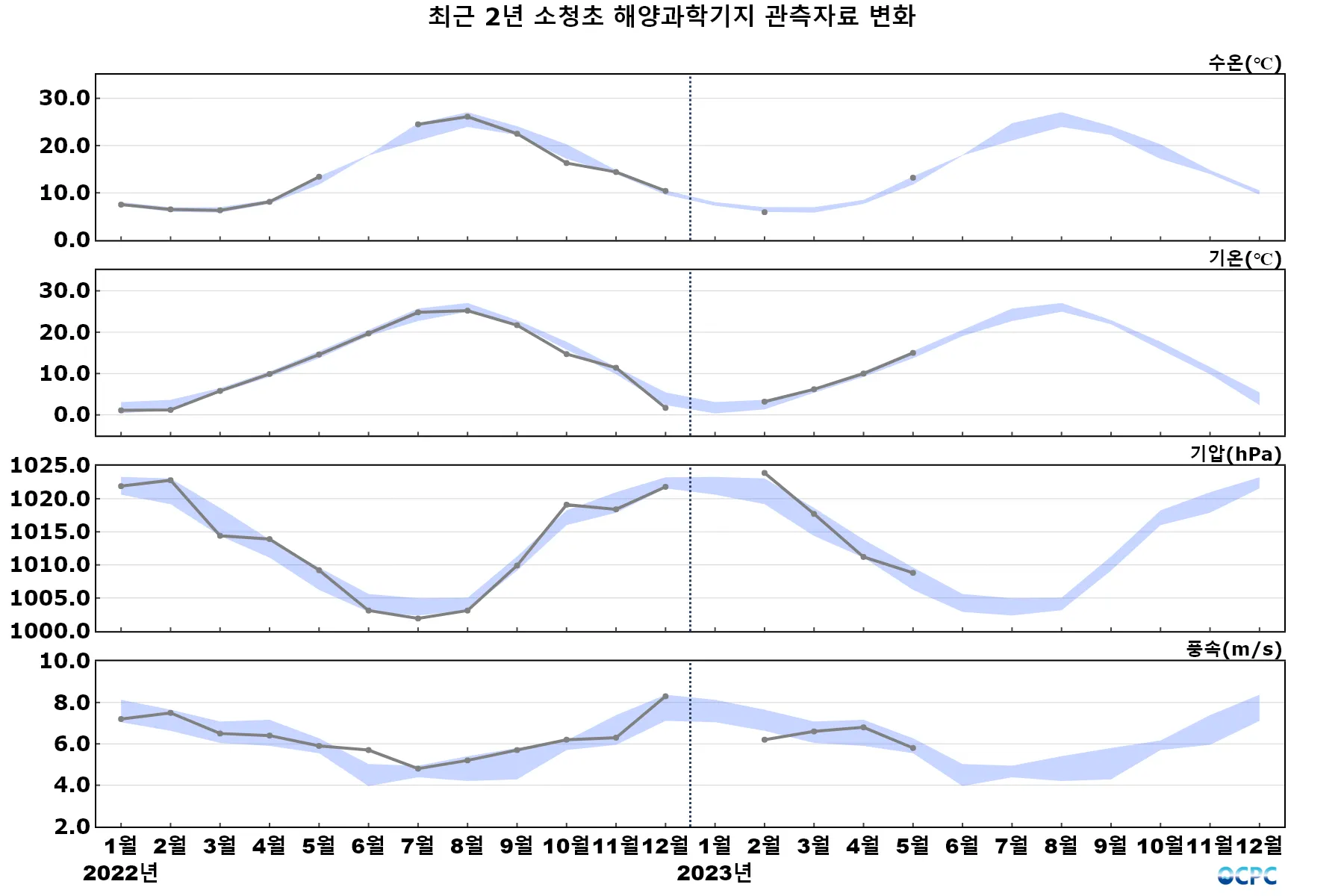 ※ 본 ‘해양과학기지 자료 분석 (2023년 5월)’은 분석은 국립해양조사원에서 제공하는 해양과학기지 관측자료를 사용하였음