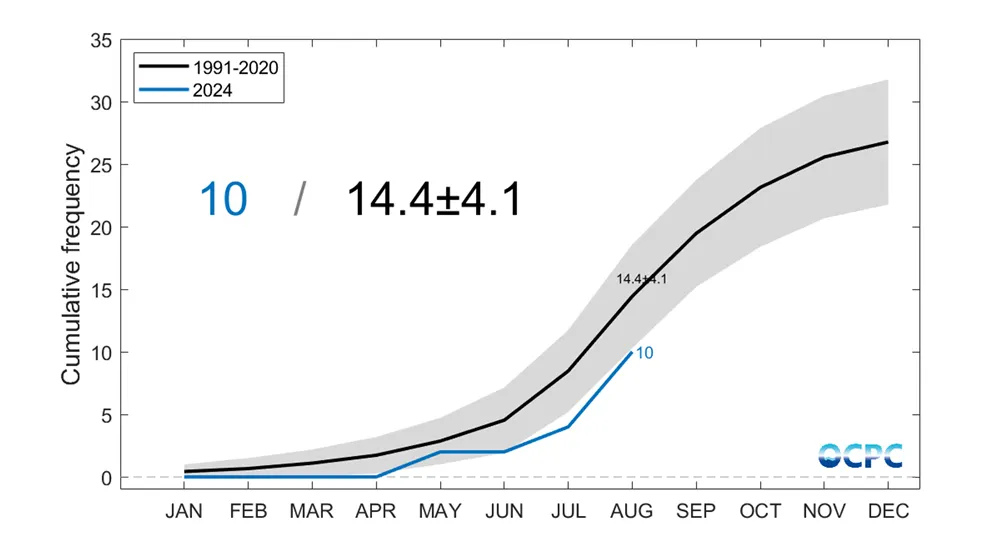 누적 발생수는 총 10개로 평년(약 10.3~18.5개) 보다 적습니다.