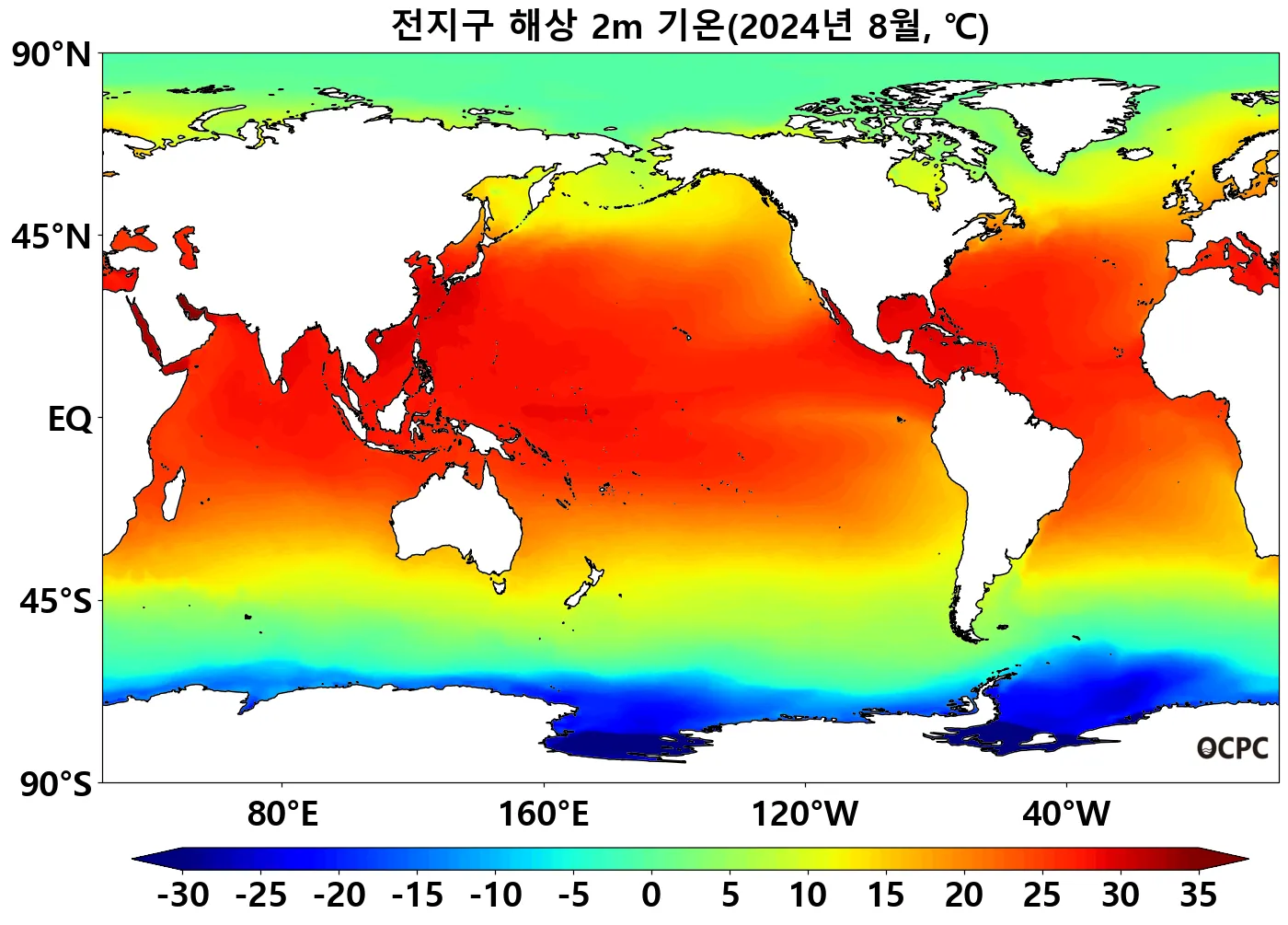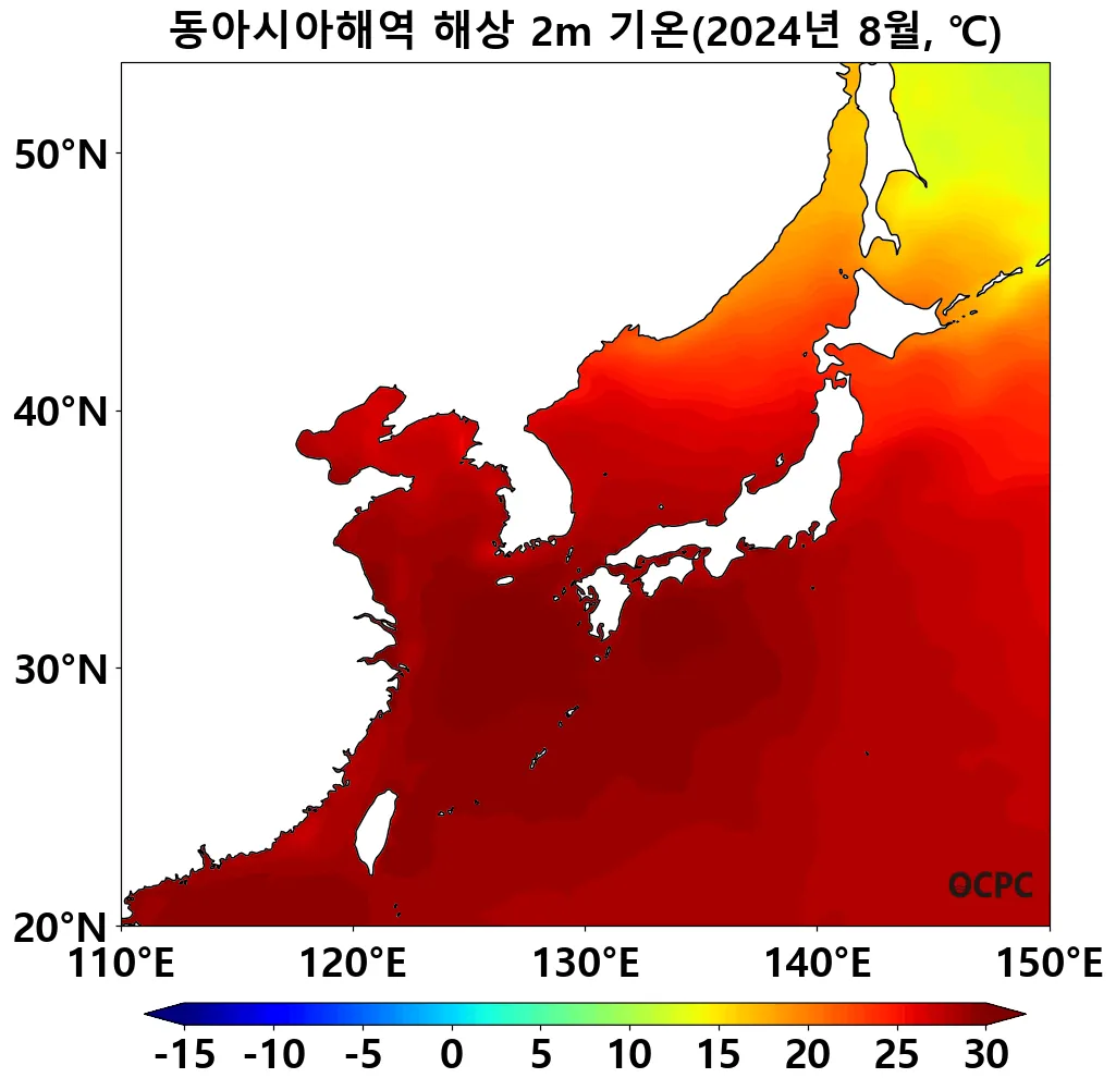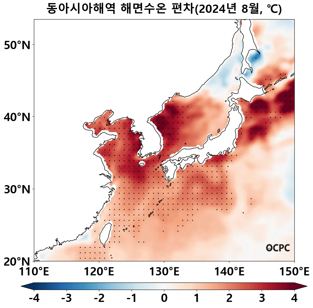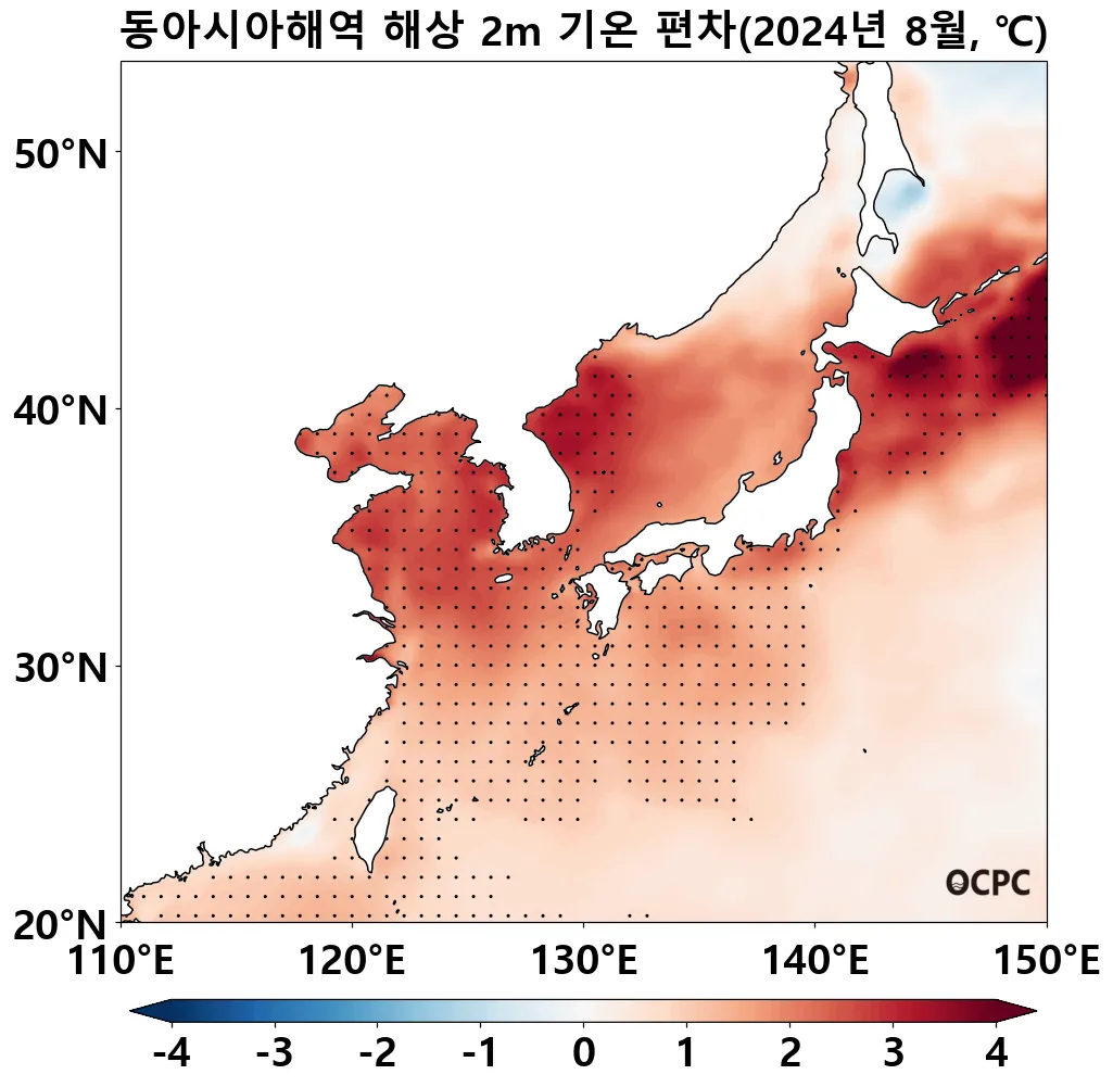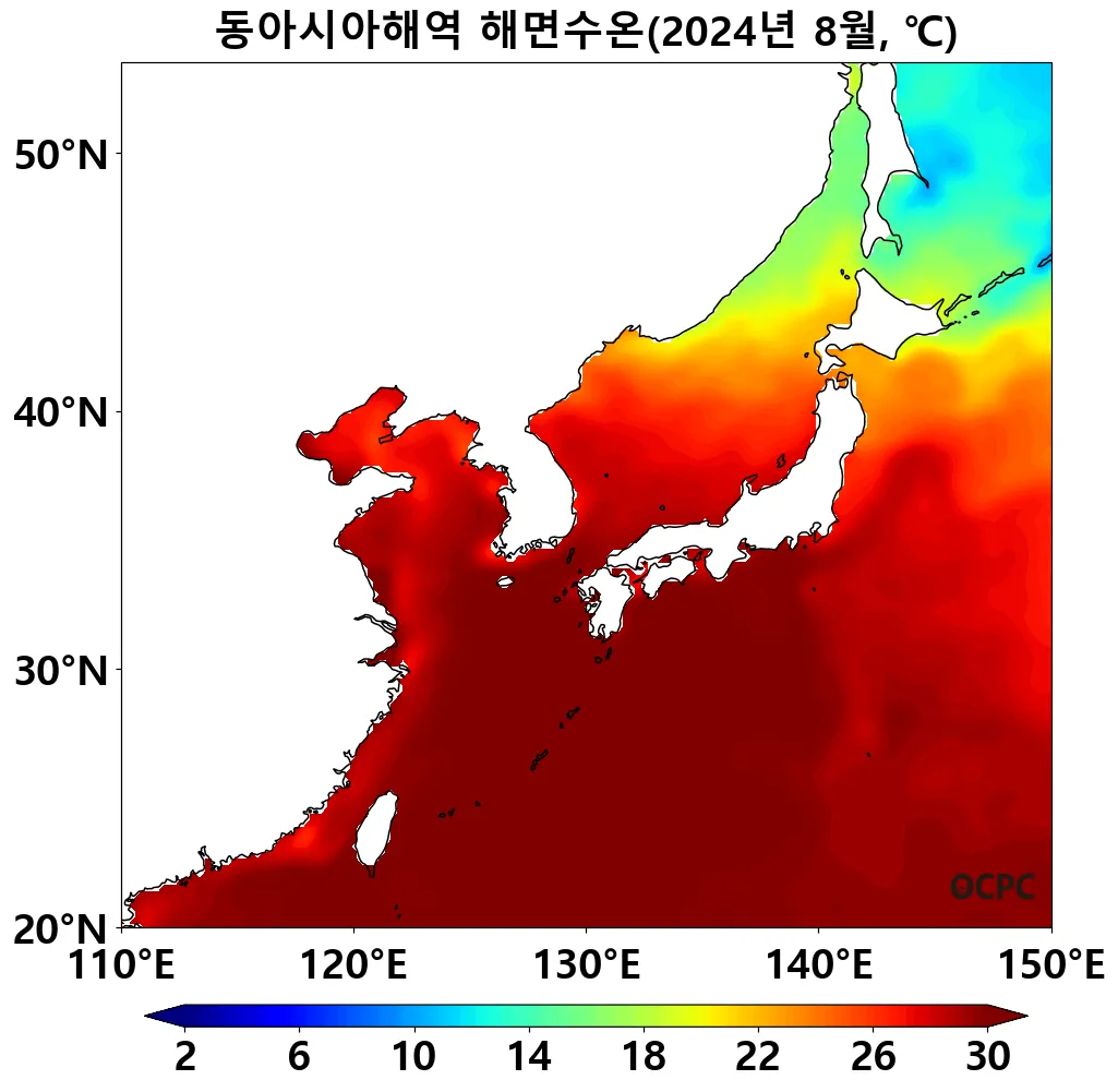 동해, 황해, 동중국해의 해상기온은 평년(22.6±0.6°C, 25.6±0.4°C, 27.8±0.2°C)보다 각각 1.8°C, 2.5°C, 1.6°C 높았으며, 황해 및 동중국해의 해상기온은 1994~2024년(8월) 중 가장 높았습니다.