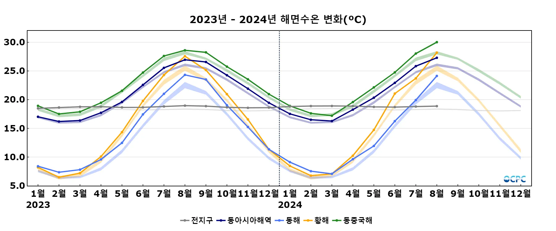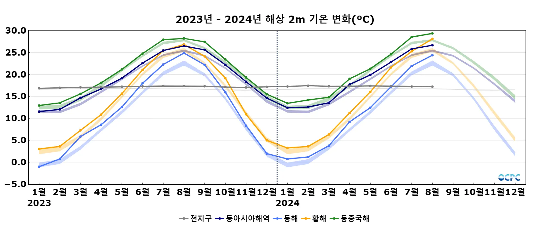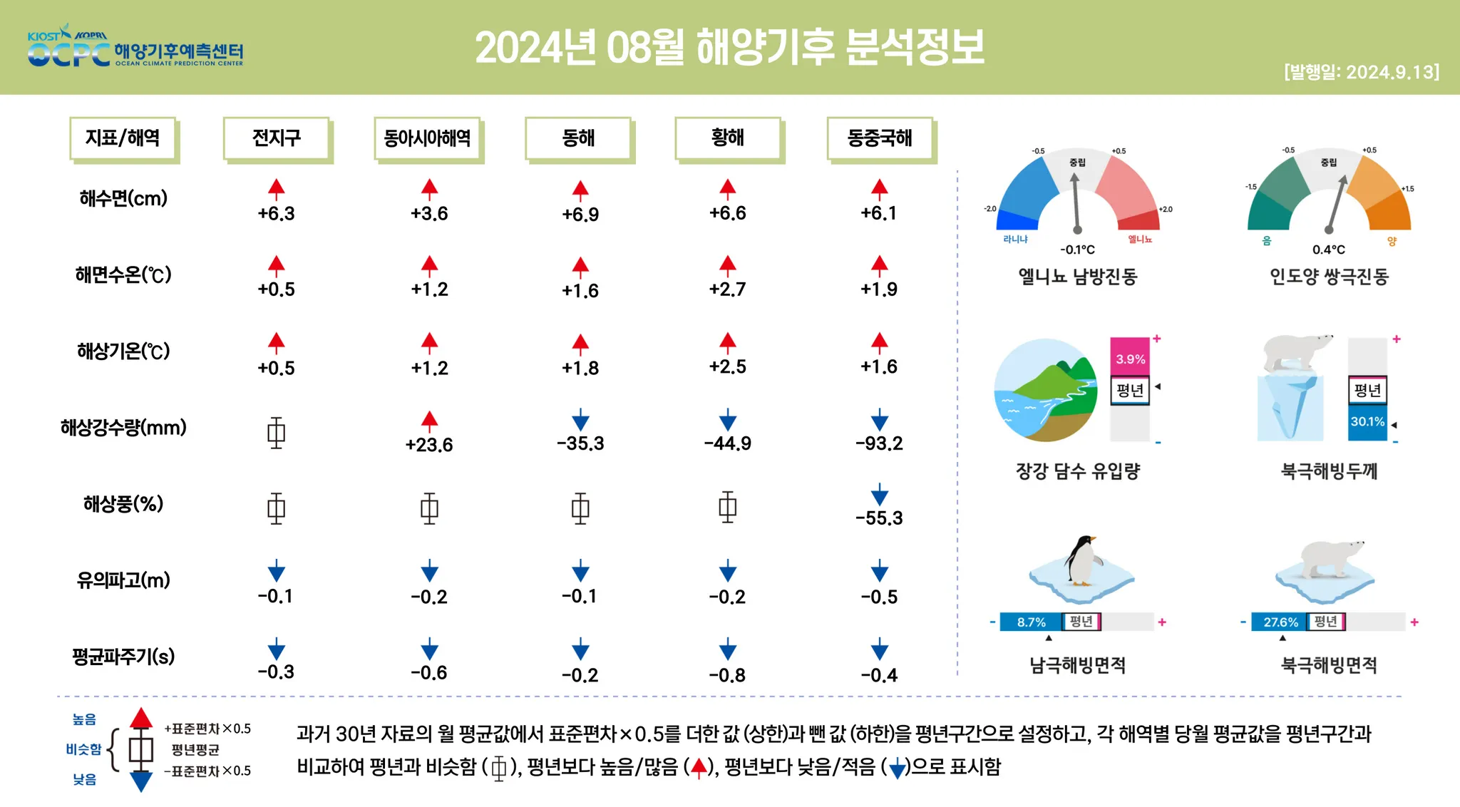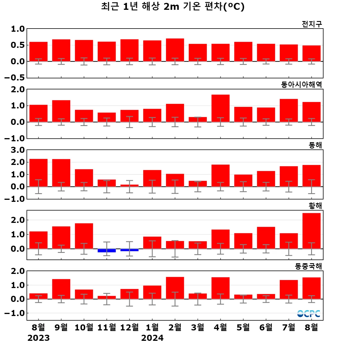 동해, 황해, 동중국해의 해상기온은 평년(22.6±0.6°C, 25.6±0.4°C, 27.8±0.2°C)보다 각각 1.8°C, 2.5°C, 1.6°C 높았으며, 황해 및 동중국해의 해상기온은 1994~2024년(8월) 중 가장 높았습니다.