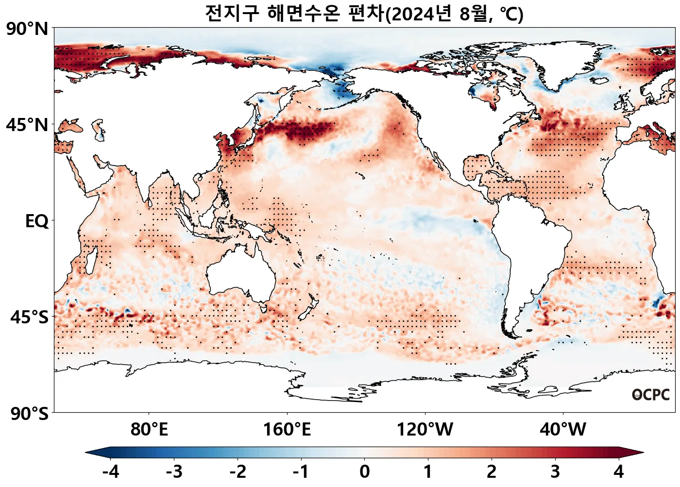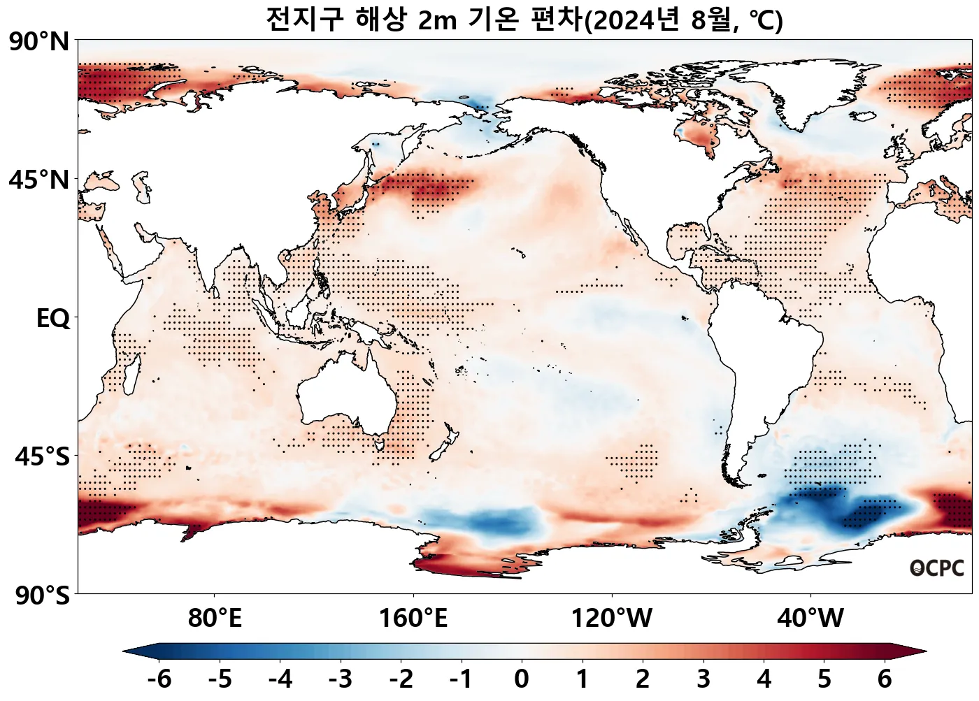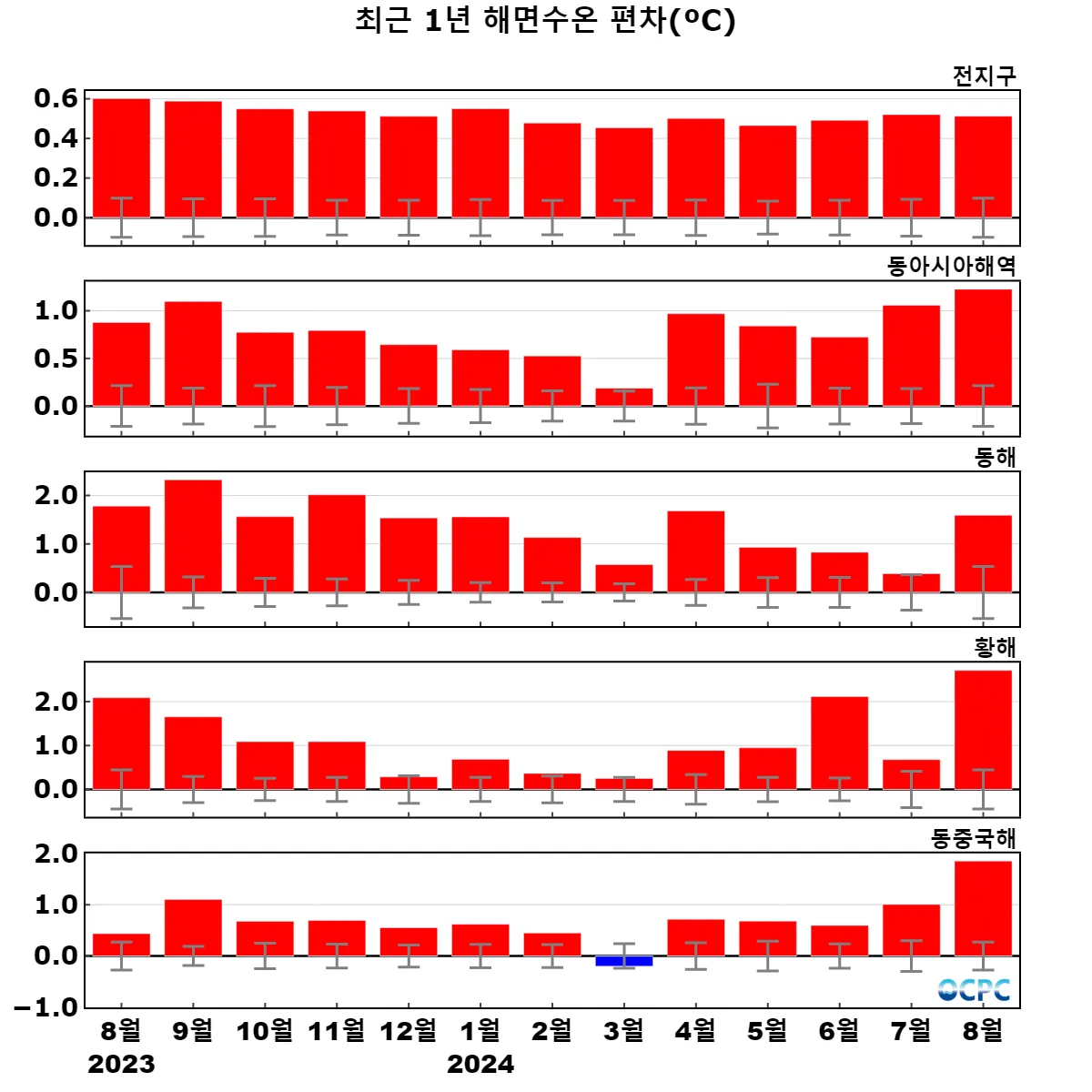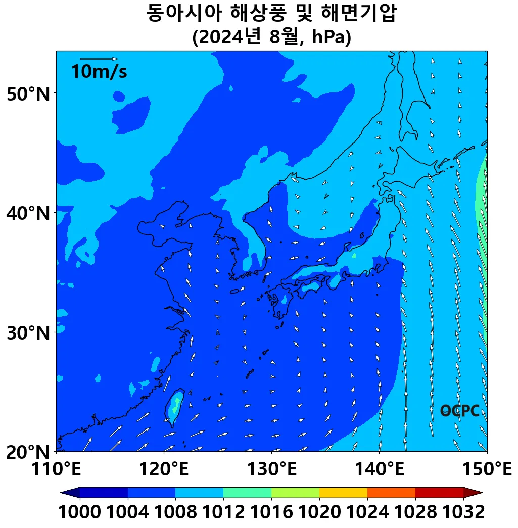 동해, 황해, 동중국해의 해상기온은 평년(22.6±0.6°C, 25.6±0.4°C, 27.8±0.2°C)보다 각각 1.8°C, 2.5°C, 1.6°C 높았으며, 황해 및 동중국해의 해상기온은 1994~2024년(8월) 중 가장 높았습니다.