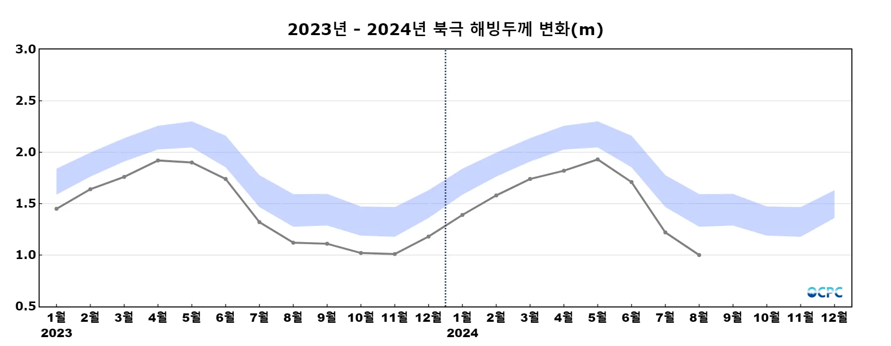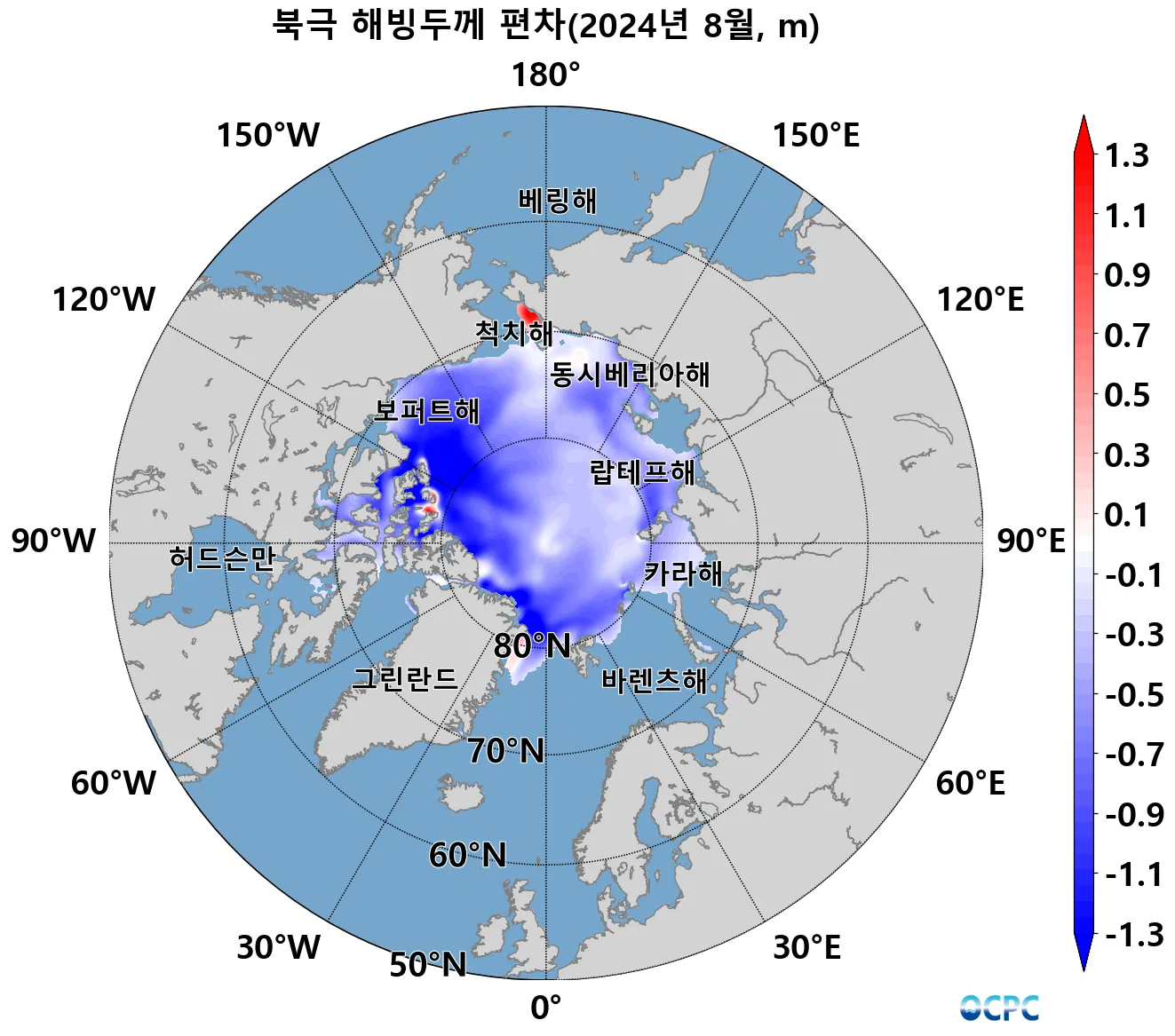[북극해] 해빙면적(-30.1%), 해빙두께(-27.6%)는 평년보다 감소했습니다.