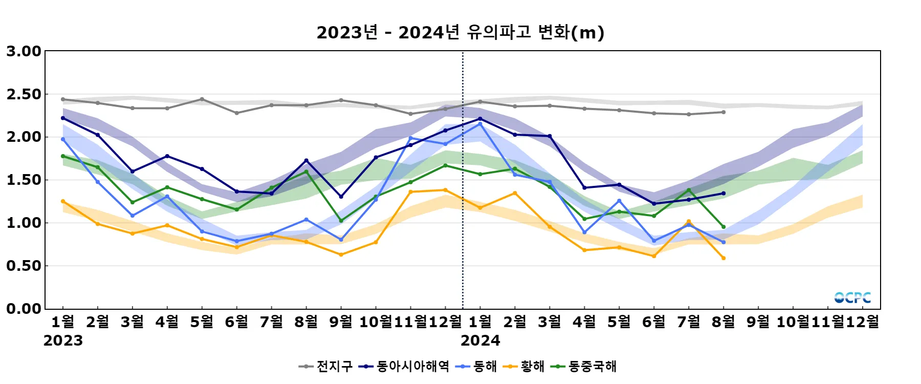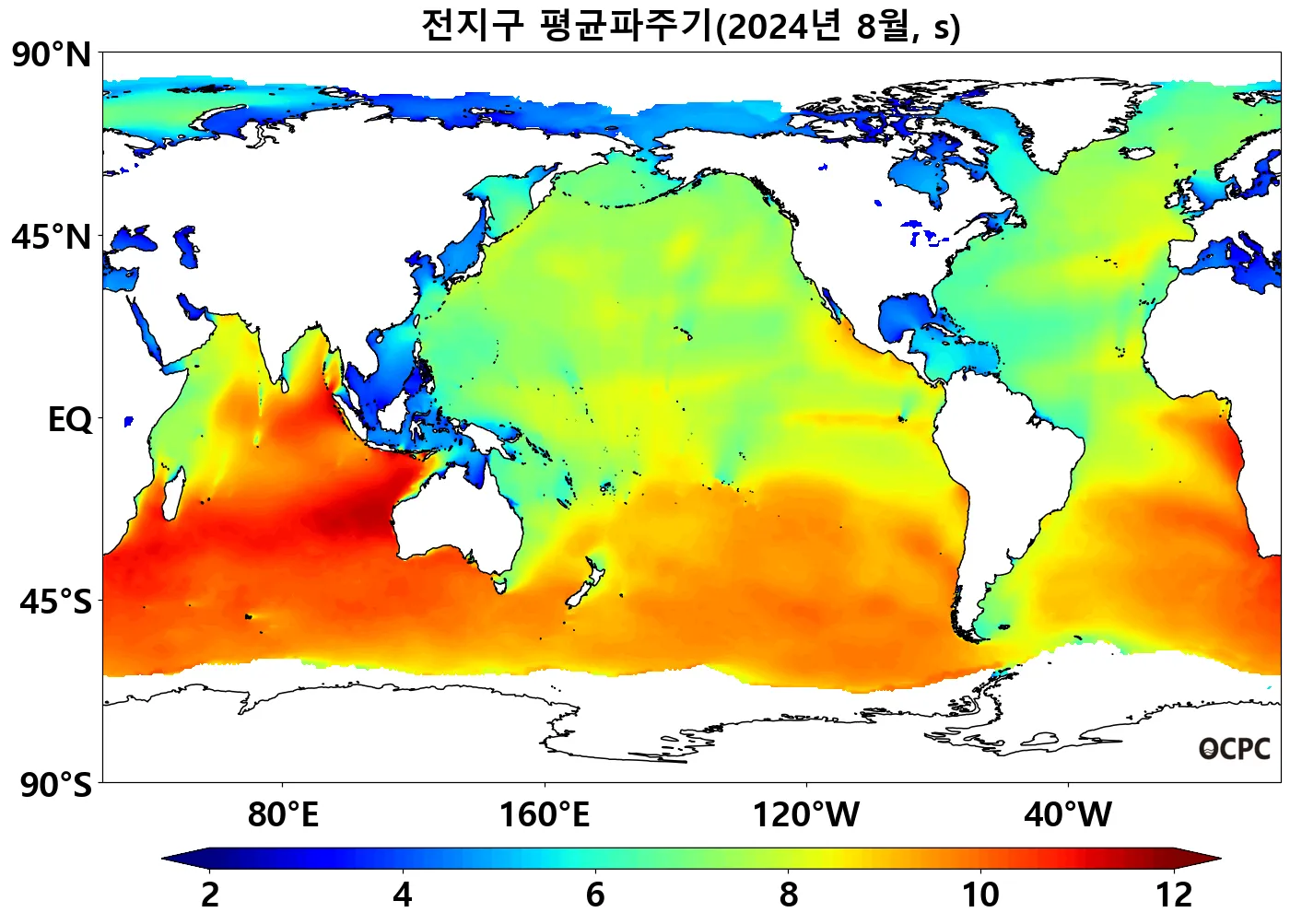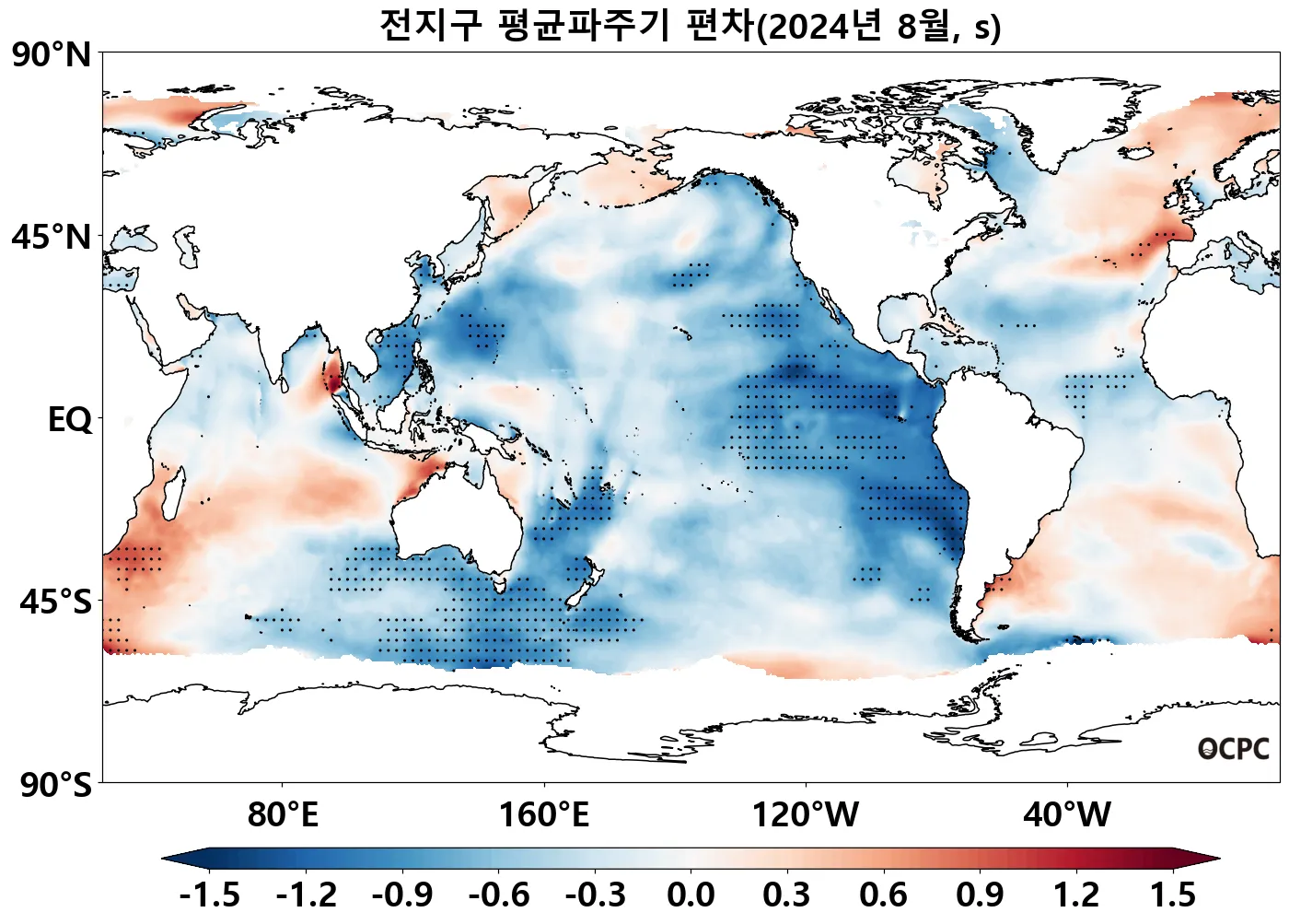 황해의 평균파주기는 평년(4.94±0.16초)보다 0.76초 감소했으며, 1994~2024년(8월) 중 가장 낮았습니다.