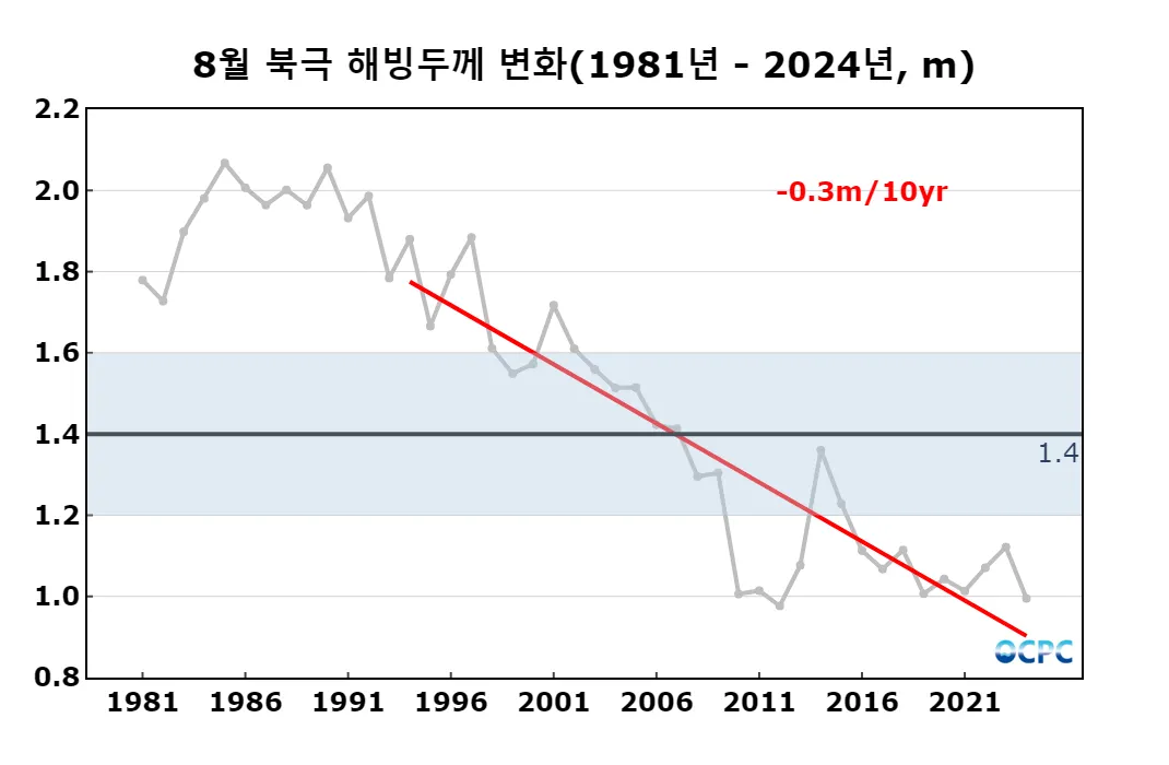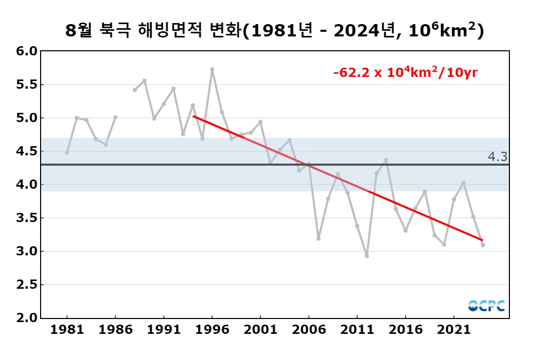 1994~2024년 동안 8월 북극 해빙면적은 10년에 62만km²씩 감소하는 추세입니다.