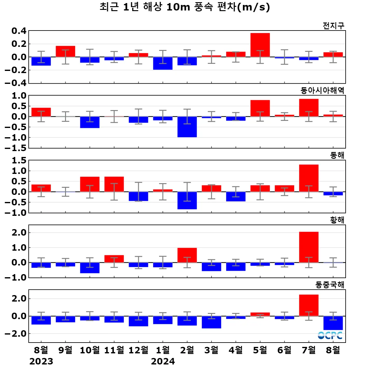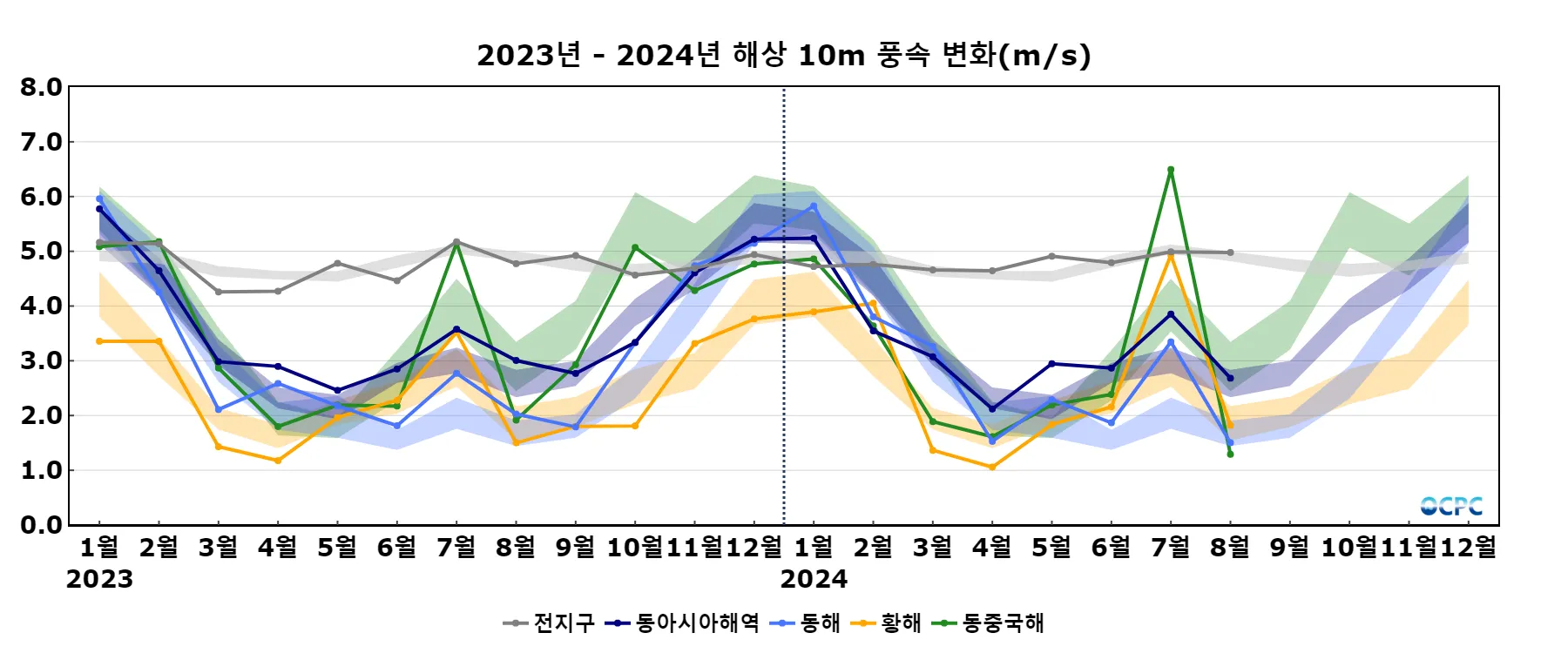 동해, 황해의 해상풍속은 평년(1.7±0.2m/s, 1.9±0.3m/s)과 비슷했으며, 동중국해의 해상풍속은 평년(2.9±0.5m/s)보다 1.6m/s 약했습니다.