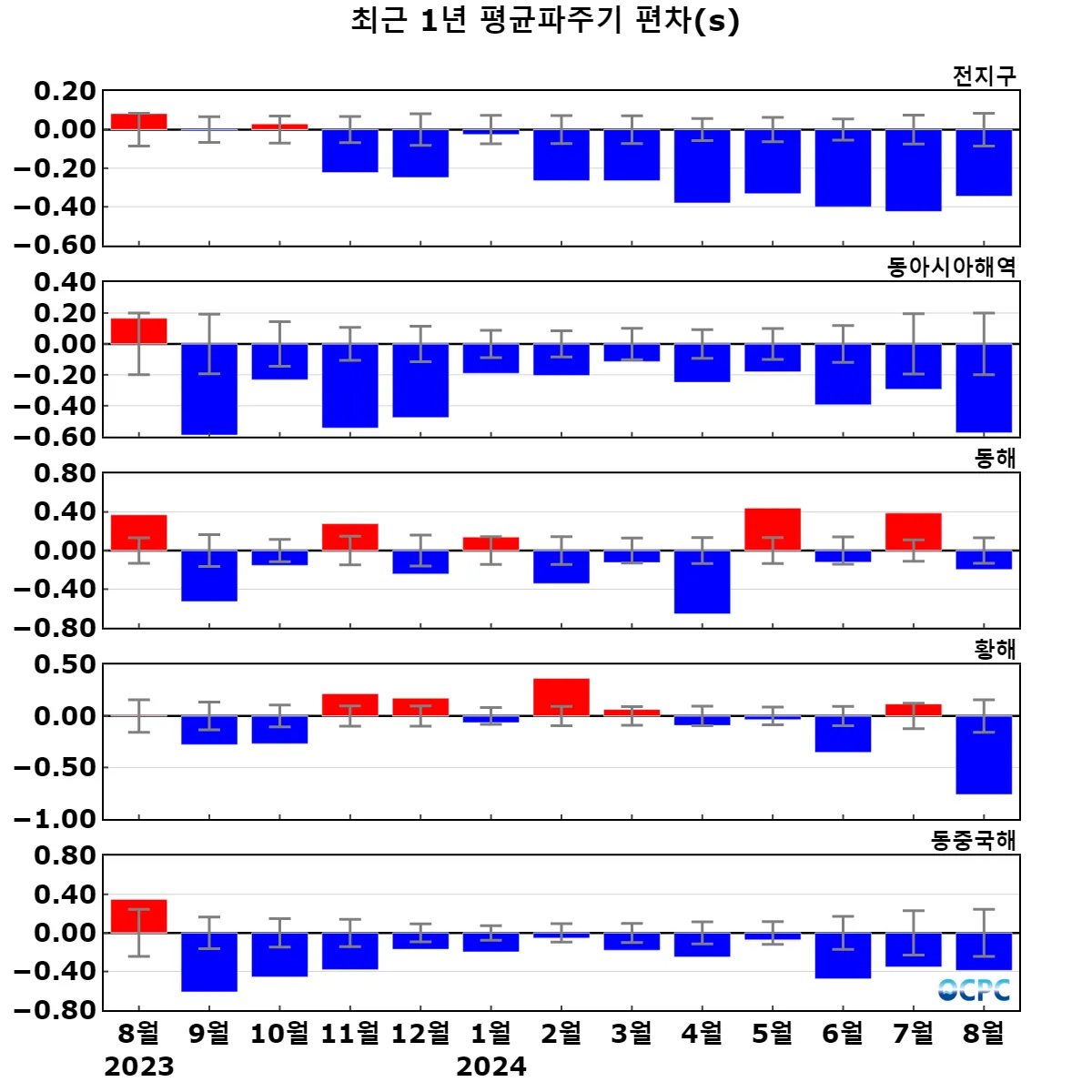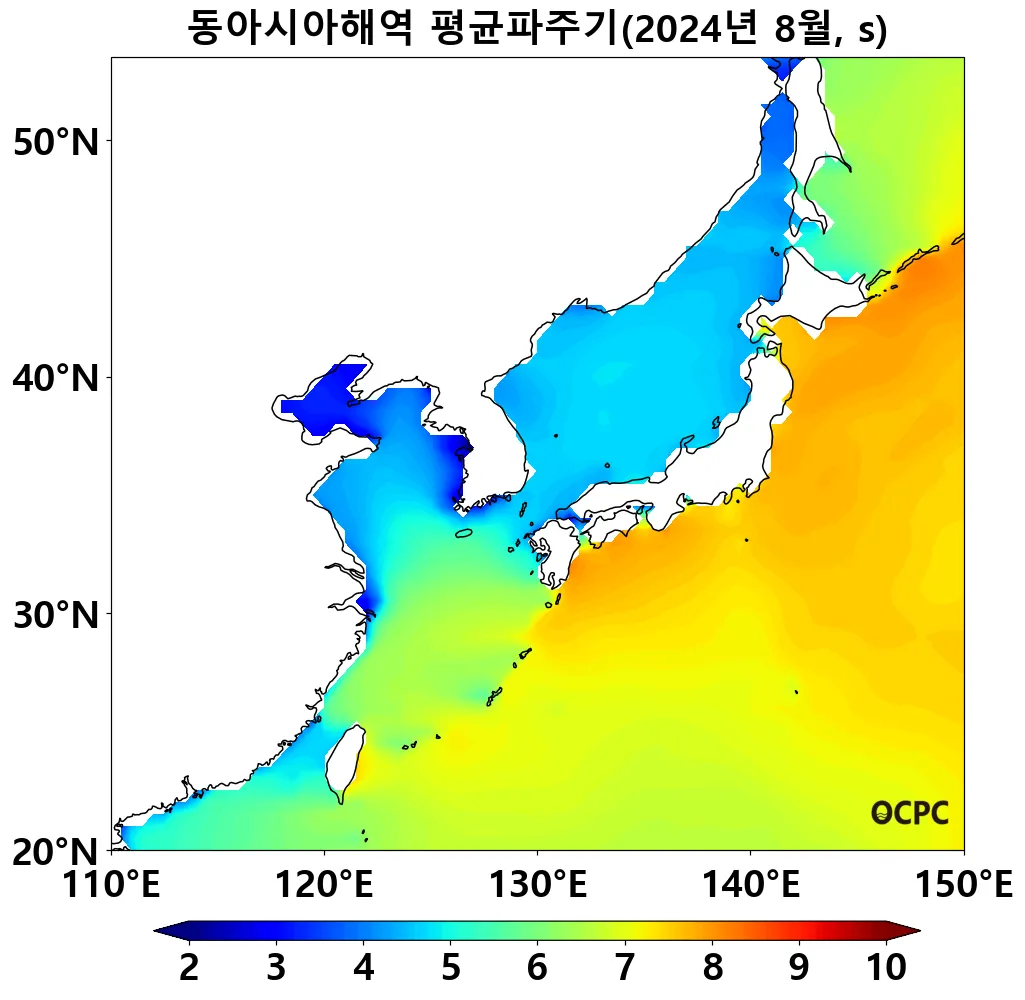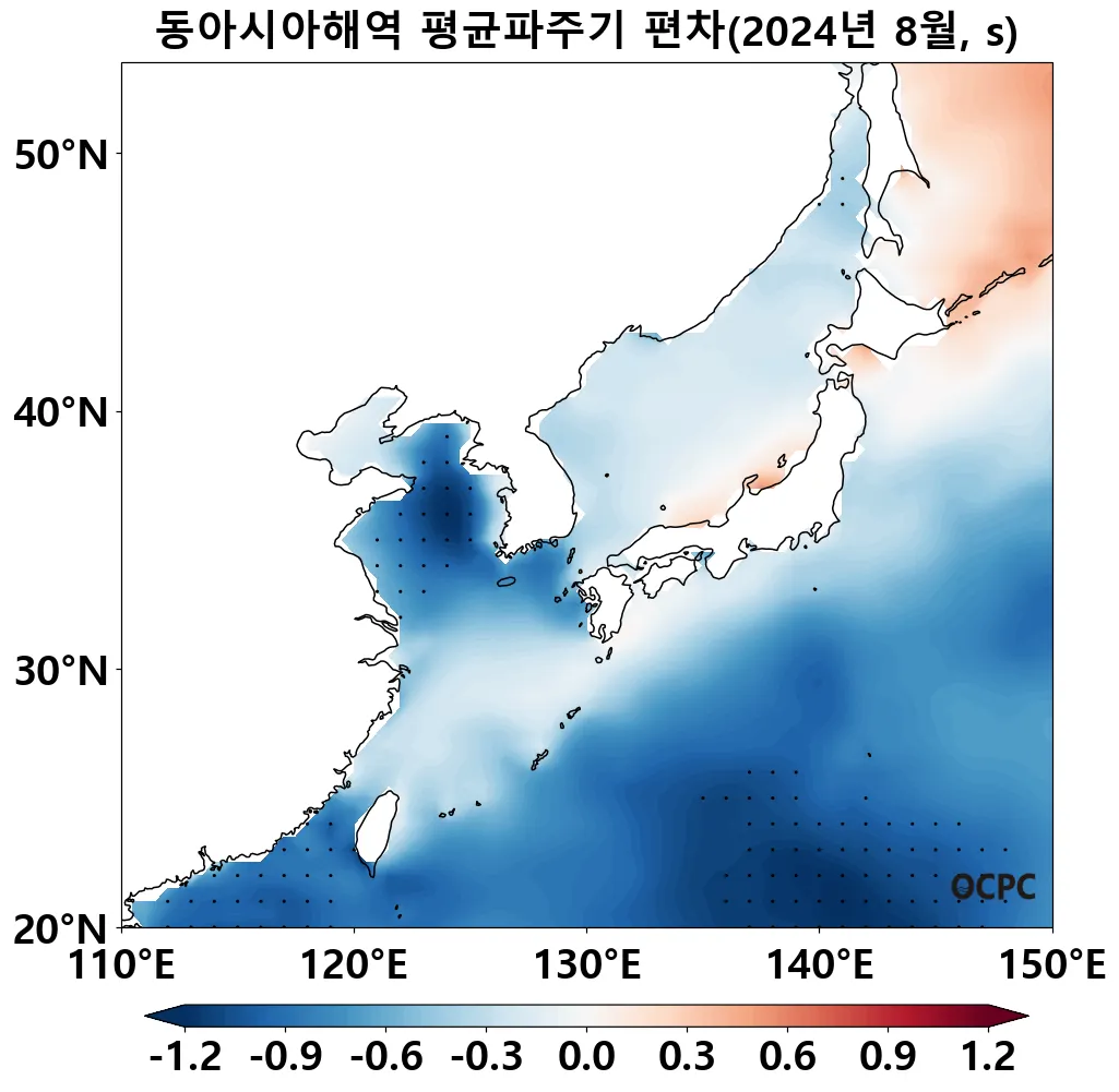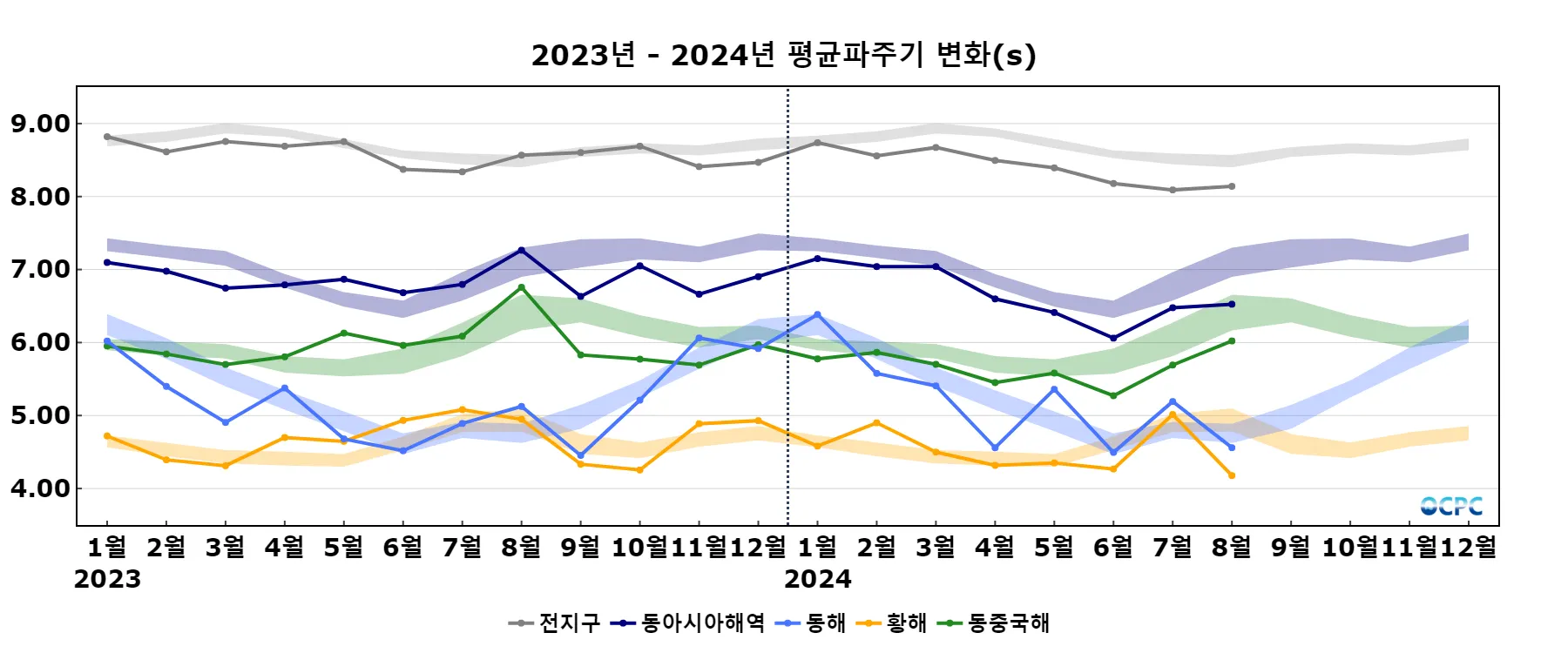 동해, 동중국해의 평균파주기는 평년(4.76±0.13초, 6.41±0.24초)보다 각각 0.20초, 0.39초씩 감소했습니다.