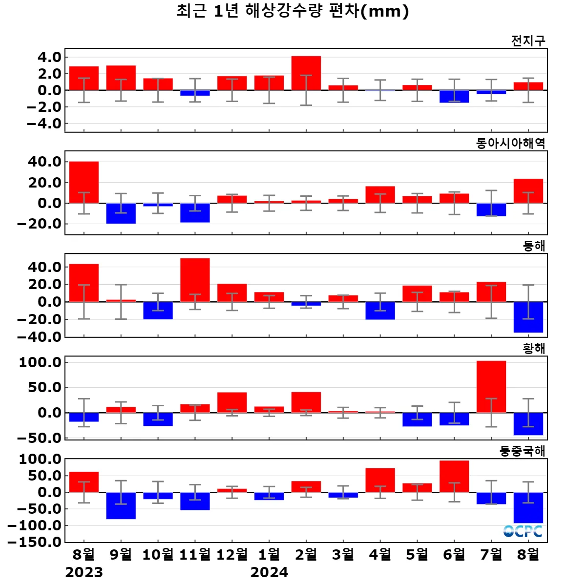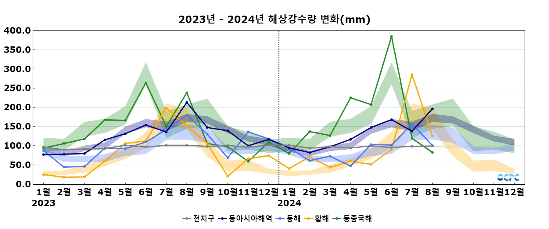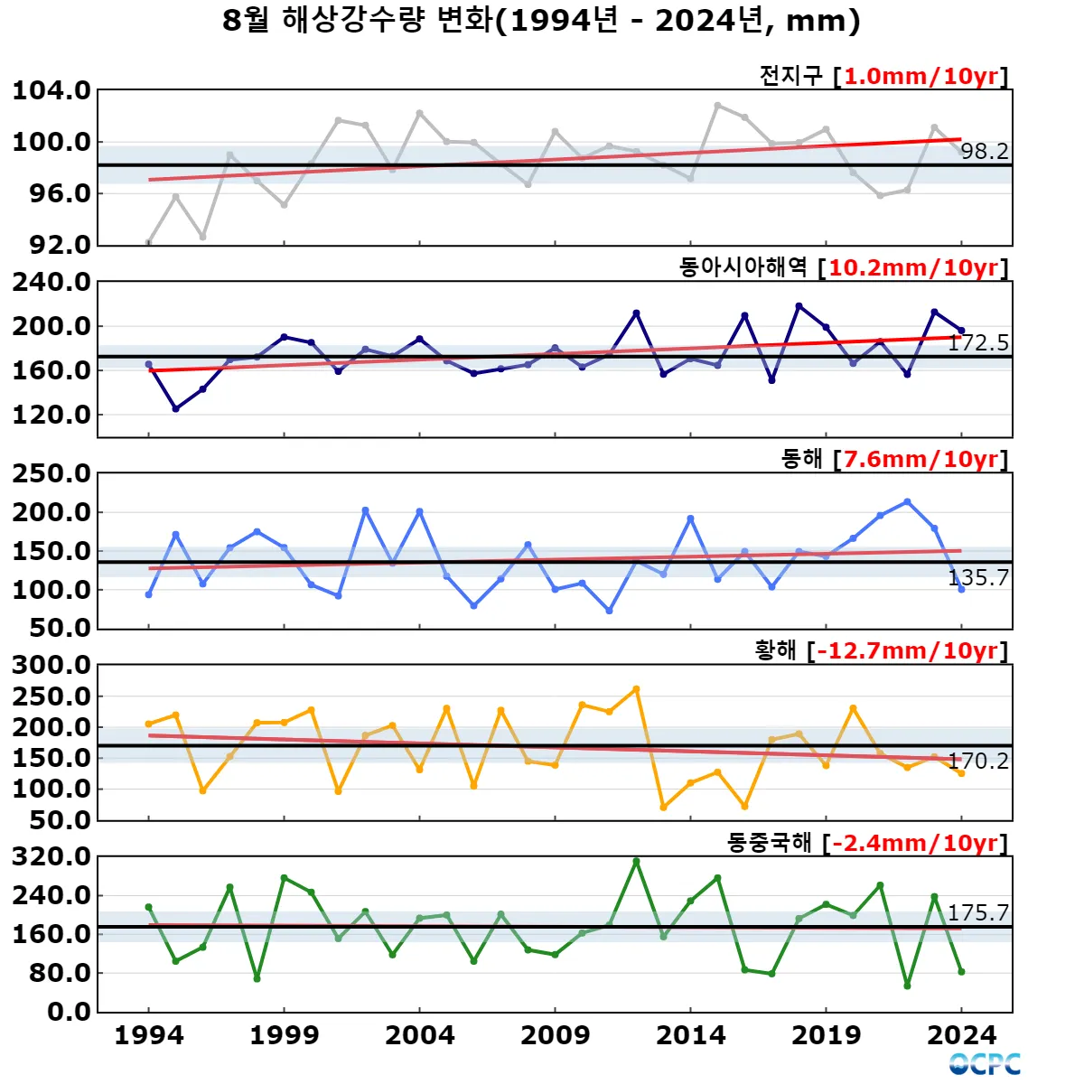 1994~2024년 동안 전지구 8월 해상강수량은 10년에 1.0mm씩 증가하는 추세입니다. 동아시아해역 및 동해는 10년에 7.6~10.2mm씩 증가하고, 황해 및 동중국해는 10년에 2.4~12.7mm씩 감소하는 추세입니다.