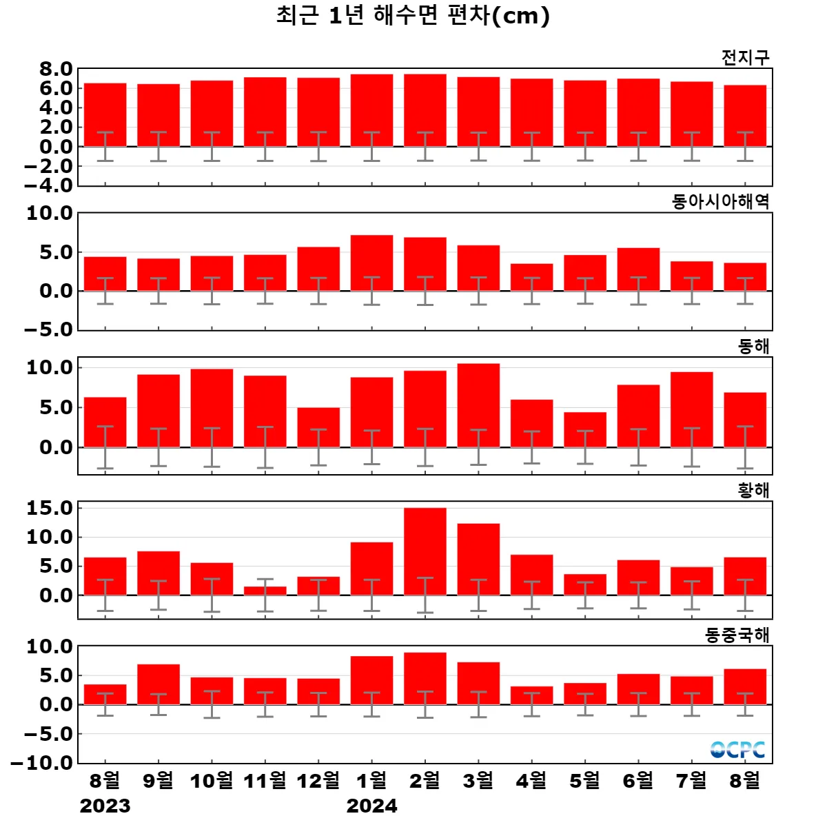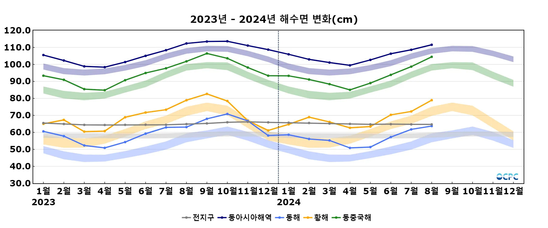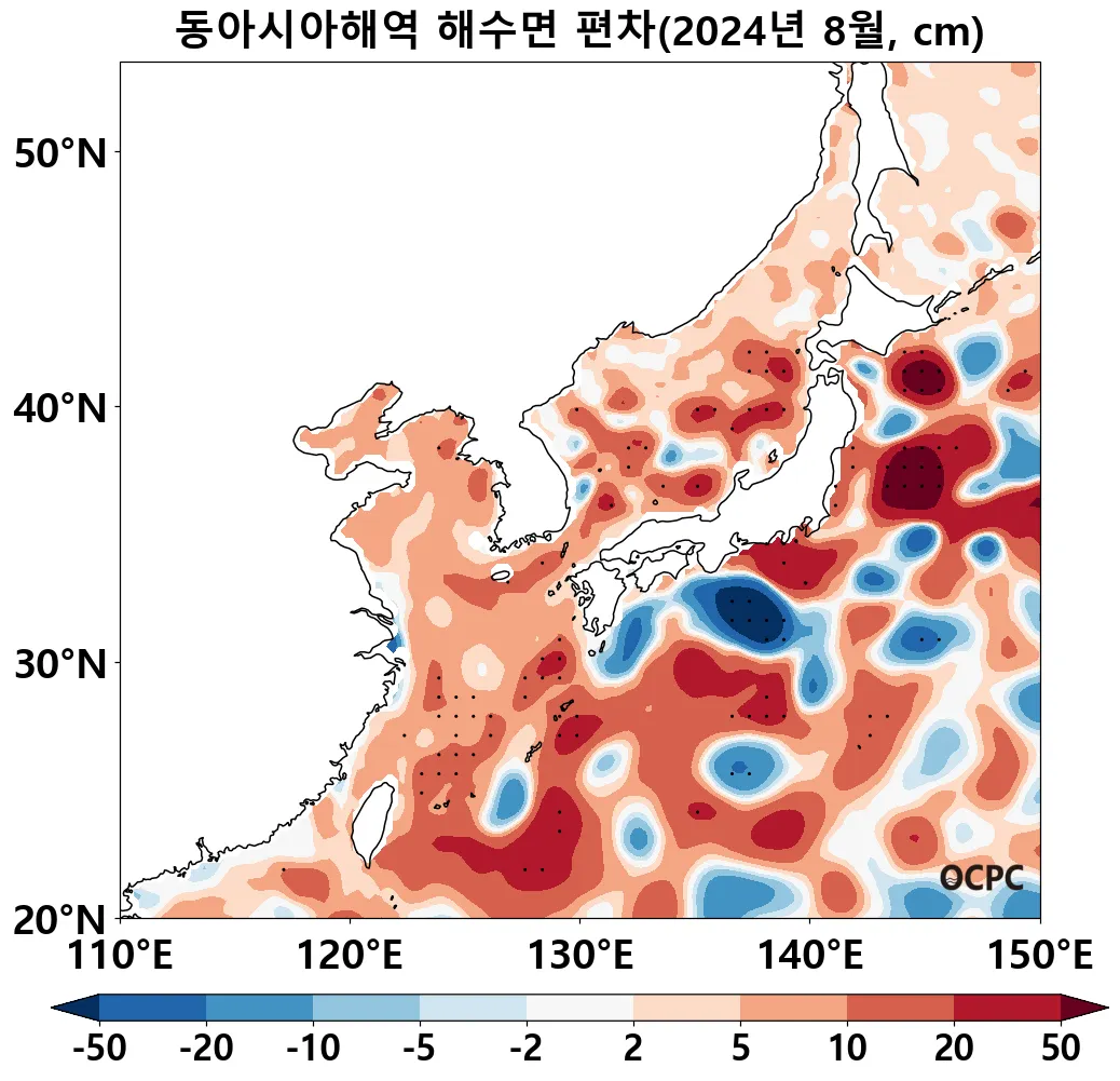 동해, 황해, 동중국해의 해수면은 평년(56.8±2.6cm, 72.4±2.7cm, 98.3±1.9cm)보다 각각 6.9cm, 6.6cm, 6.1cm 높으며, 동중국해의 해수면은 1994~2024년(8월) 중 가장 높았습니다.