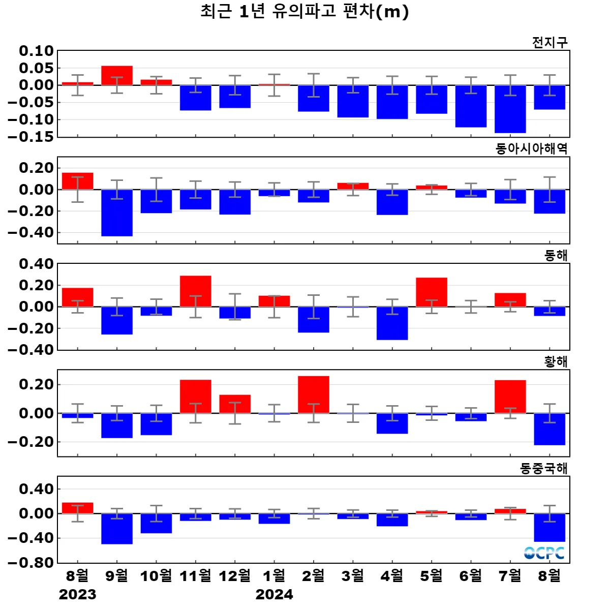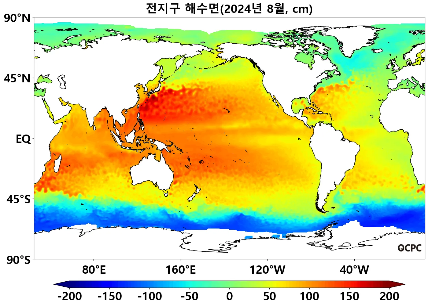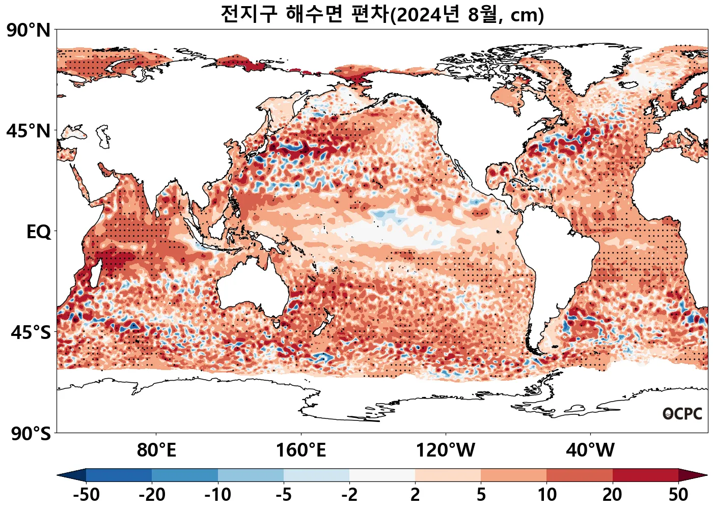 동해, 황해, 동중국해의 해수면은 평년(56.8±2.6cm, 72.4±2.7cm, 98.3±1.9cm)보다 각각 6.9cm, 6.6cm, 6.1cm 높으며, 동중국해의 해수면은 1994~2024년(8월) 중 가장 높았습니다.