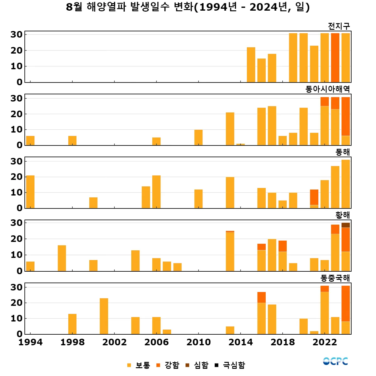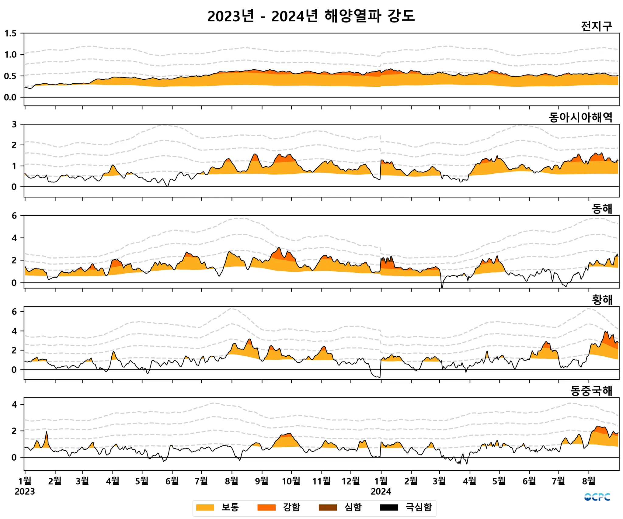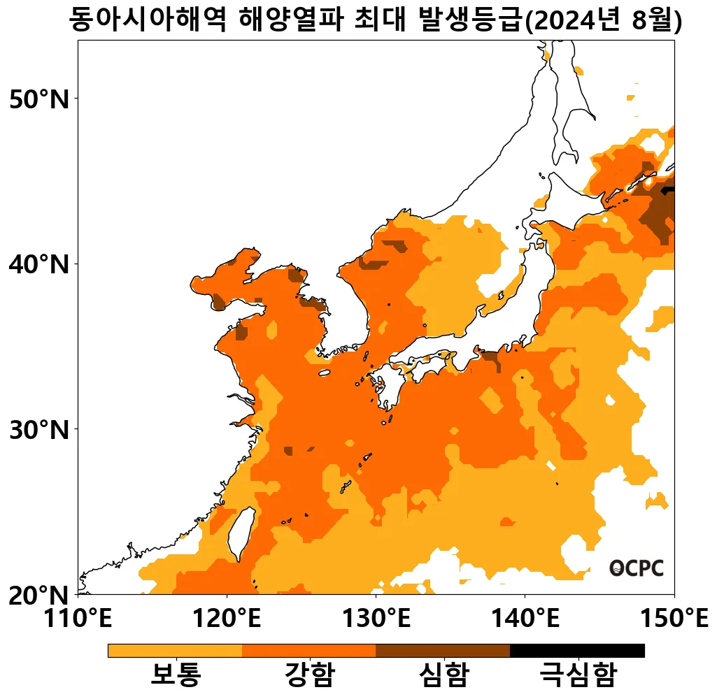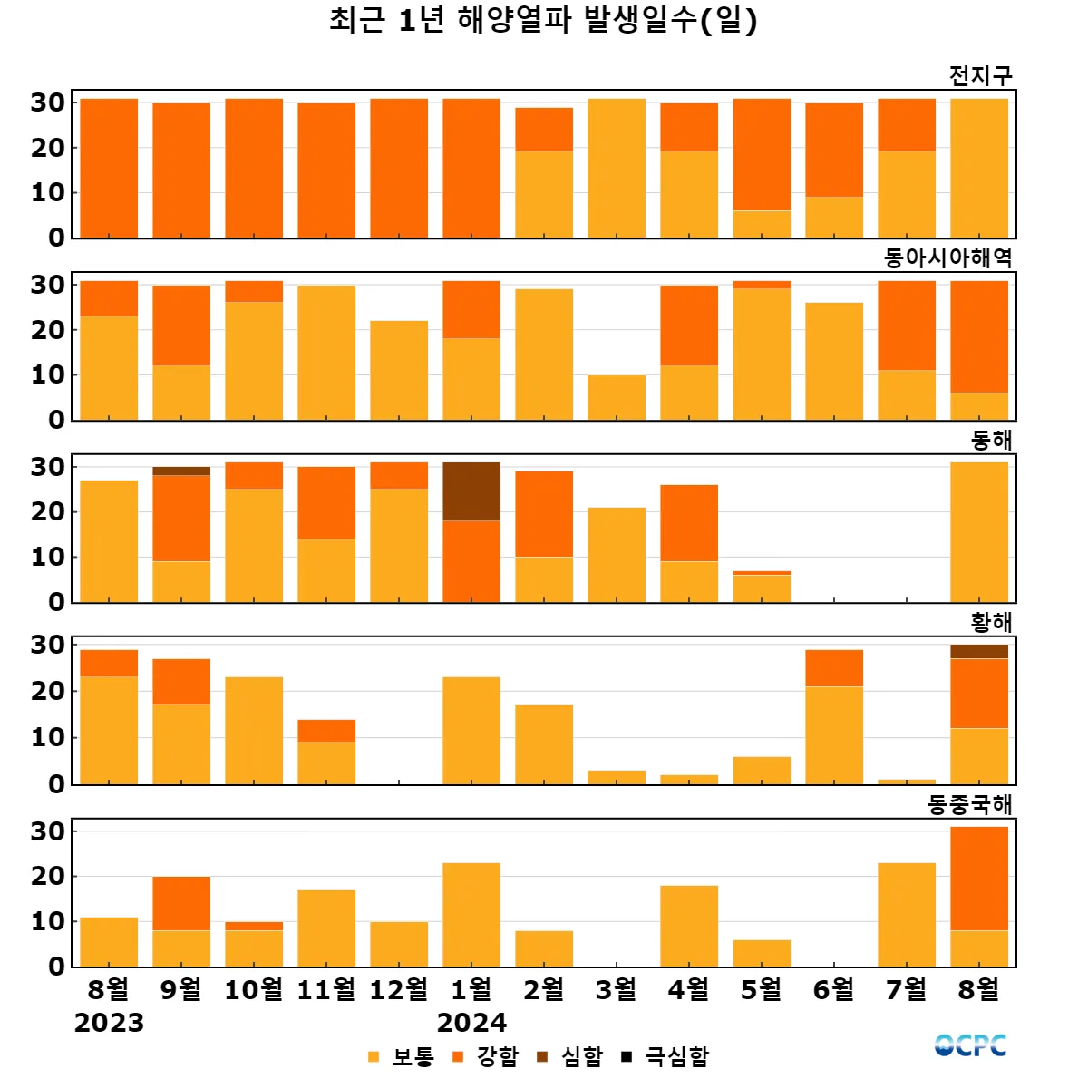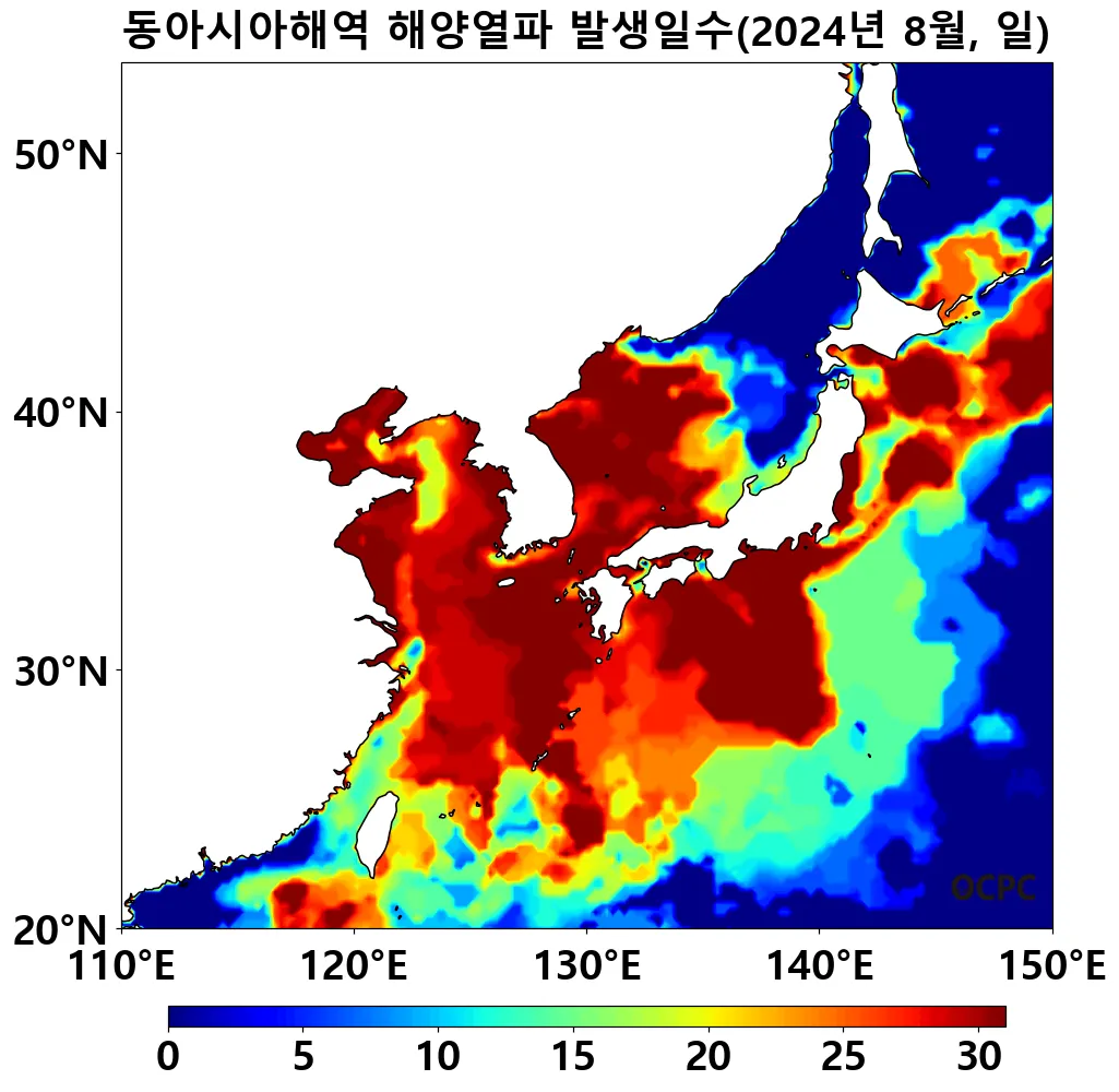 동해, 황해, 동중국해를 포함한 동아시아해역에서 해양열파가 발생하여 ‘보통’~’심함’ 등급으로 지속되었습니다.