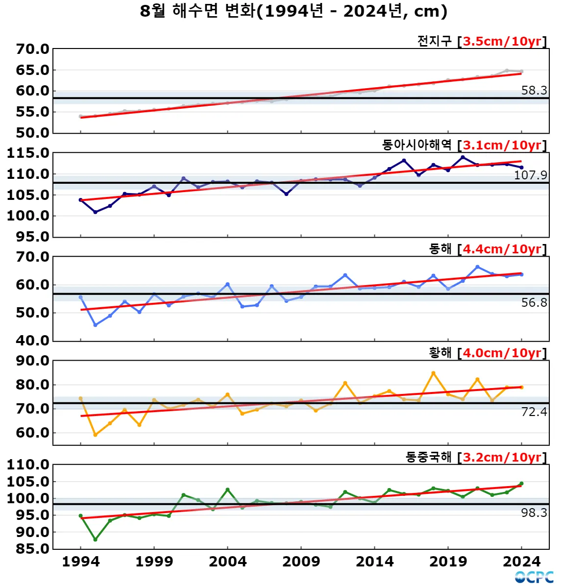 1994~2024년 동안 전지구 평균 8월 해수면은 10년에 3.5cm씩 상승하는 추세입니다. 동아시아해역은 10년에 3.1~4.4cm씩 상승하는 추세로 그 중 동해의 상승률이 가장 높습니다.