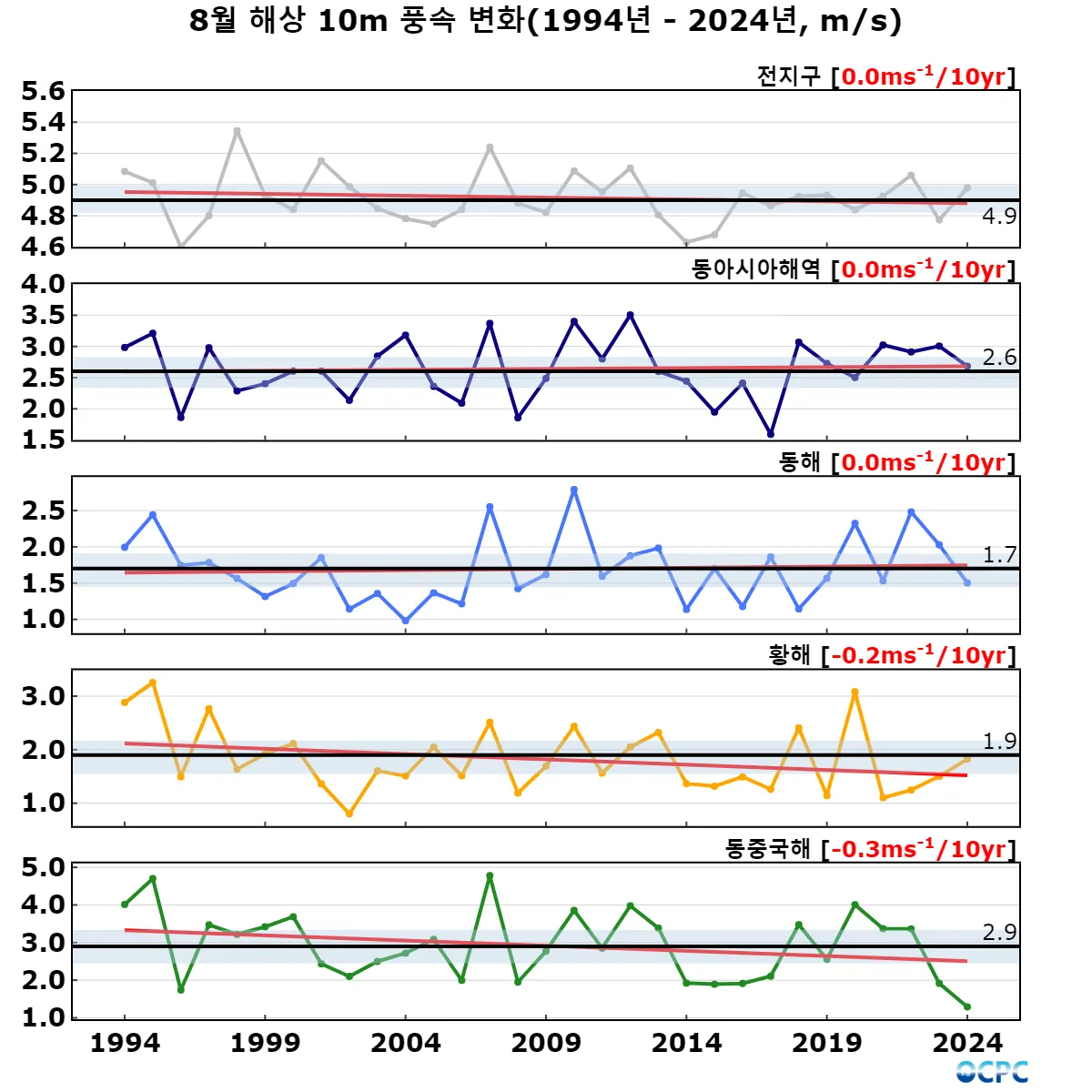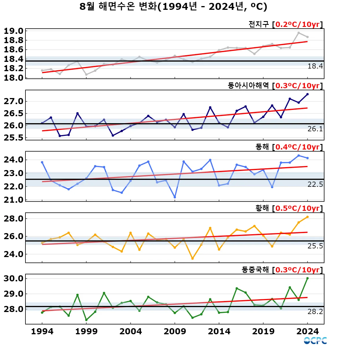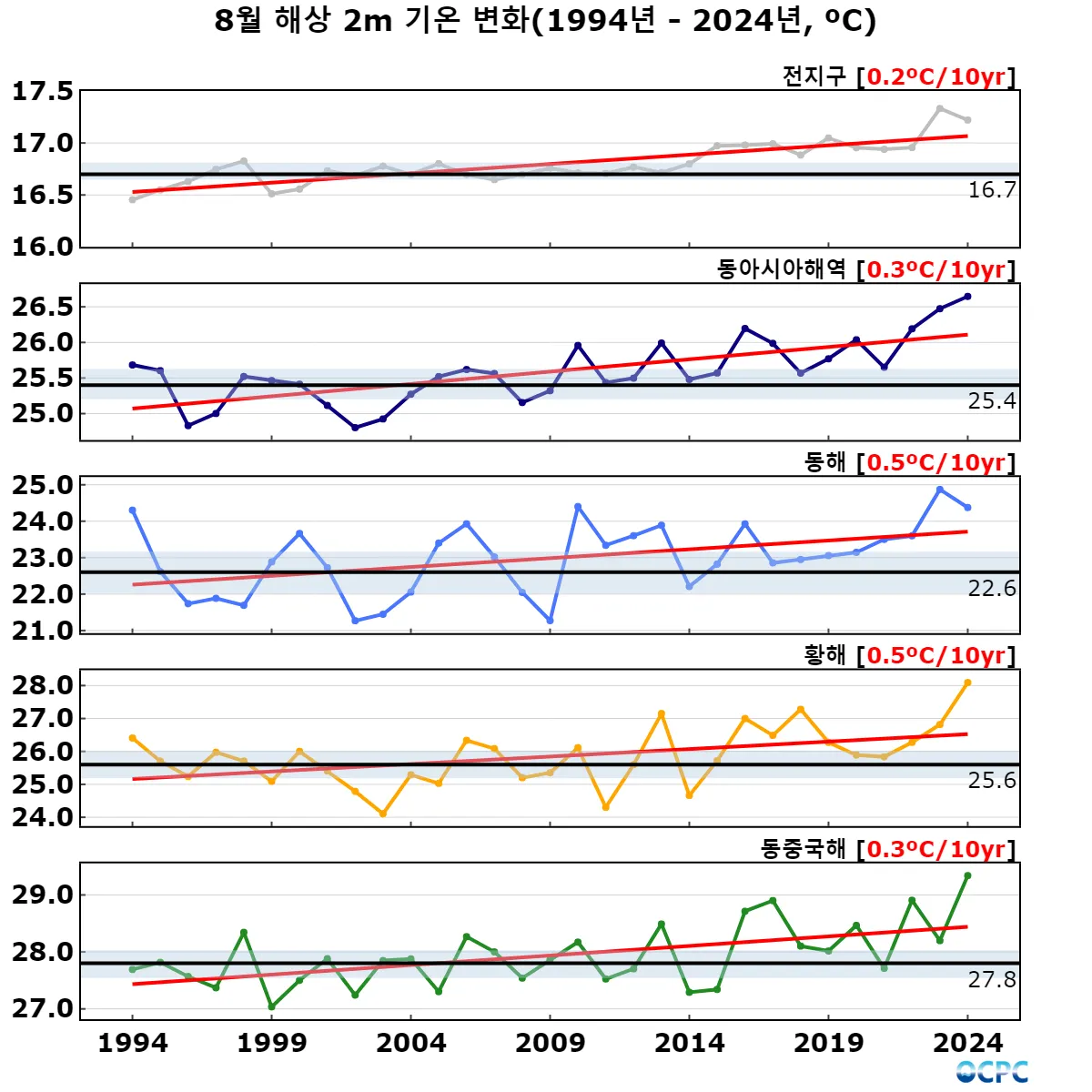 1994~2024년 동안 전지구 8월 해면수온은 10년에 0.2°C씩 증가하는 추세입니다. 동아시아해역의 추세는 10년에 0.3~0.5°C로 그 중 황해의 상승률이 가장 높습니다.