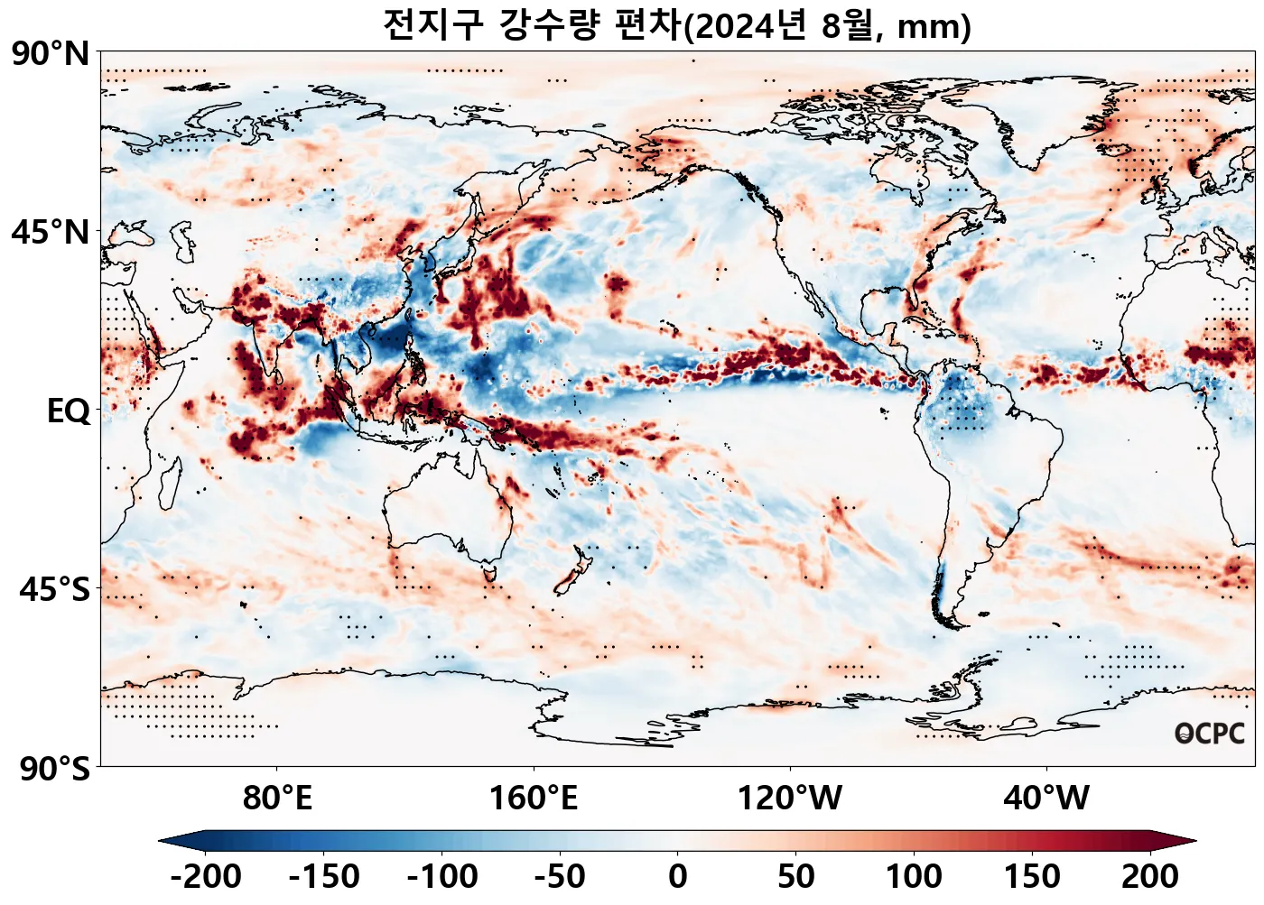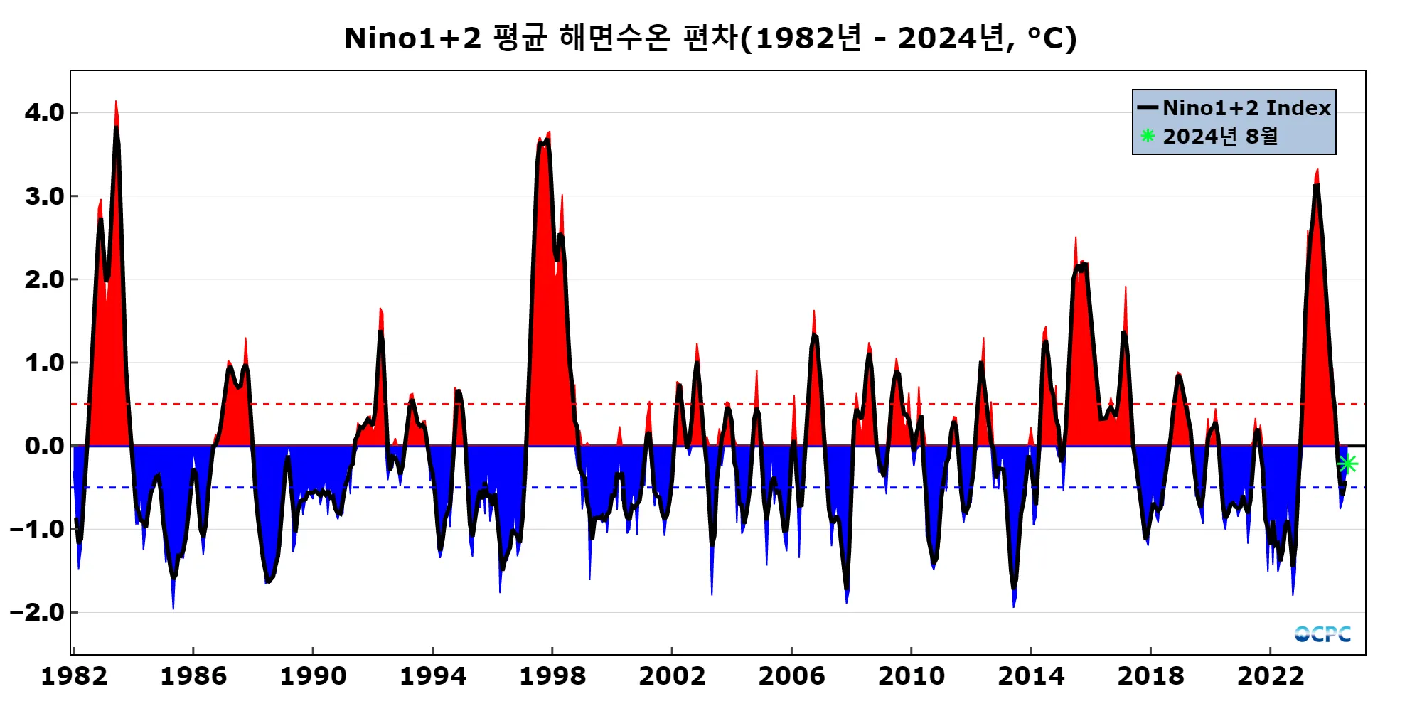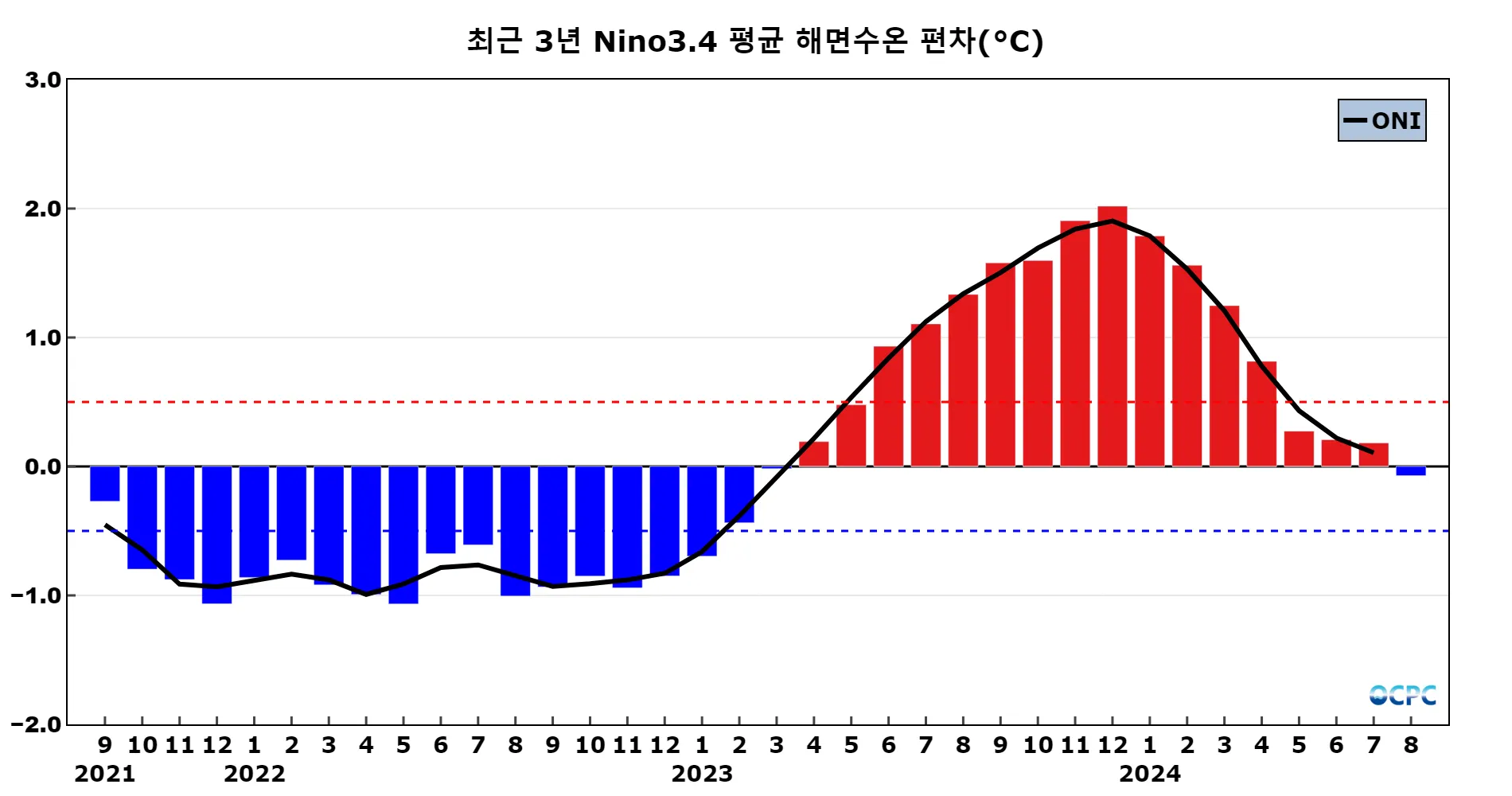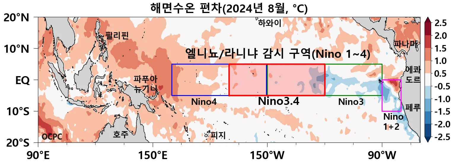 엘니뇨/라니냐 감시구역인 열대 태평양 Nino3.4 해역(5°S~5°N, 170°W~120°W)의 8월 평균 해면수온 편차는 -0.1°C로 중립 상태입니다.