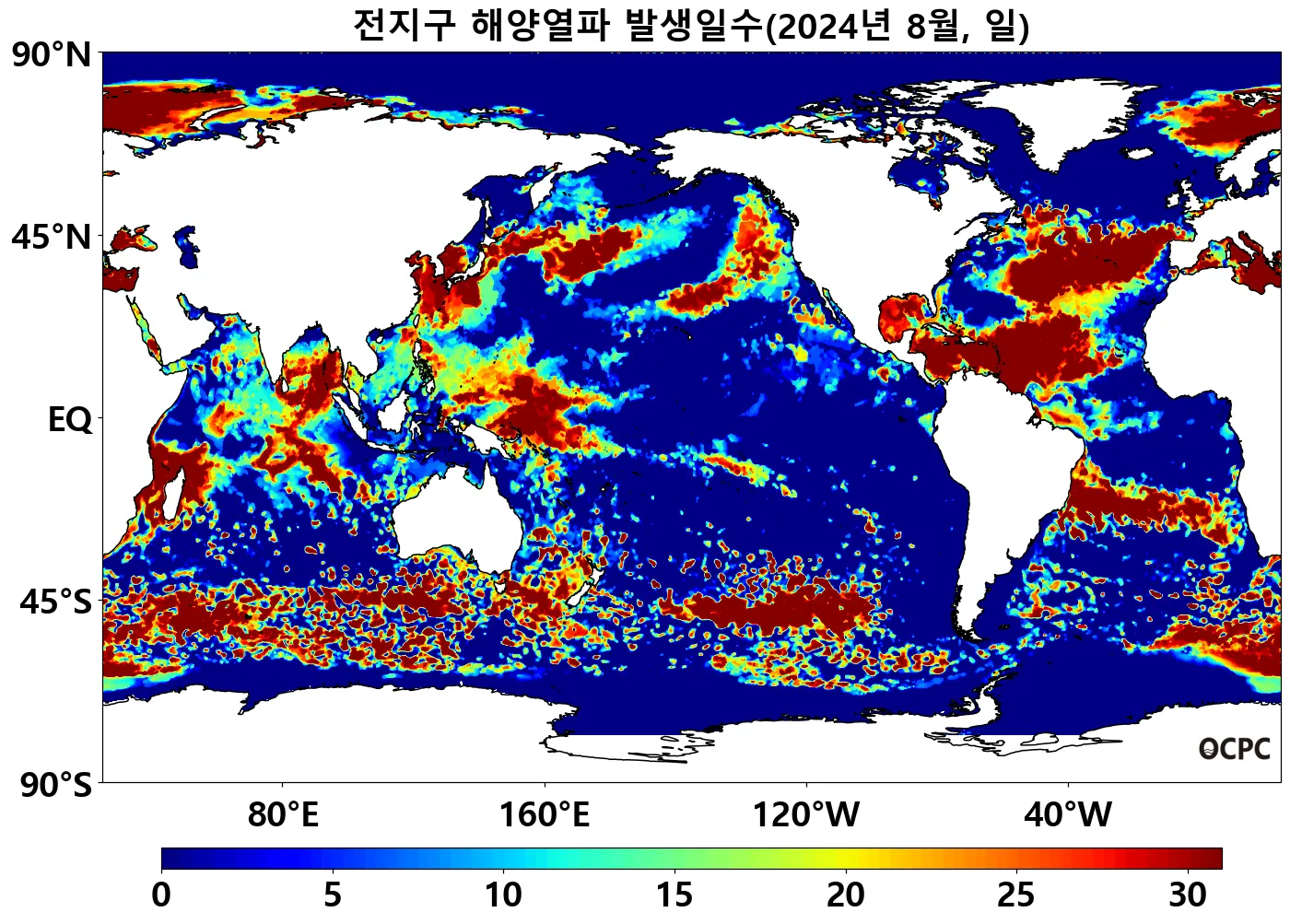 8월 동아시아 대부분의 해역에서 해양열파 발생일수가 많았습니다.