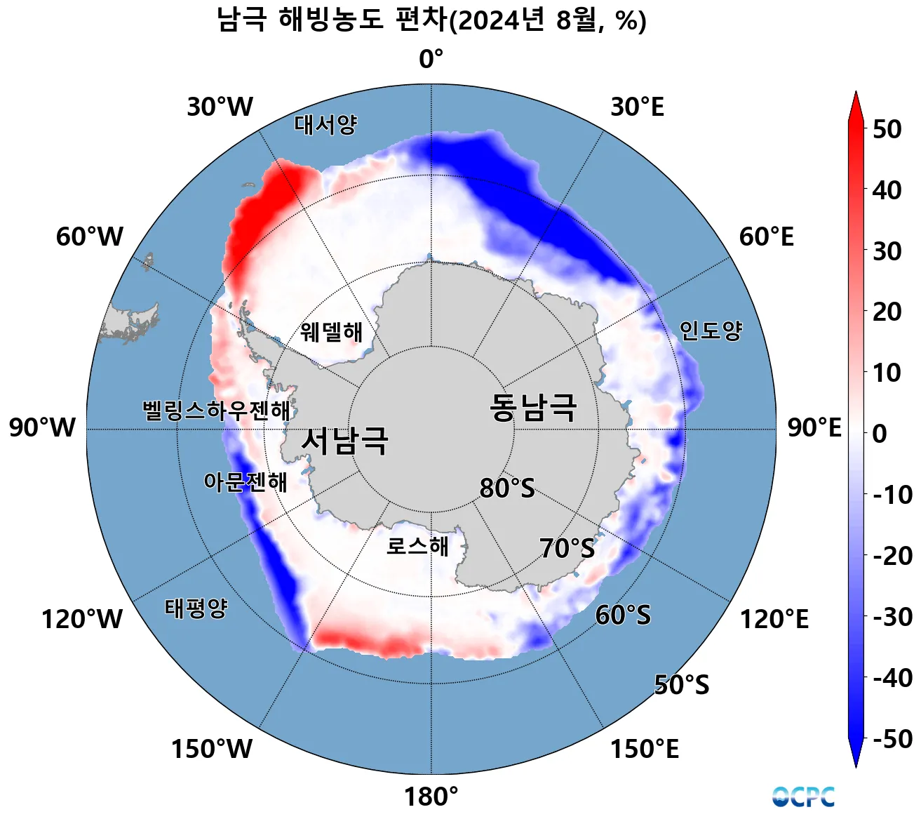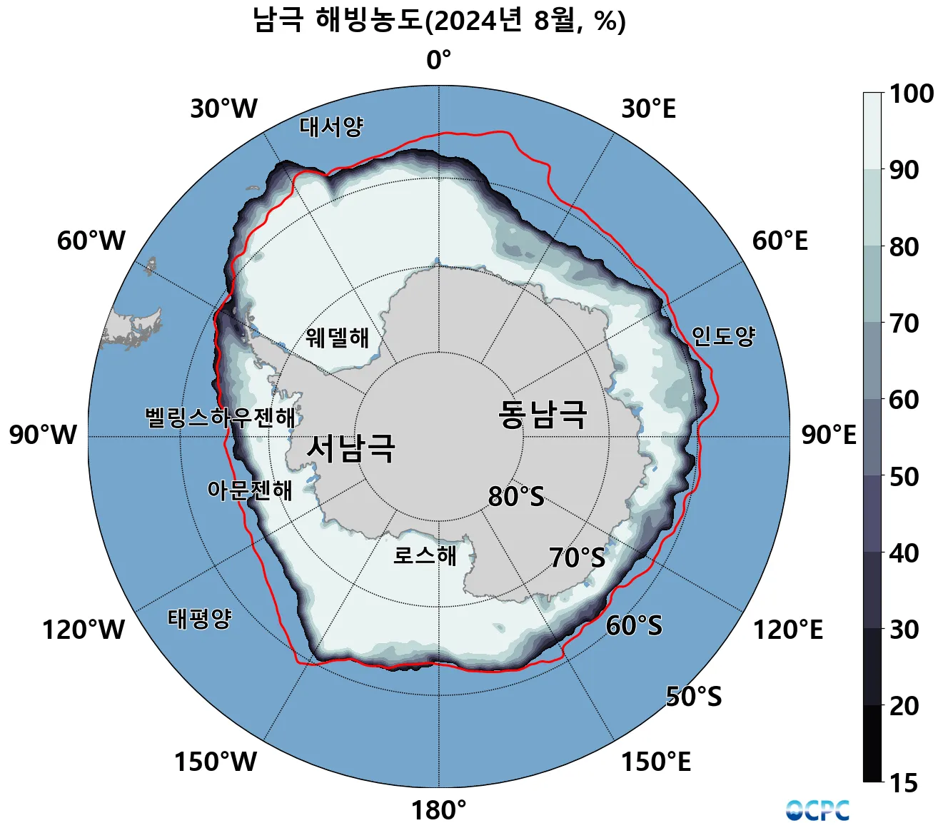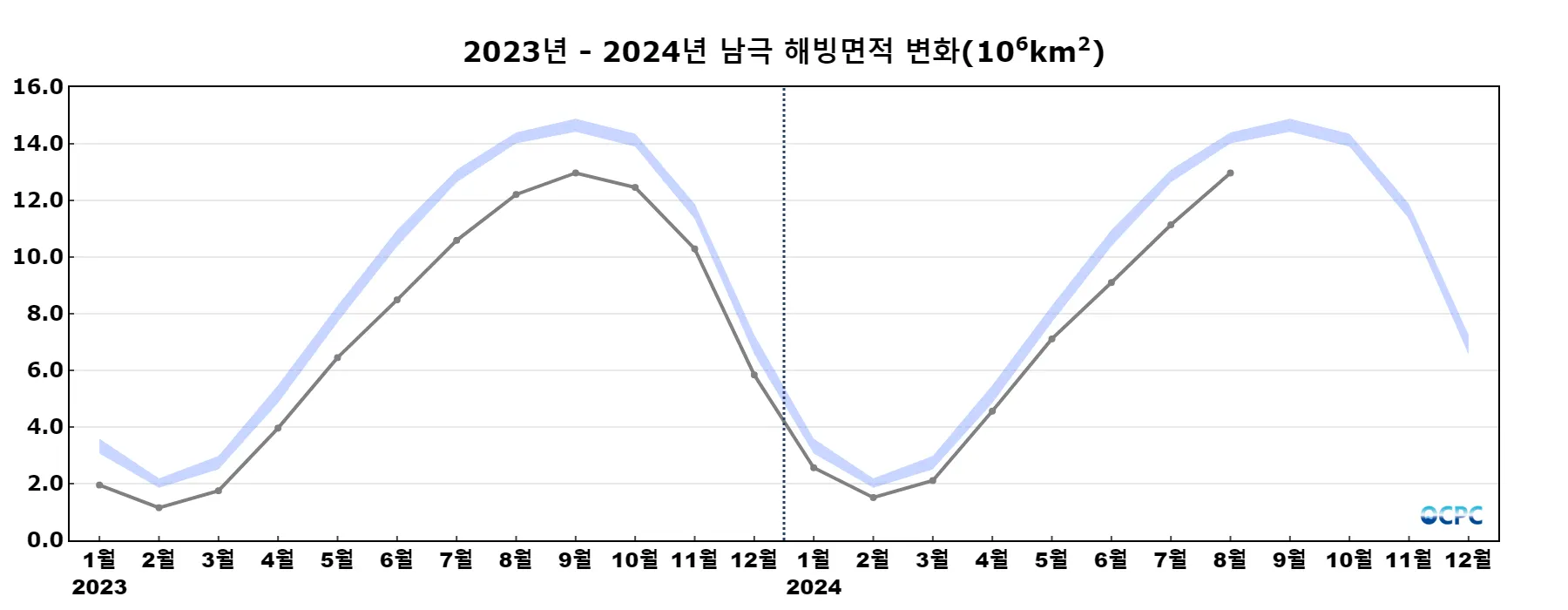 8월 남극 해빙면적은 1,297만km²로 평년(1,421만±19만km²)보다 124만km²(8.7%) 작았으며, 1981~2024년(8월) 중 작년에 이어 2번째로 작은 해빙면적을 기록했습니다.