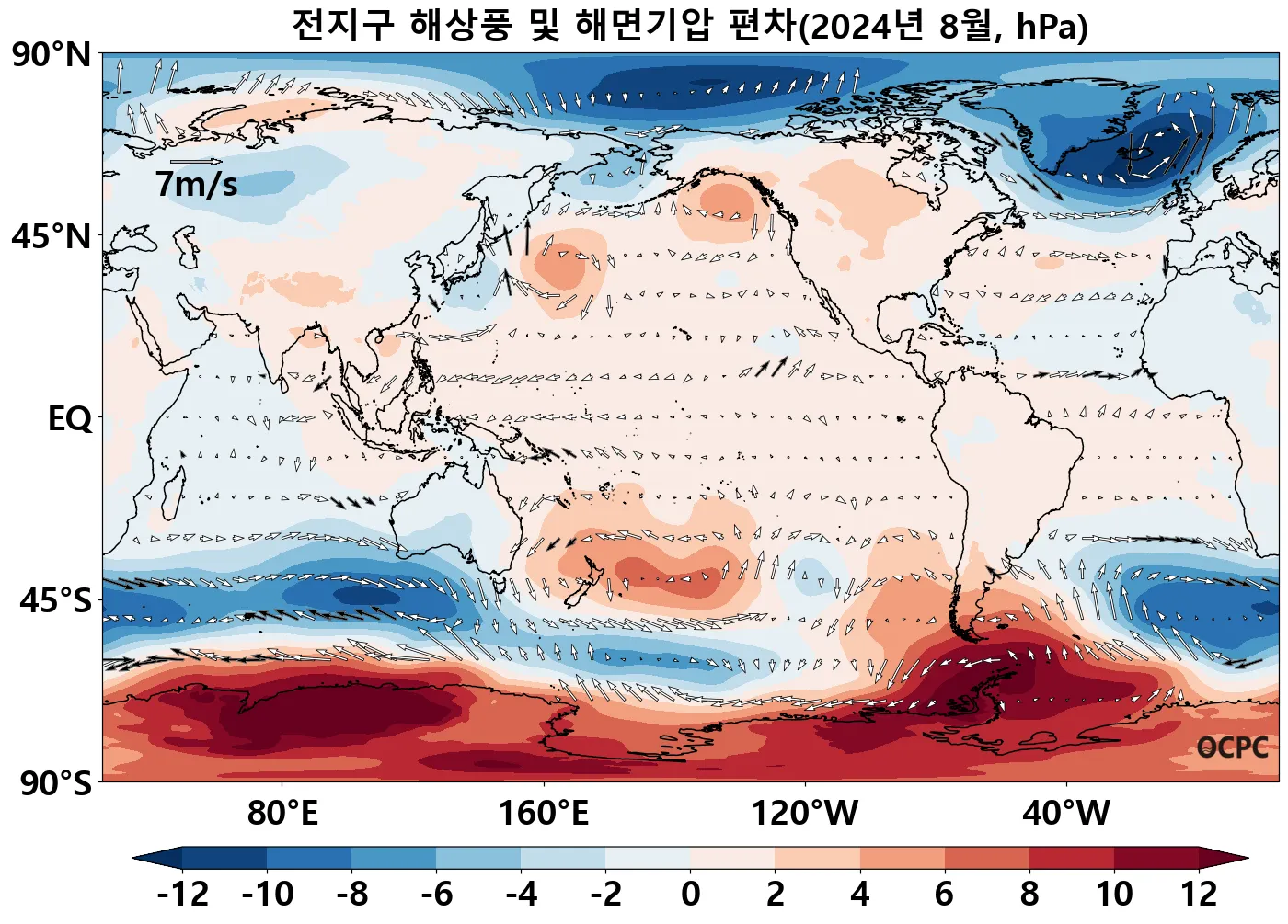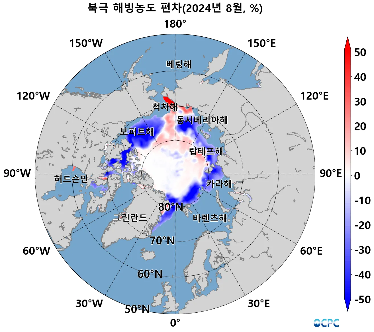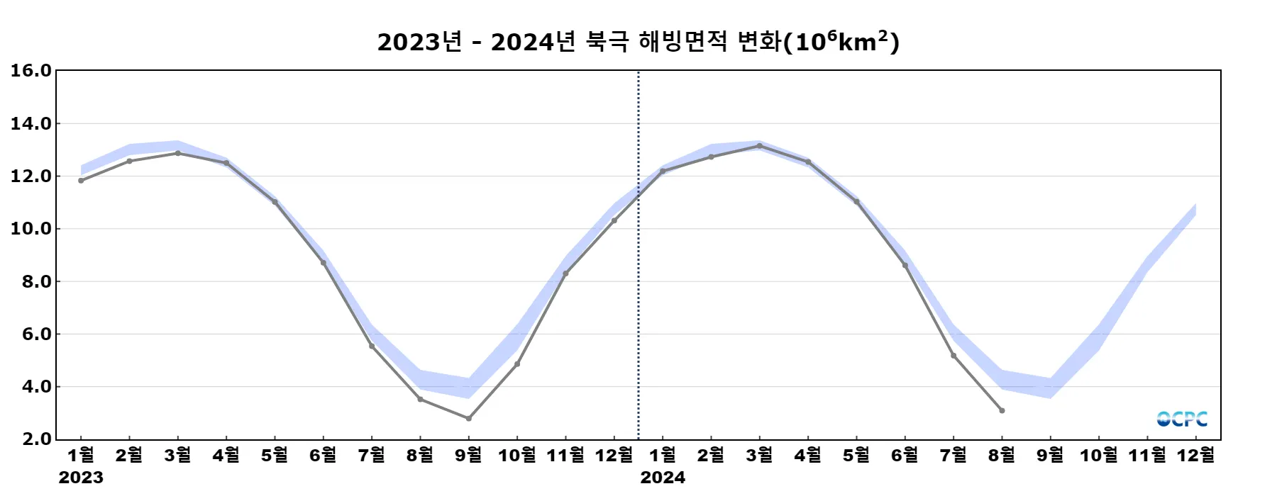 8월 남극 해빙면적은 1,297만km²로 평년(1,421만±19만km²)보다 124만km²(8.7%) 작았으며, 1981~2024년(8월) 중 작년에 이어 2번째로 작은 해빙면적을 기록했습니다.