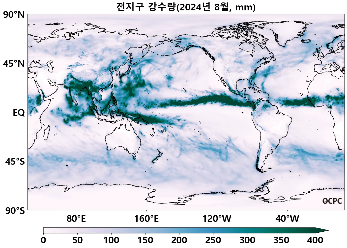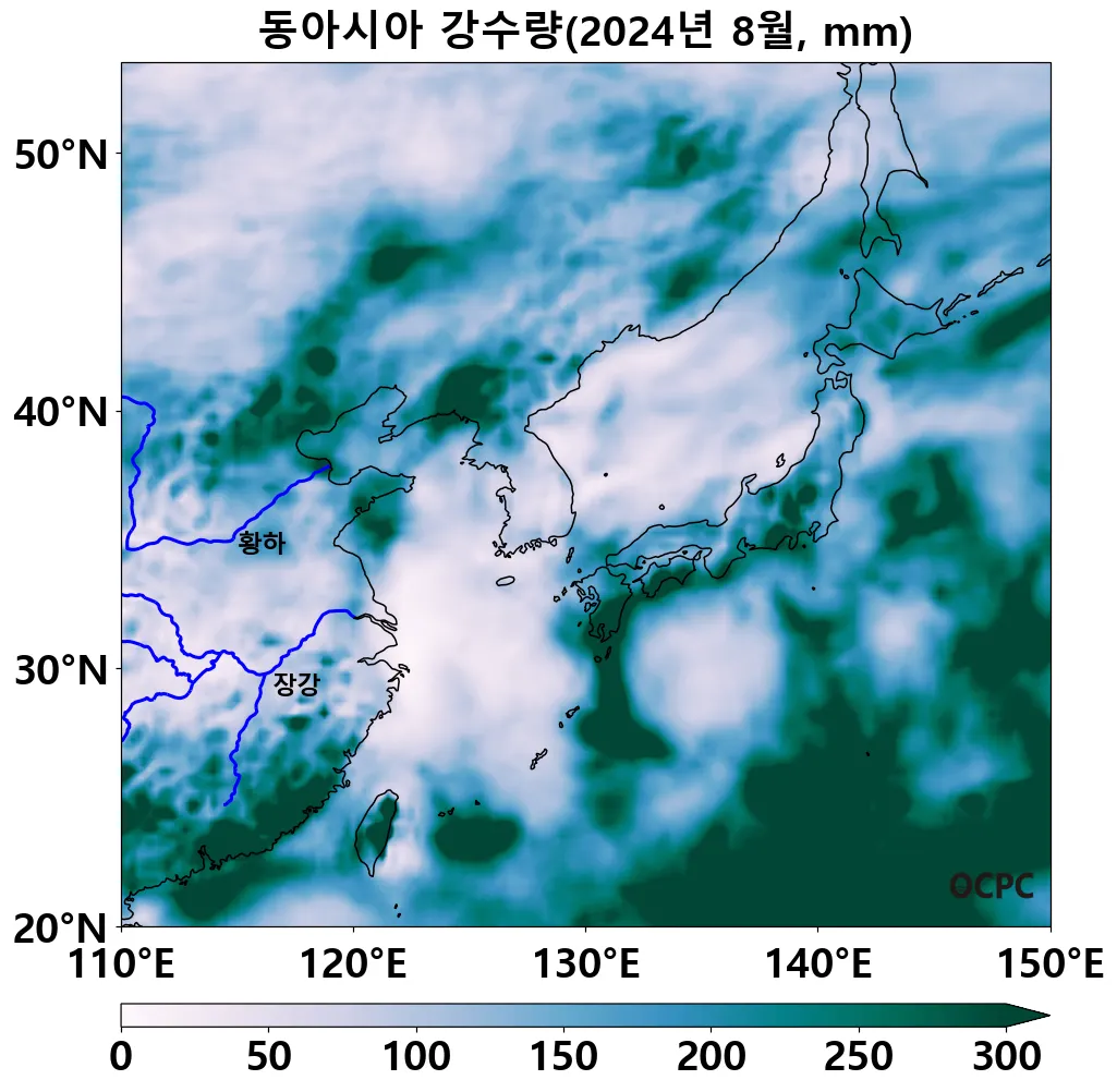 북서태평양 고기압과 티베트 고기압의 발달로 우리나라 주변해역의 해상강수량이 적었습니다. 하지만 8월에 발생한 대부분의 태풍이 일본 남동쪽 해상을 지나며 많은 비를 내려 동아시아해역의 강수량이 상대적으로 높게 나타났습니다.
