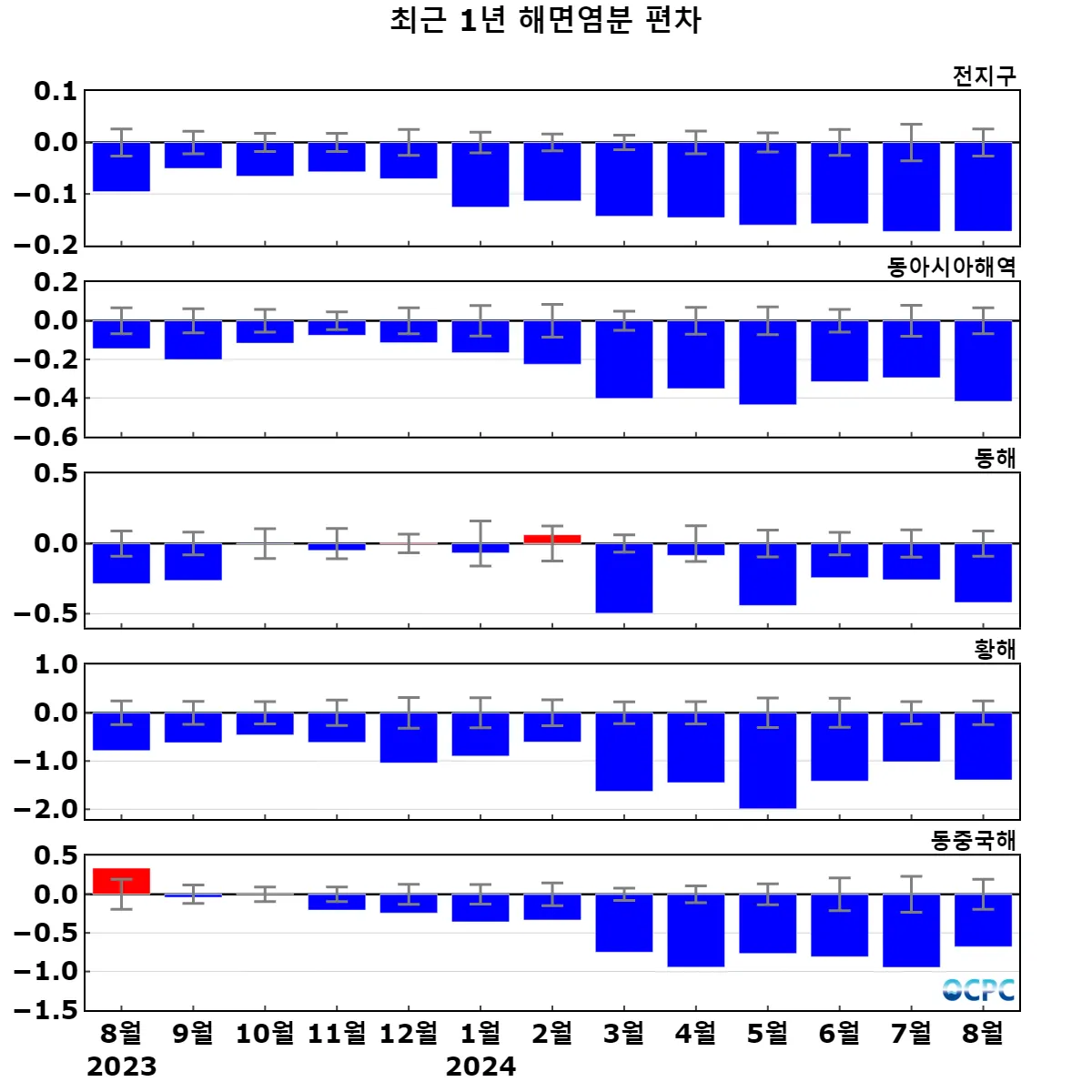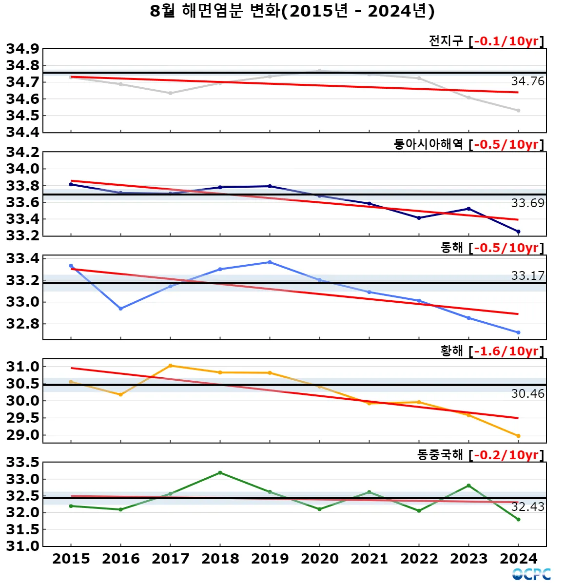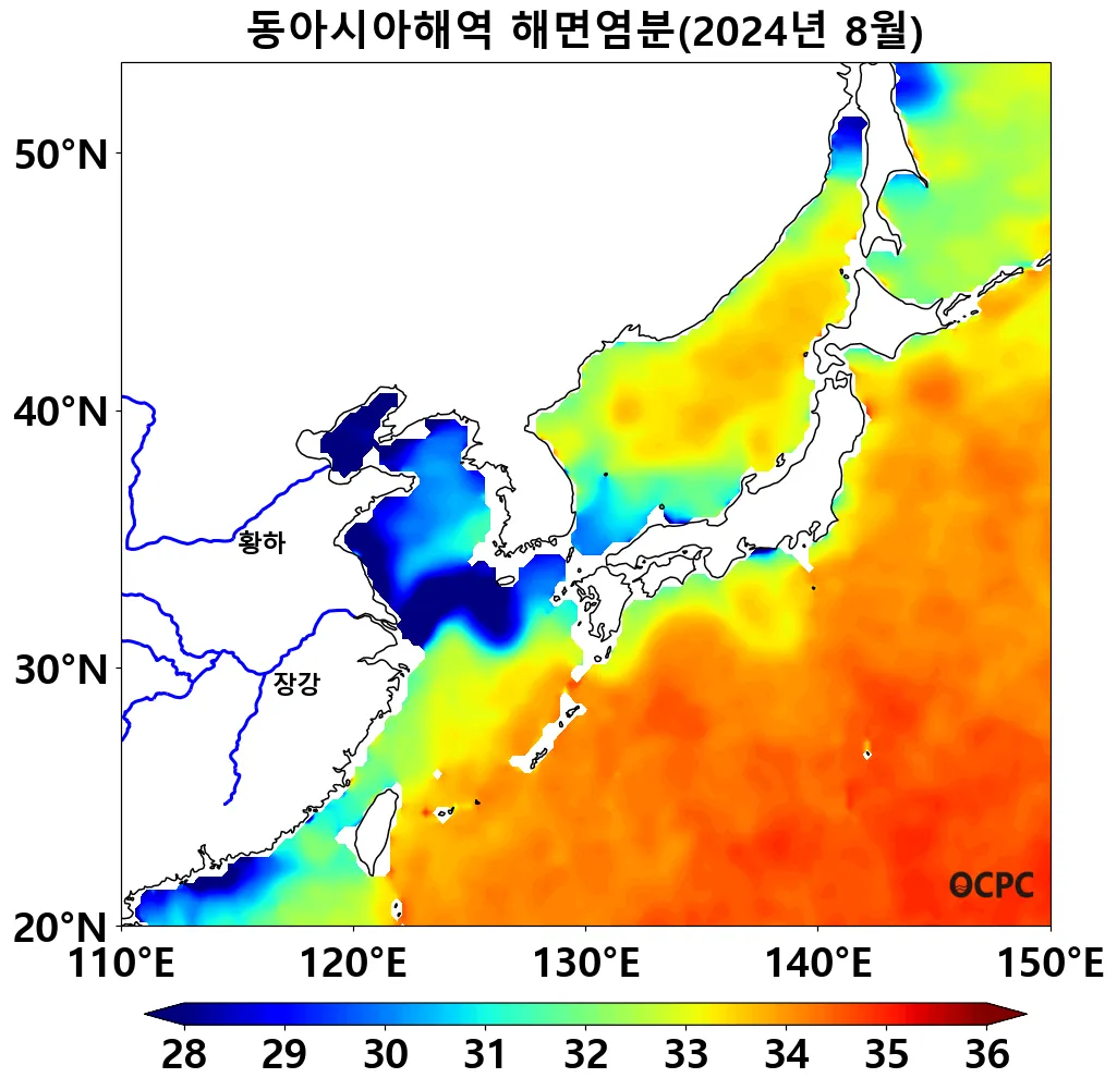 동해와 황해, 동중국해 해면염분은 자료기간 평균(33.1±0.1, 30.4±0.2, 32.5±0.2)보다 0.4, 1.4, 0.7 낮았습니다.