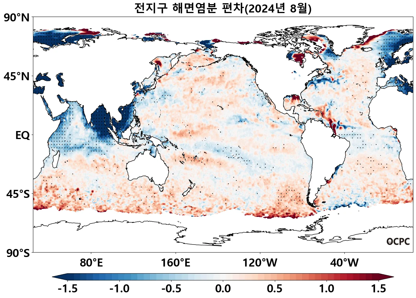 인공위성(SMAP)을 이용한 해면염분 추정 자료는 2015년 4월부터 활용가능하나 기간이 짧고 다른 자료에 비해서 불확실성이 큽니다. 2024년부터는 9년 정도의 자료가 확보되는 시점이어서 기간 평균 대비 월별 편차를 시범적으로 제공하니 참고하시기 바랍니다.