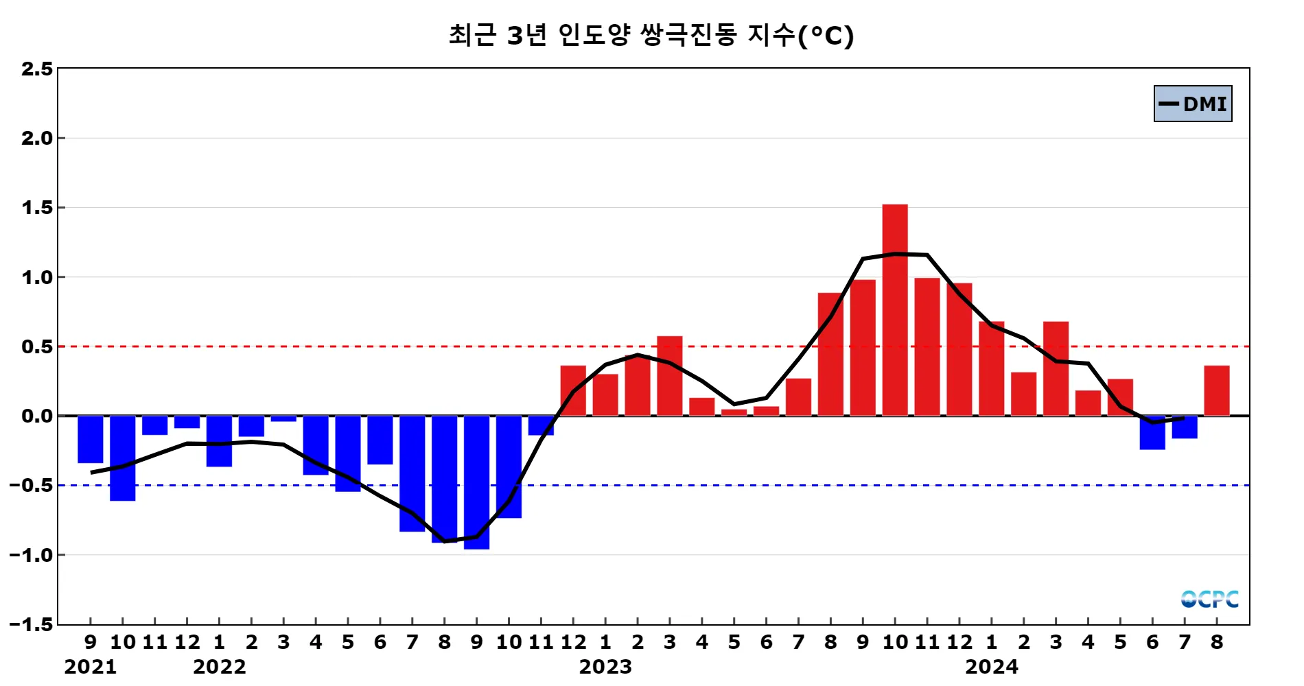인도양 쌍극진동 지수 DMI (Dipole Mode Index)는 WTIO의 평년 대비 편차에서 SETIO의 평년 대비 편차를 뺀 값으로 월 평균 지수(채색부분)를 3개월 이동평균하여 나타낸 지수(검정선)가 0.5보다 크면 양의 상태로, -0.5보다 작으면 음의 상태로 판정합니다. OCPC 월간 분석정보에서는 당월 평균 지수만을 이용해서 잠정적으로 판정합니다.