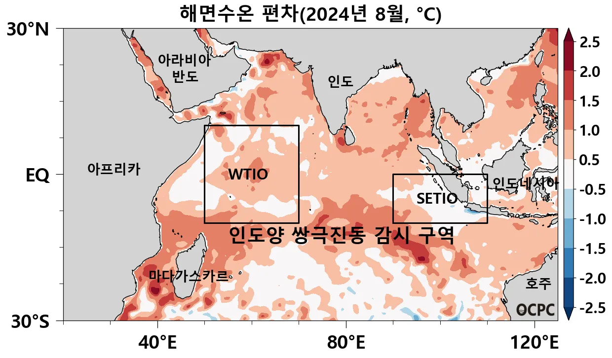 2024년 8월 평균 해면수온의 평년 대비 편차(사각형은 인도양 쌍극진동 감시구역으로 각각 WTIO(열대서인도양), SETIO(열대 남동인도양) 해역이며, 인도양 쌍극진동 지수(DMI: Dipole Mode Index)는 WTIO의 평년 대비 편차에서 SETIO의 평년 대비 편차를 뺀 값입니다.)