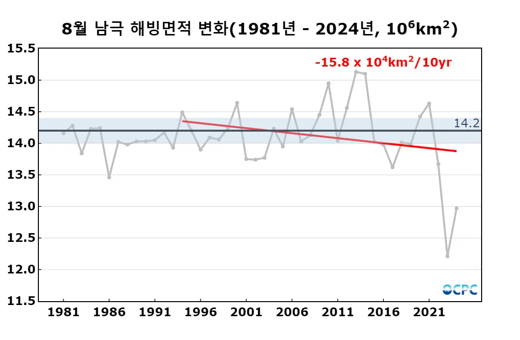 8월 남극 해빙면적은 1994~2024년 동안 10년에 16만km²씩 감소하는 추세입니다.
