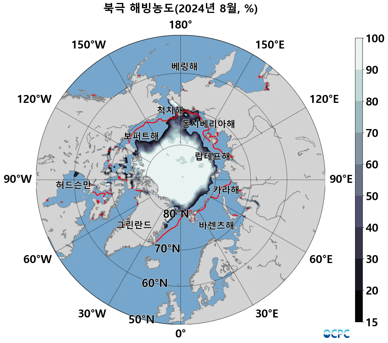해빙농도 15% 이상 해역, 붉은선(평년 해빙농도 15% 경계)