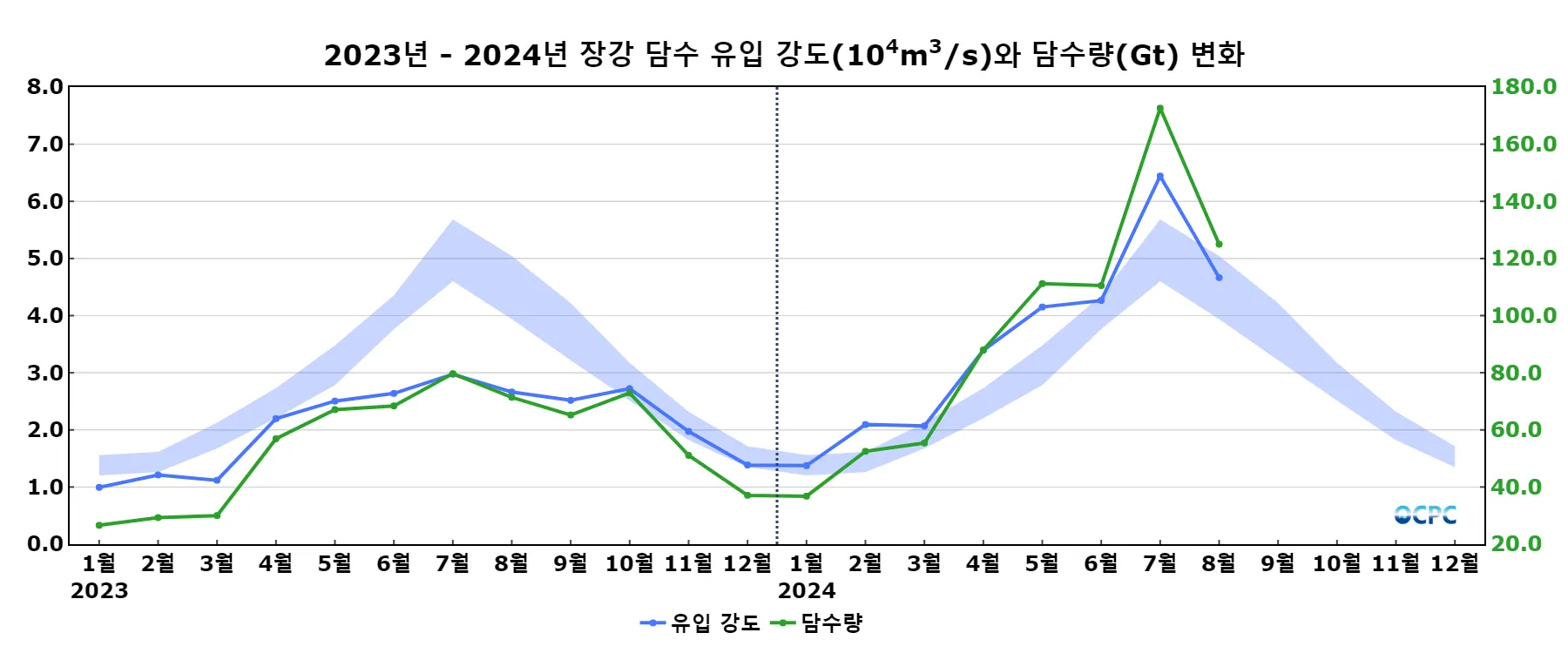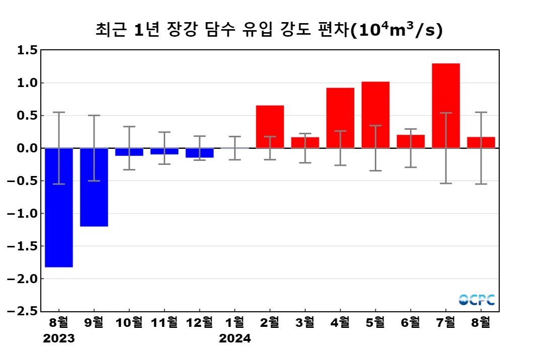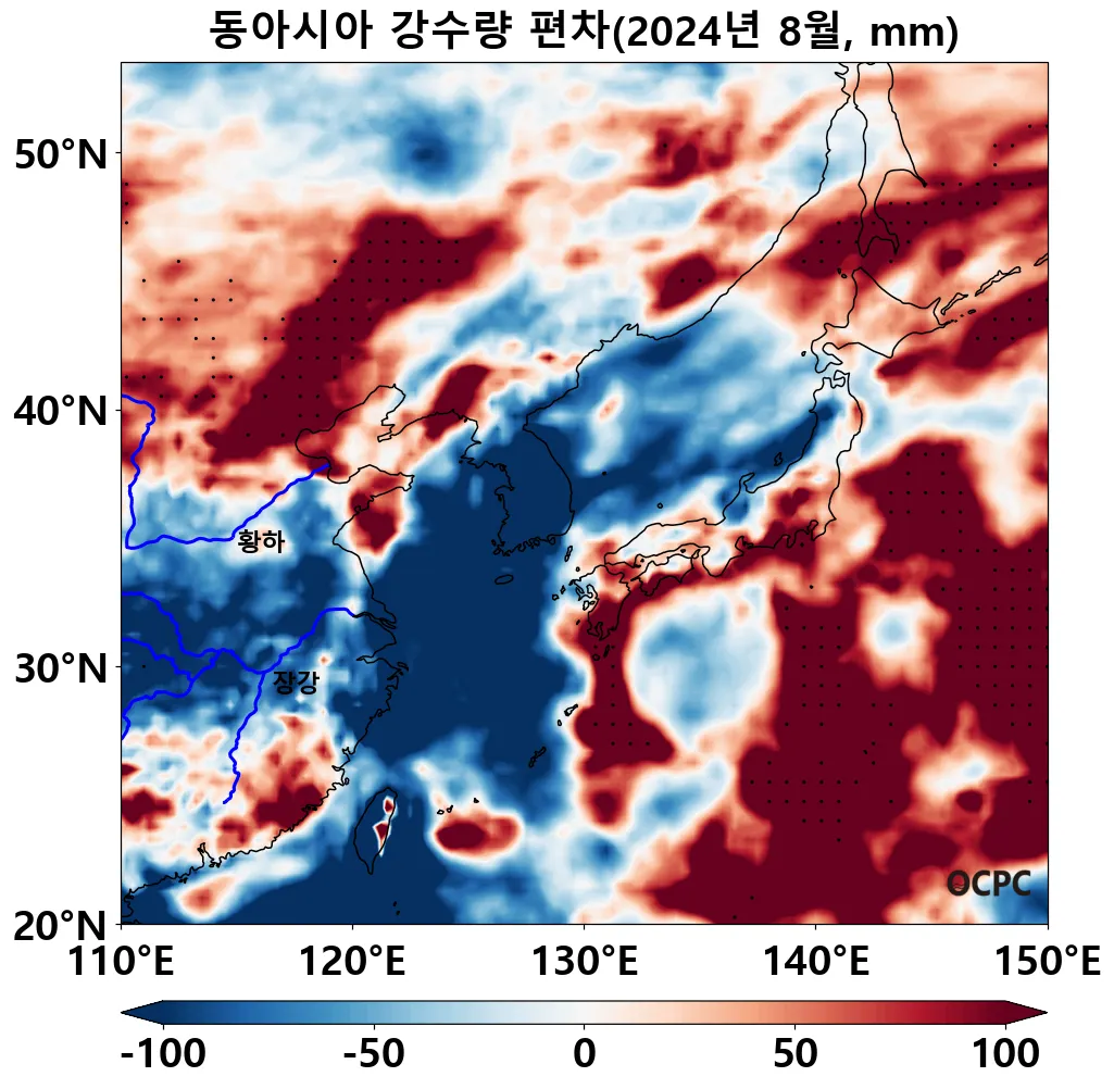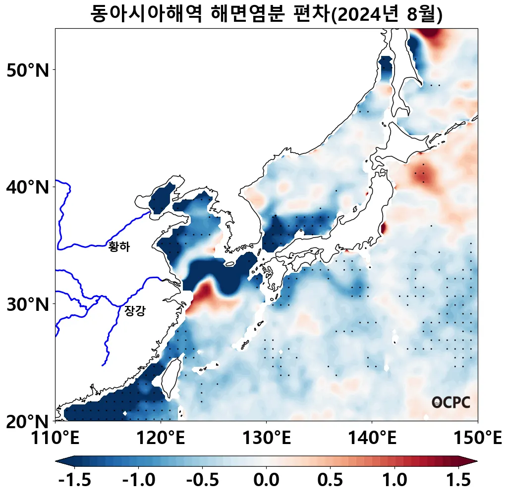 8월 한 달 동안 동중국해로 유입된 담수량으로 환산하면, 124.9기가톤(1Gt=10⁹m³=1km³)으로 평년(120.3±14.8기가톤)과 비슷했습니다.
