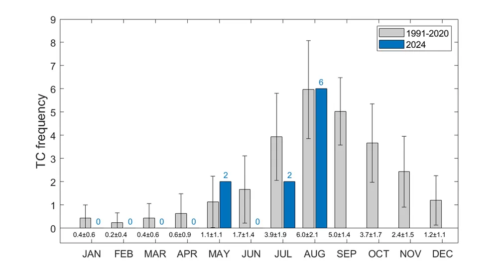 2024년 8월에 총 6개의 태풍이 발생했습니다.