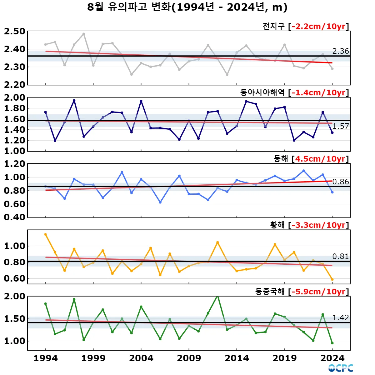 1994~2024년 동안 전지구, 동아시아해역의 8월 평균 유의파고는 10년에 1.4~2.2cm씩 감소하는 추세입니다.