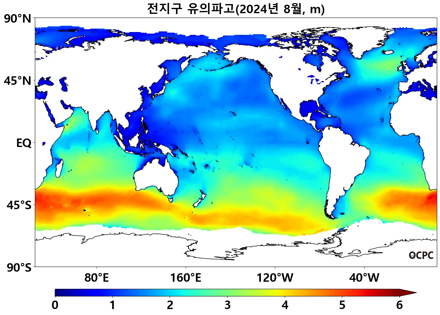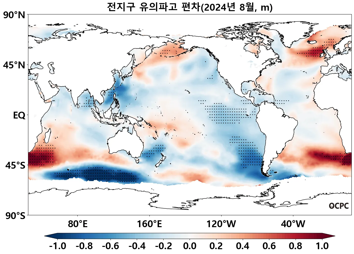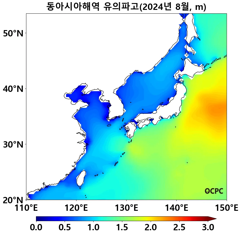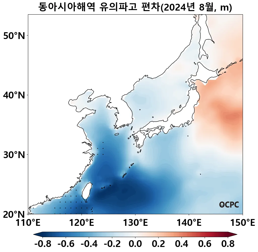 황해, 동중국해의 평균 유의파고는 평년(0.81±0.06m, 1.42±0.13m)보다 각각 0.22m, 0.46m씩 감소했으며, 두 해역에서 모두 1994~2024년(8월) 중 가장 낮게 나타났는데 이는 평년 대비 감소한 풍속의 영향으로 추정됩니다.