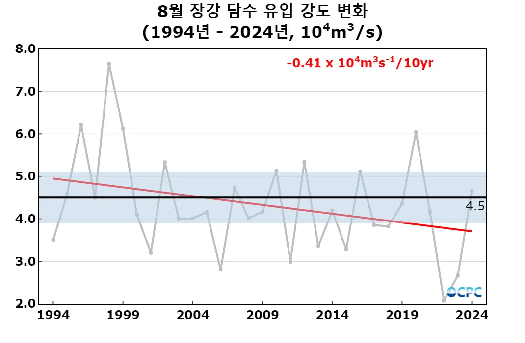 1994~2024년 동안 8월 장강 담수 유입 강도는 10년에 초당 4,100톤(한 달 동안 유입된 담수량으로 환산하면 10년에 11.0기가톤)씩 감소하는 추세입니다.