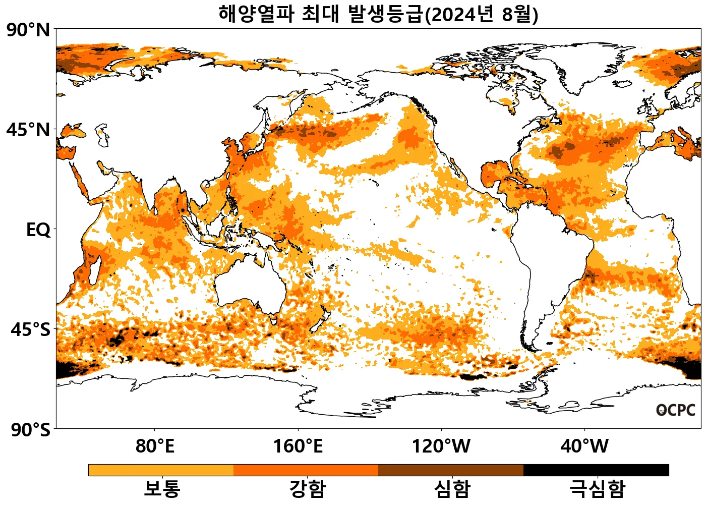 전지구 해양열파는 2023년 1월에 발생하여 현재까지 ‘보통’~’강함’ 등급을 유지하고 있습니다.