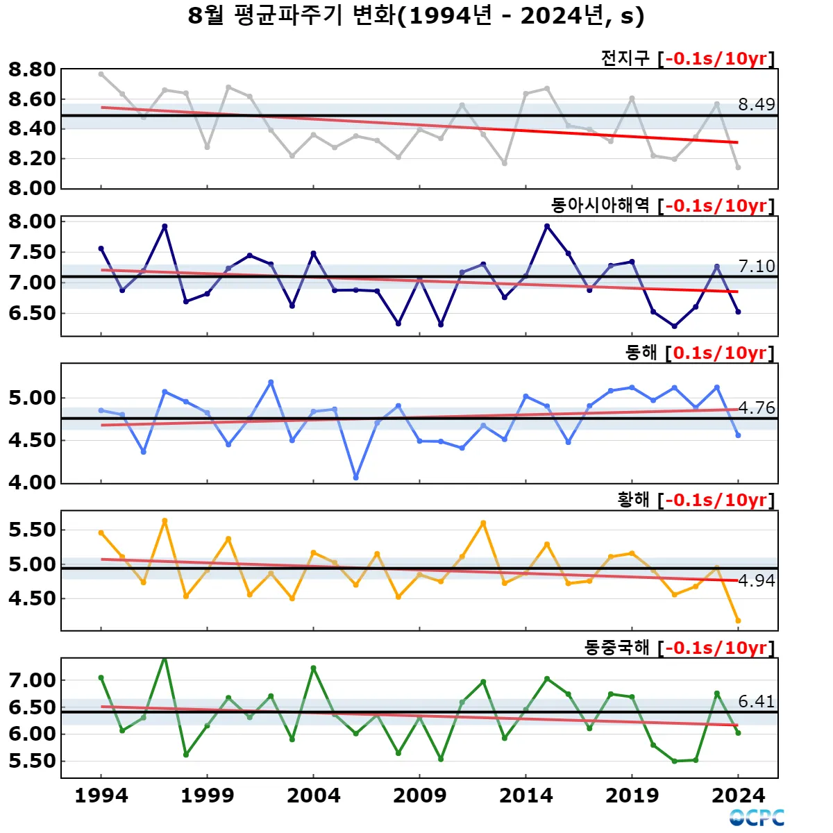 1994~2024년 동안 전지구, 동아시아해역의 8월 평균 평균파주기는 10년에 0.1초씩 감소하는 추세입니다.