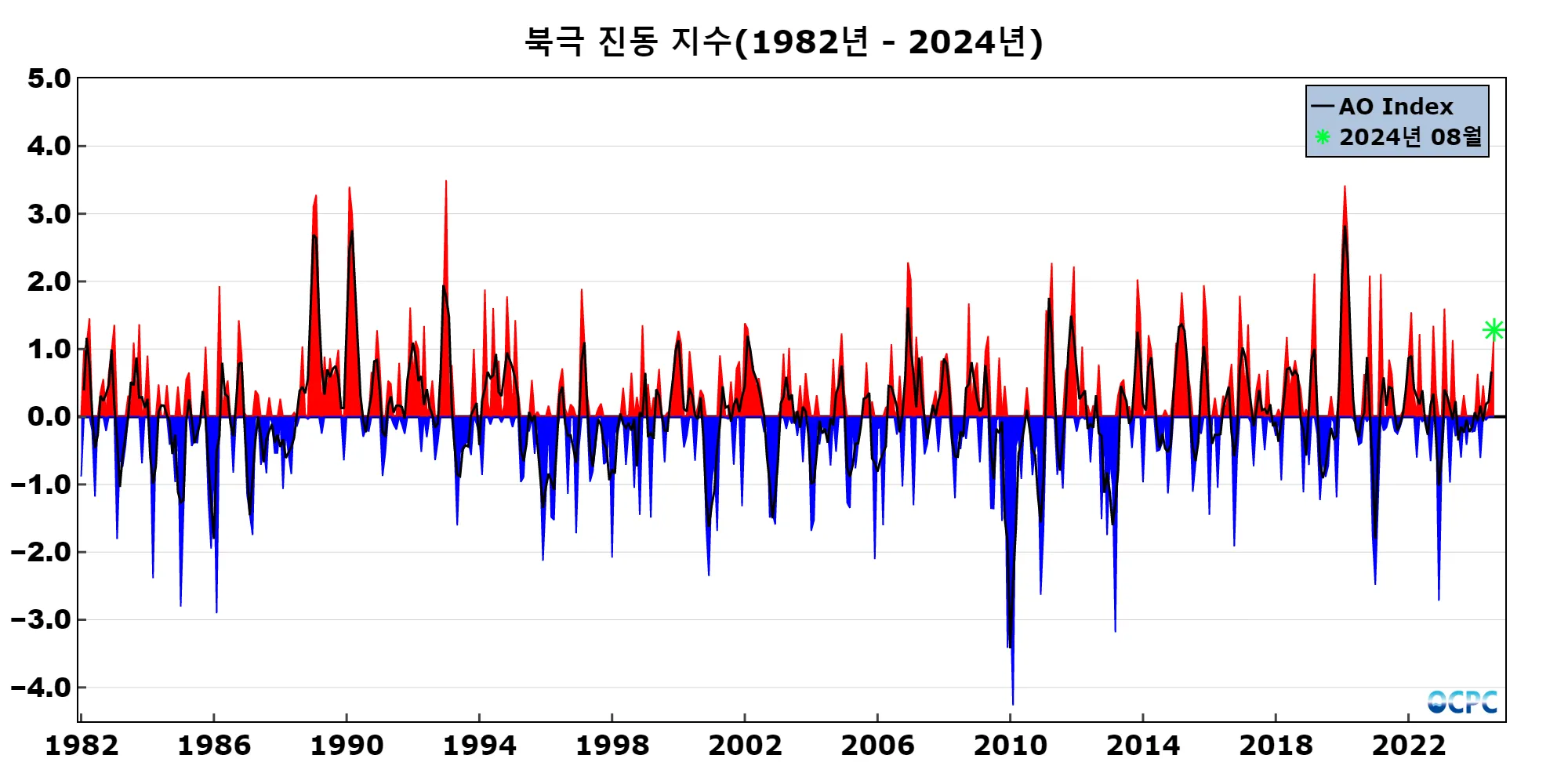 8월 북극진동 지수는 1.3으로 양의 상태입니다.