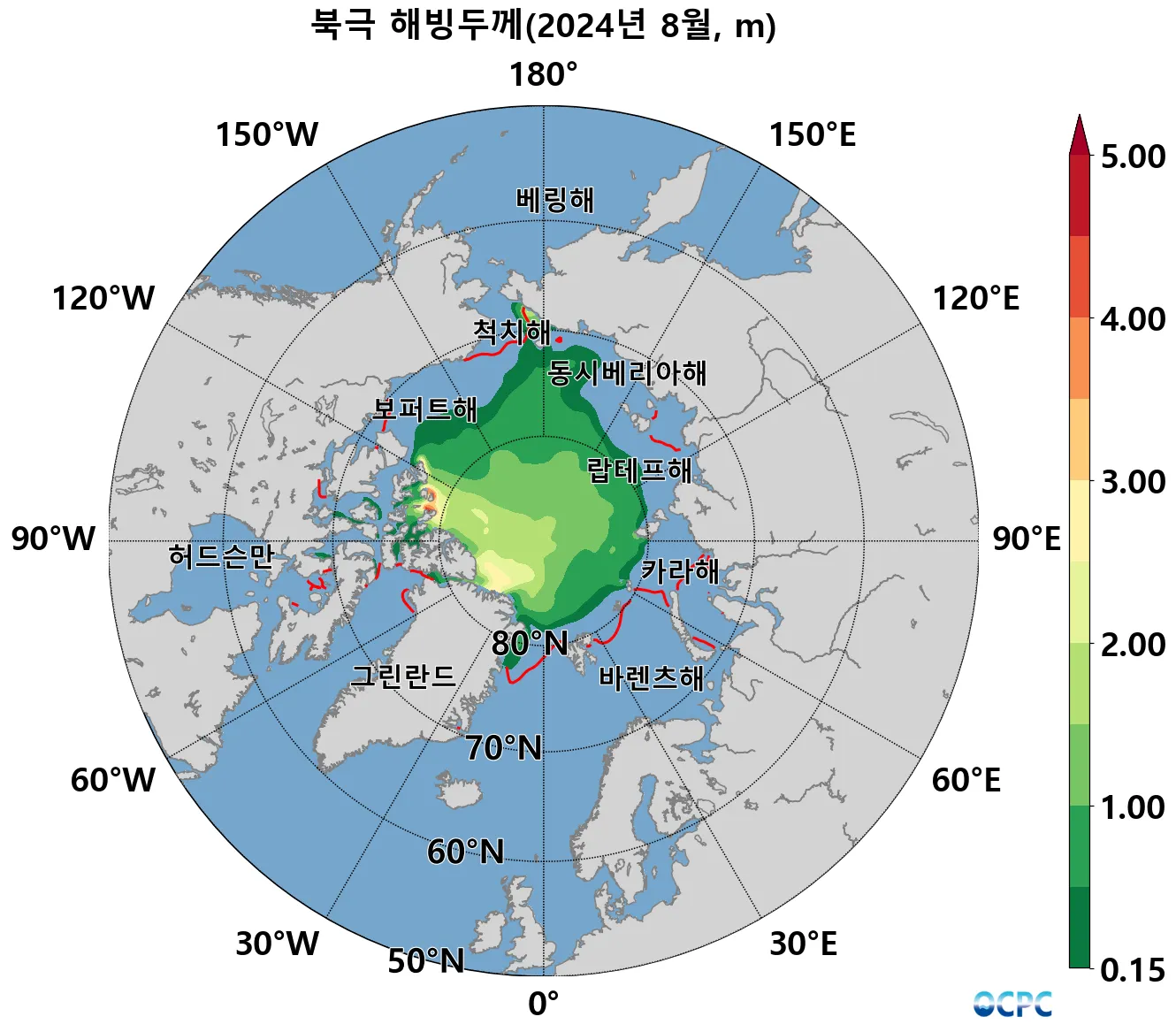 해빙두께 0.15m 이상 해역, 붉은선(평년 해빙두께 0.15m 경계)