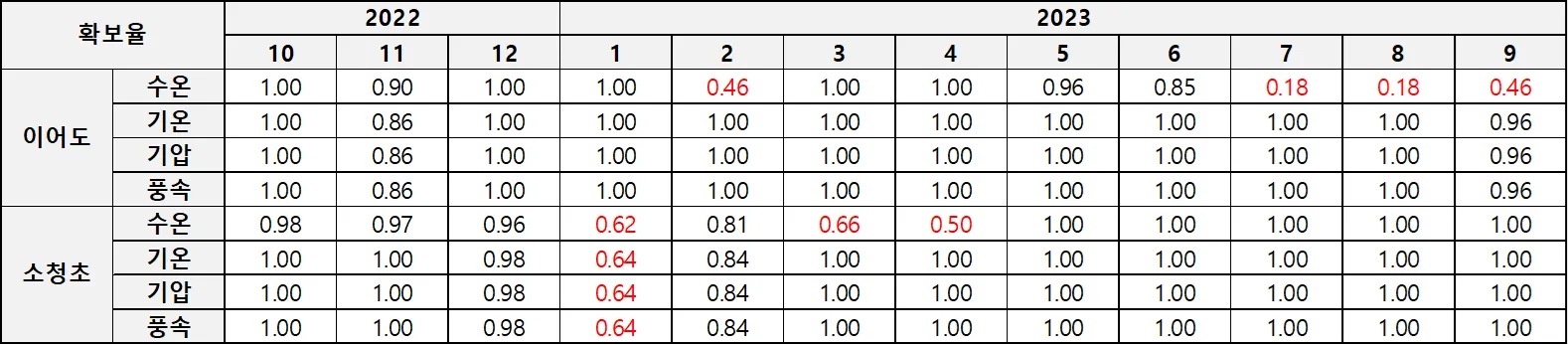 해양과학기지 관측자료 월별 확보율(2022-2023)