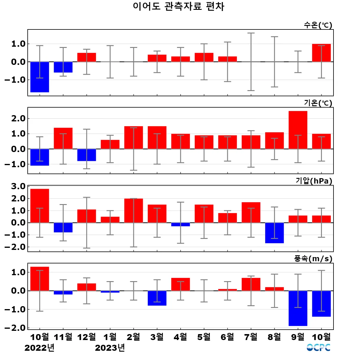 이어도 기지 수온(23.6℃)은 관측기간 평균(22.6±0.9℃)보다 1.0℃ 높았습니다.