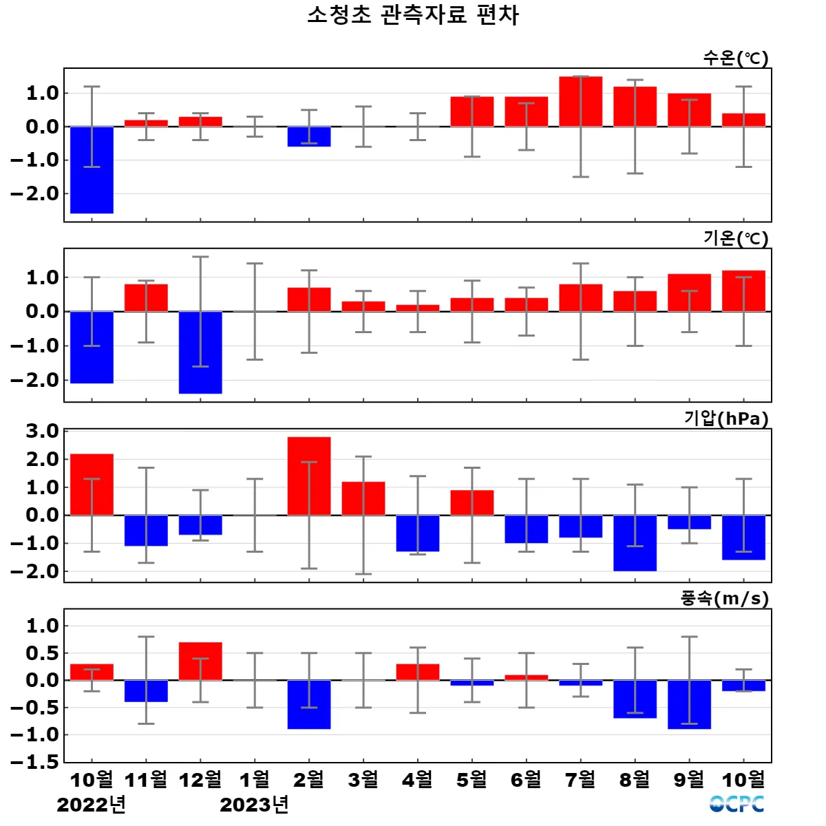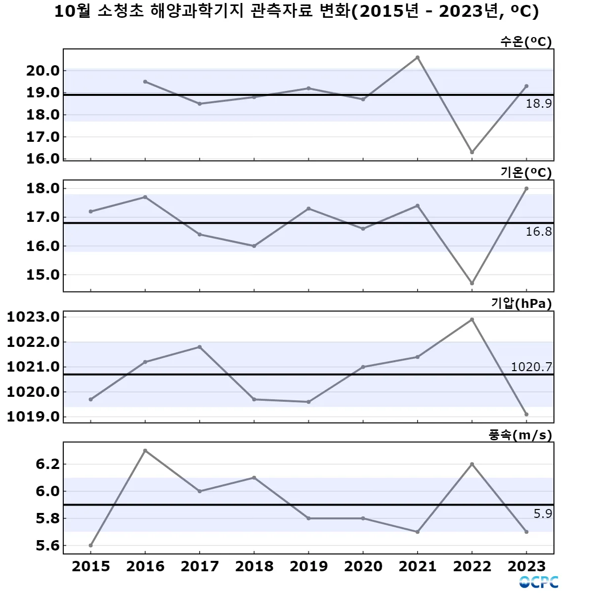 소청초 기지의 10월 평균기온(18.0℃)은 2015-2023년 중 가장 높았고, 평균기압(1019.1hPa)은 가장 낮았습니다.