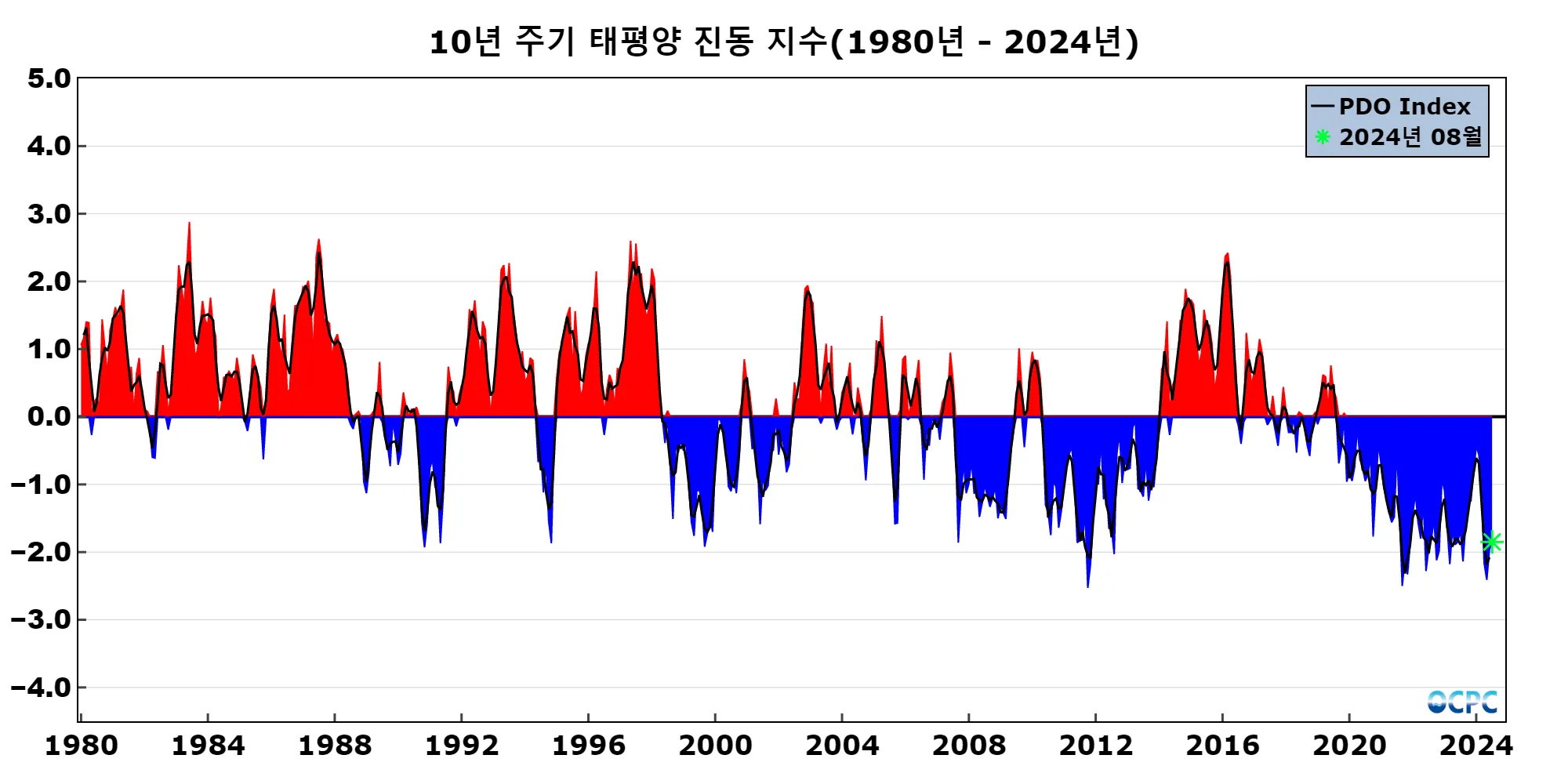 ㅇ 북태평양의 해수면 온도가 수십년에 걸쳐 주기적으로 변화하는 현상. 이 변동은 일반적으로 20년에서 30년 주기로 해양과 대기의 상호작용에 의해 발생함