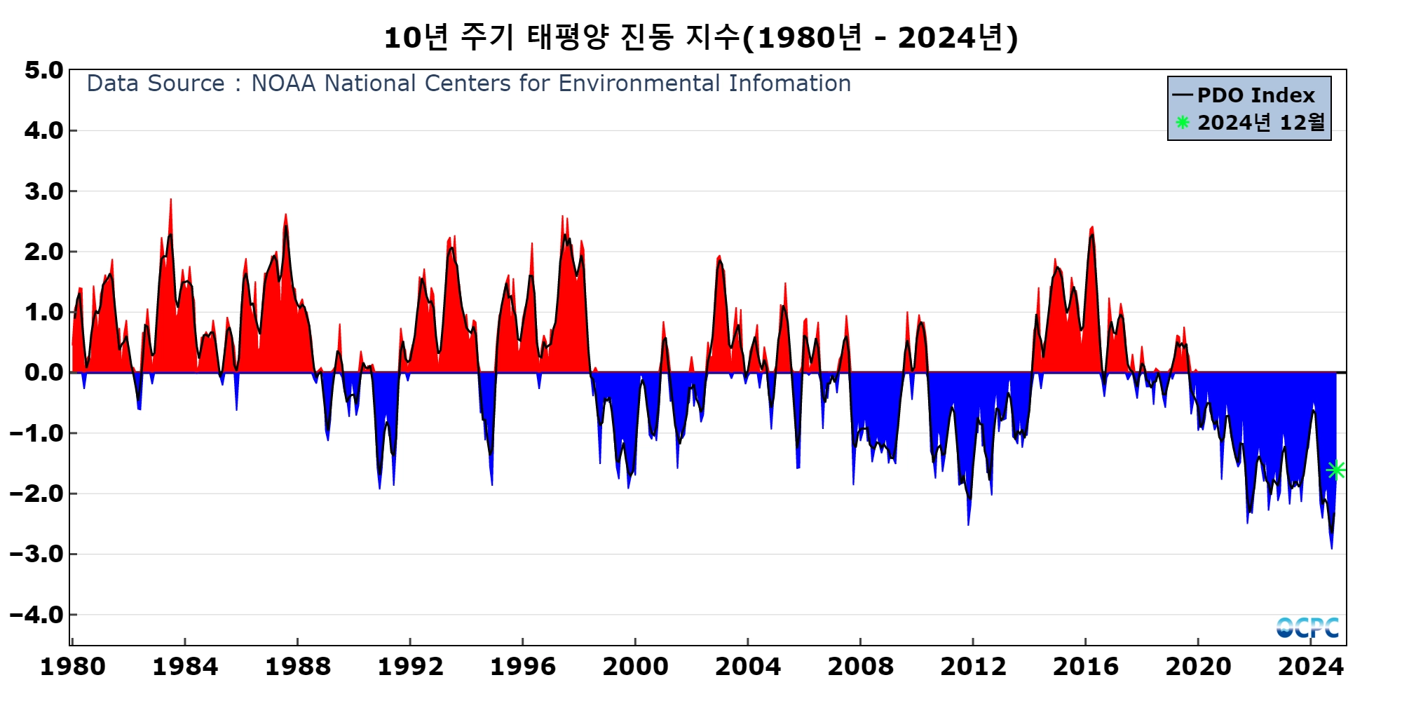 ㅇ 북태평양의 해면수온이 수십년에 걸쳐 주기적으로 변화하는 현상. 이 변동은 일반적으로 20년에서 30년 주기로 해양과 대기의 상호작용에 의해 발생함