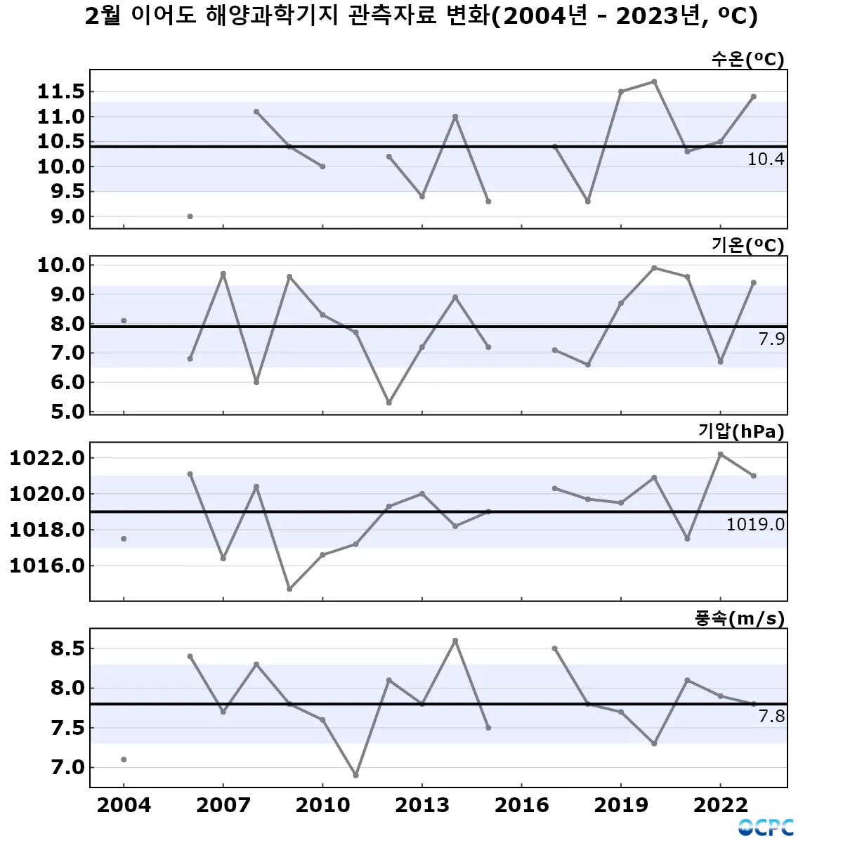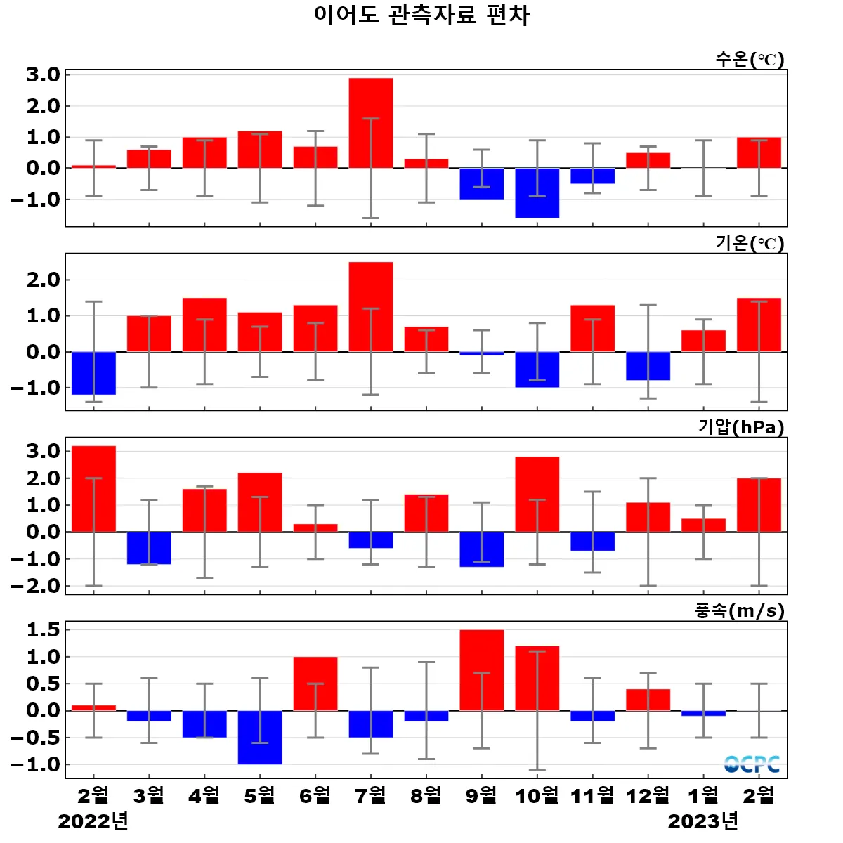이어도 기지의 2023년 2월 평균수온, 기온, 기압은 관측기간 평균구간(2월)보다 컸습니다.