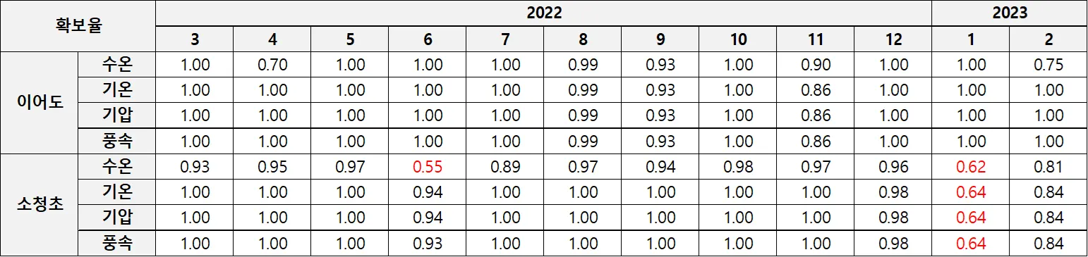 해양과학기지 관측요소별 관측자료 월별 확보율(2022). 최대가 1.0이며 붉은색은 월 확보율 0.8(수온은 0.7) 미만인 자료로 분석에서 제외