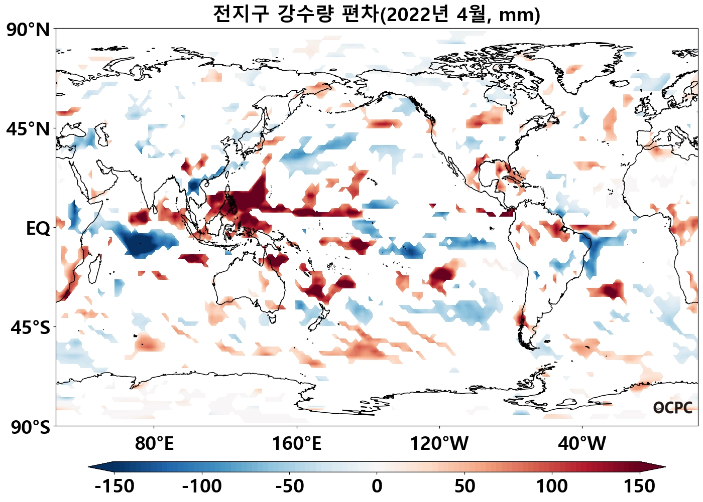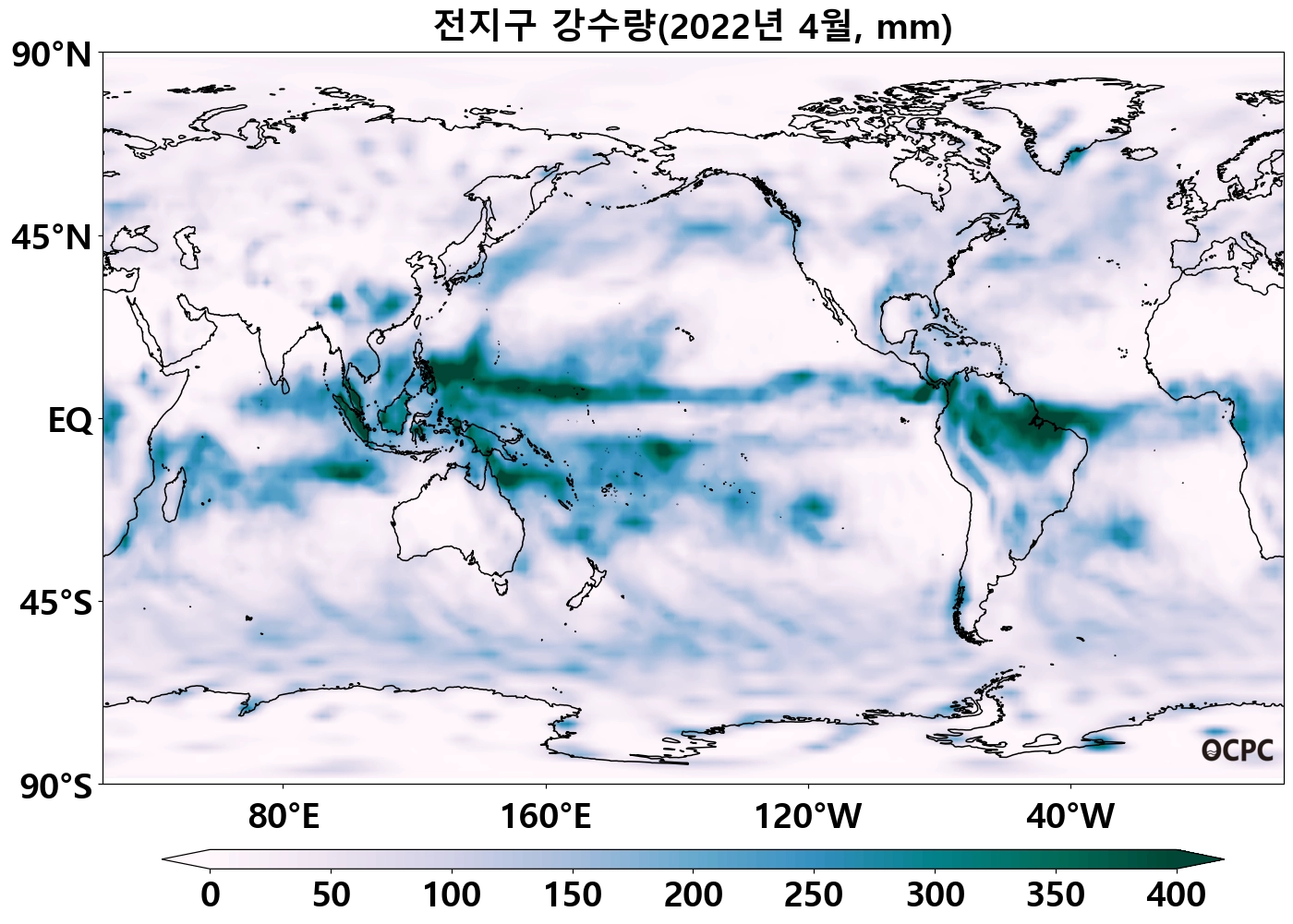 전지구 평균 4월 해상강수량은 평년(88.2mm)보다 3.6mm(4.1%) 많았습니다.