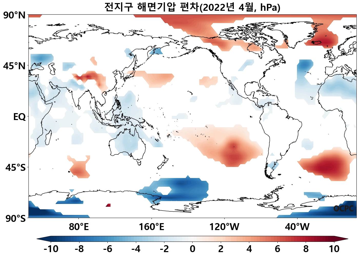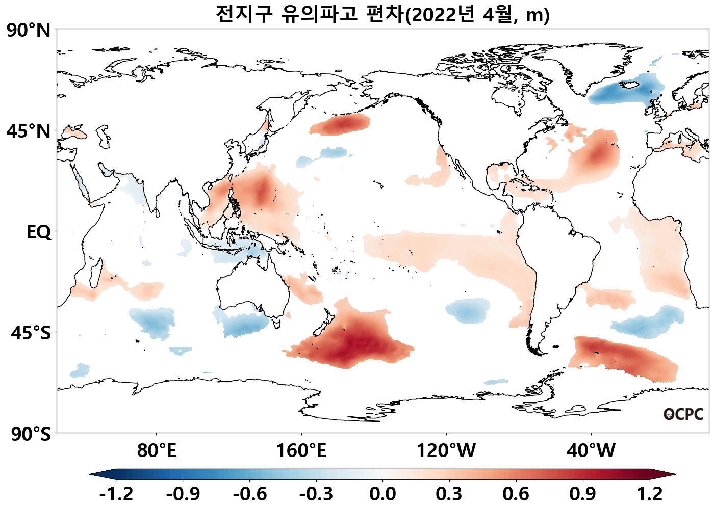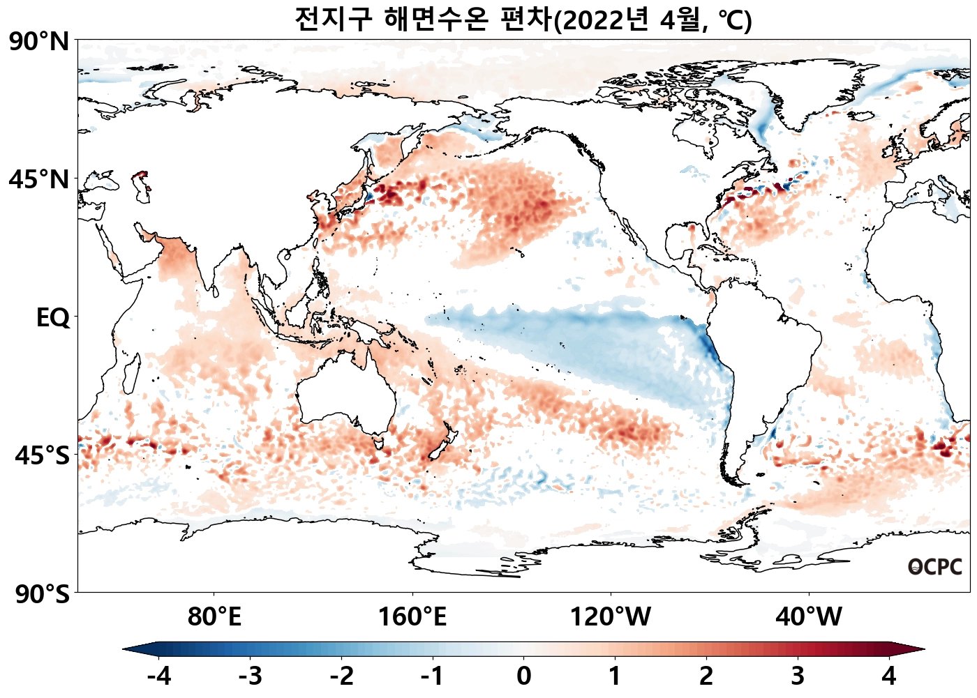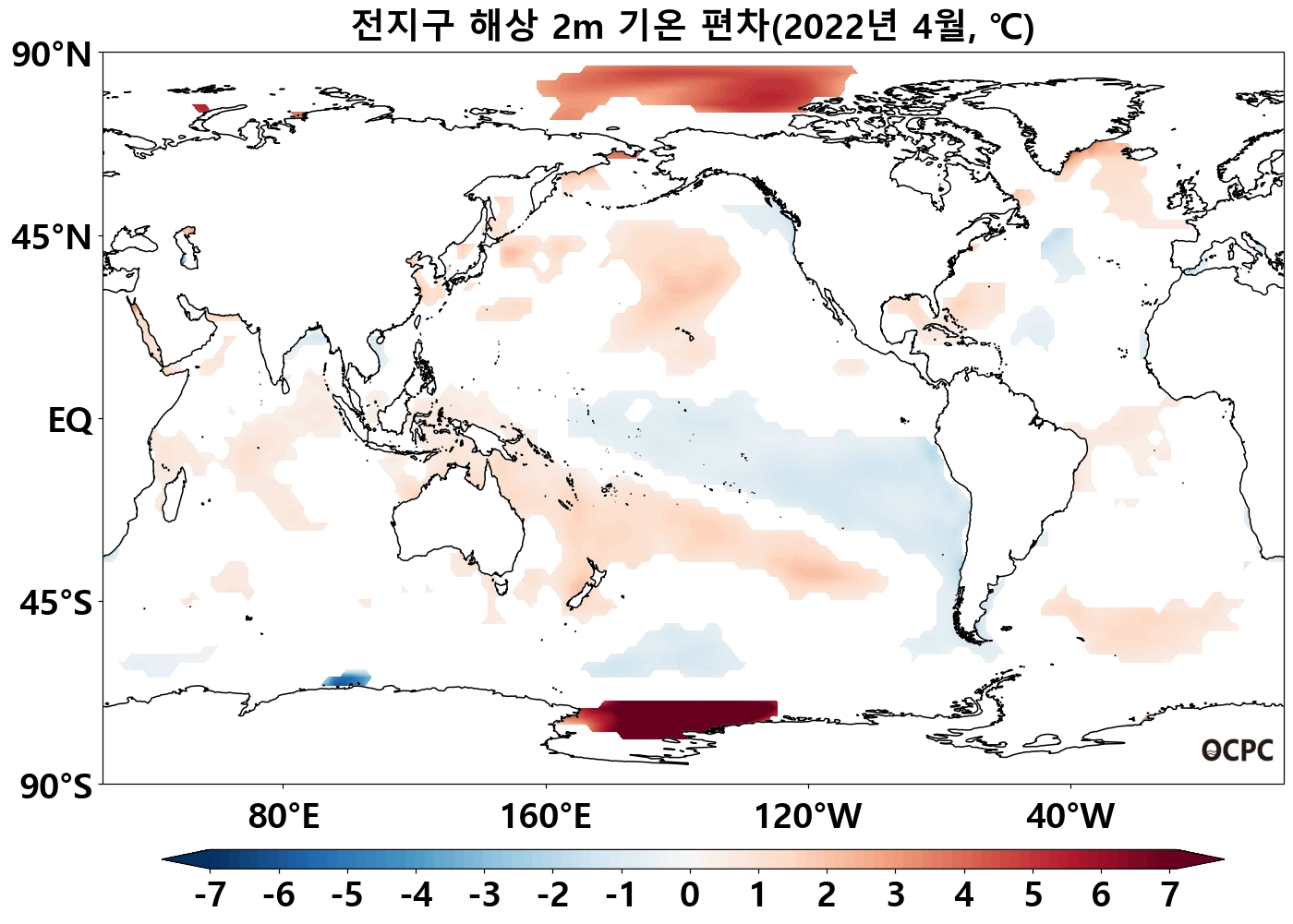 북태평양 열대/중위도(180°~140°W, 10°N~50°N), 남태평양 중위도(140°E~100°W, 45°S~10°S) 해역의 해상기온은 평년보다 높았으며, 열대 동태평양(170°E~80°W, 40°S~5°N)은 평년보다 낮았습니다.
