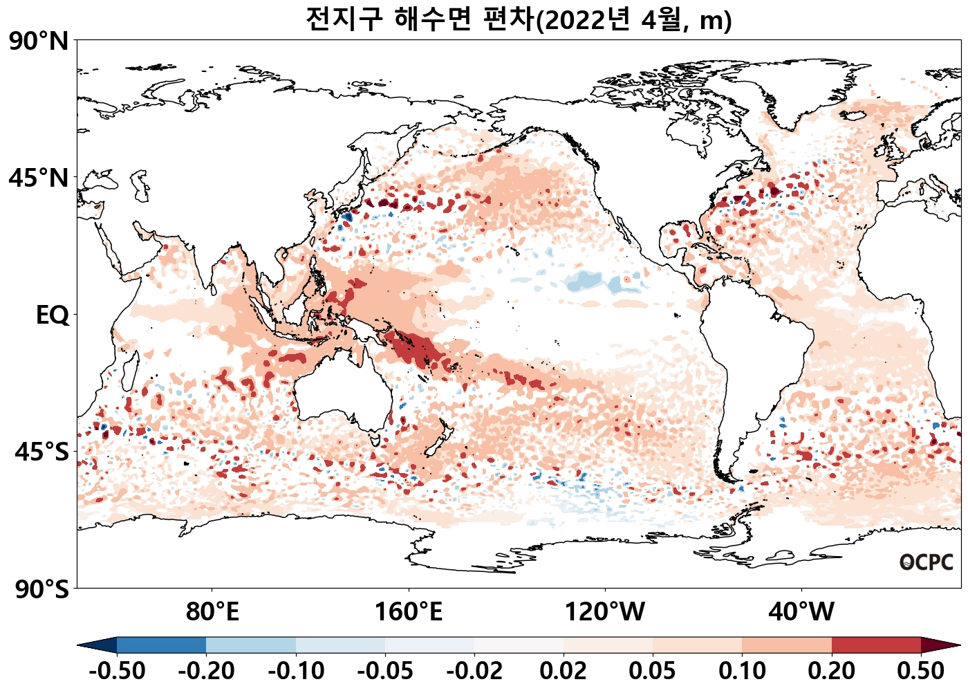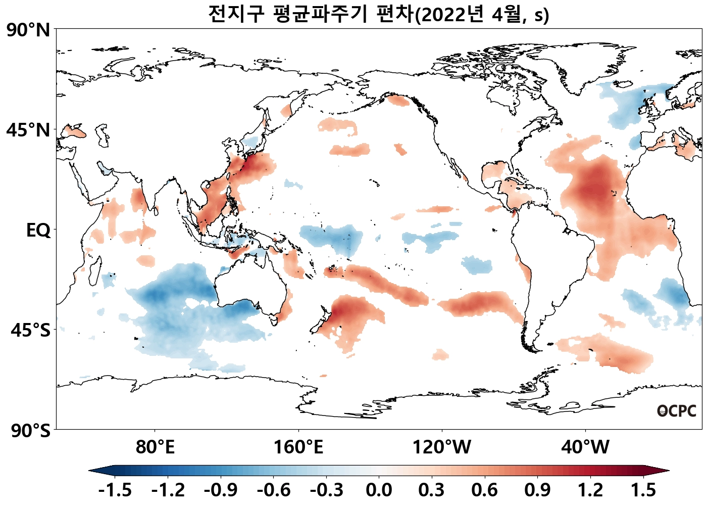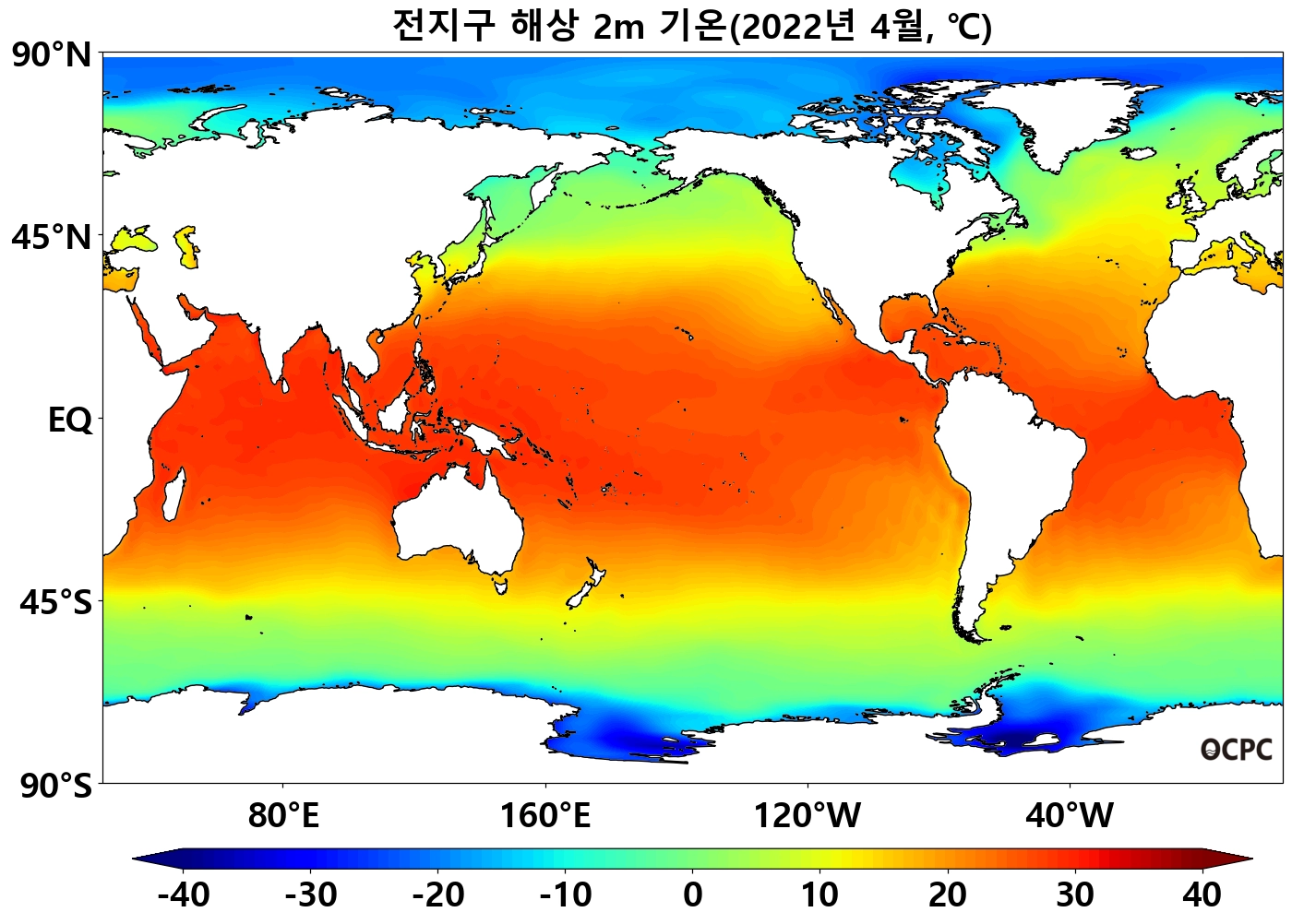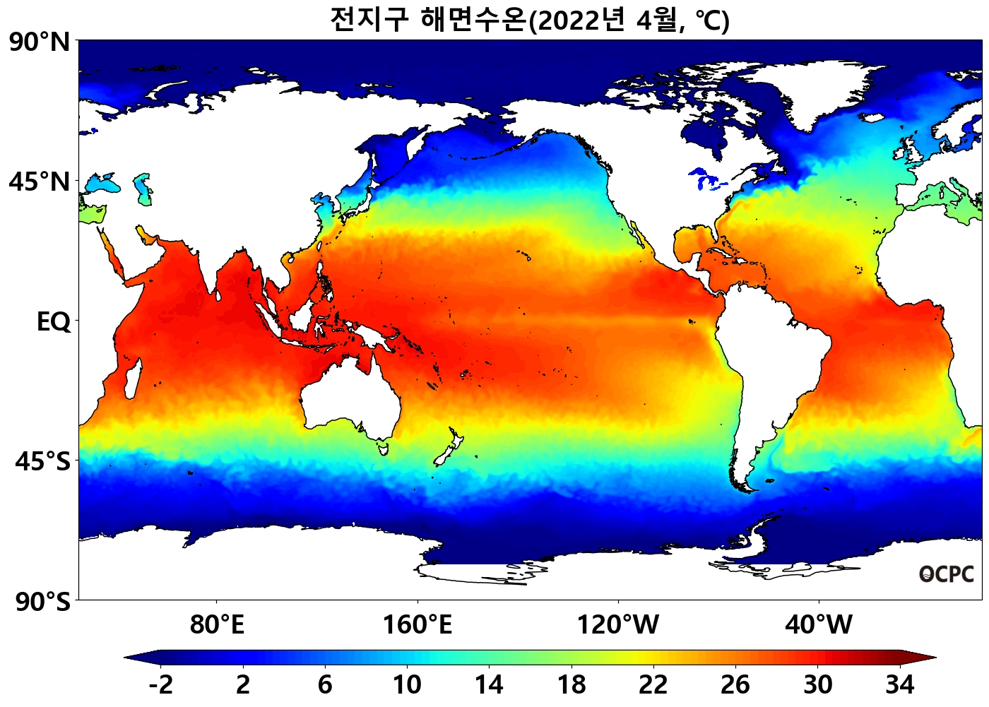 북태평양 열대/중위도(180°~140°W, 10°N~50°N), 남태평양 중위도(140°E~100°W, 45°S~10°S) 해역의 해상기온은 평년보다 높았으며, 열대 동태평양(170°E~80°W, 40°S~5°N)은 평년보다 낮았습니다.