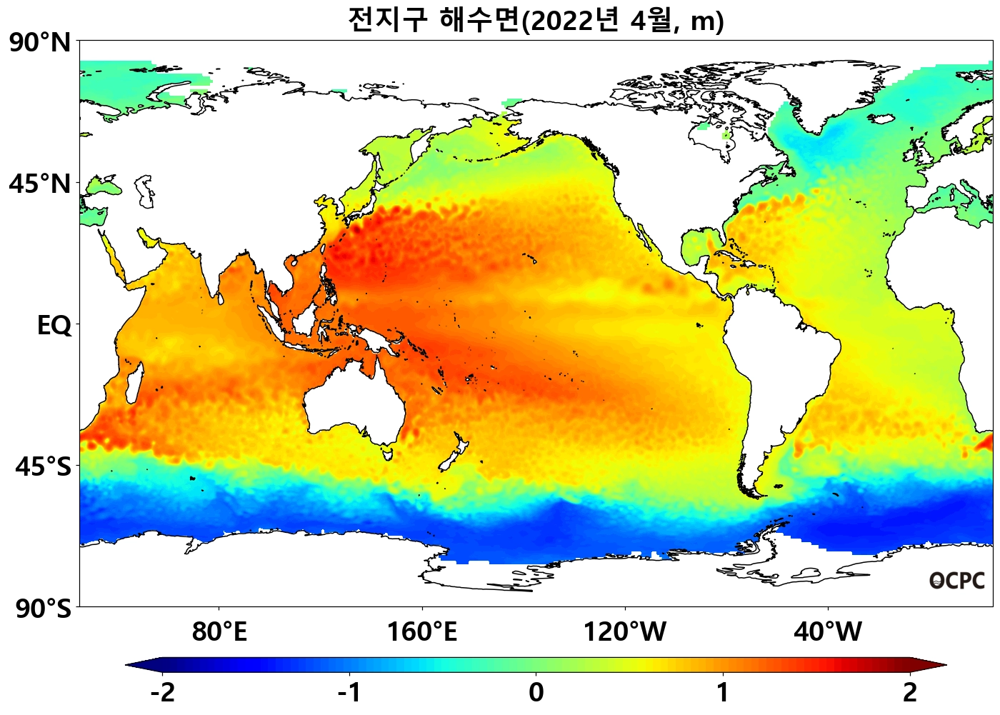 중위도 태평양(30°N~45°N, 30°S~45°S)은 평년보다 높은 반면 열대 동태평양(0~30°S)은 낮았습니다.
