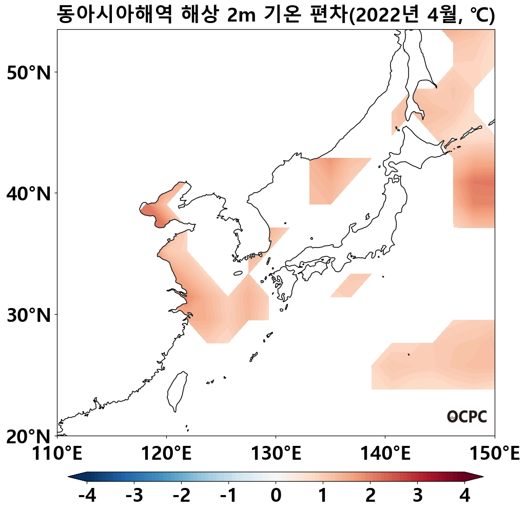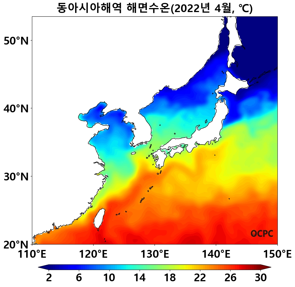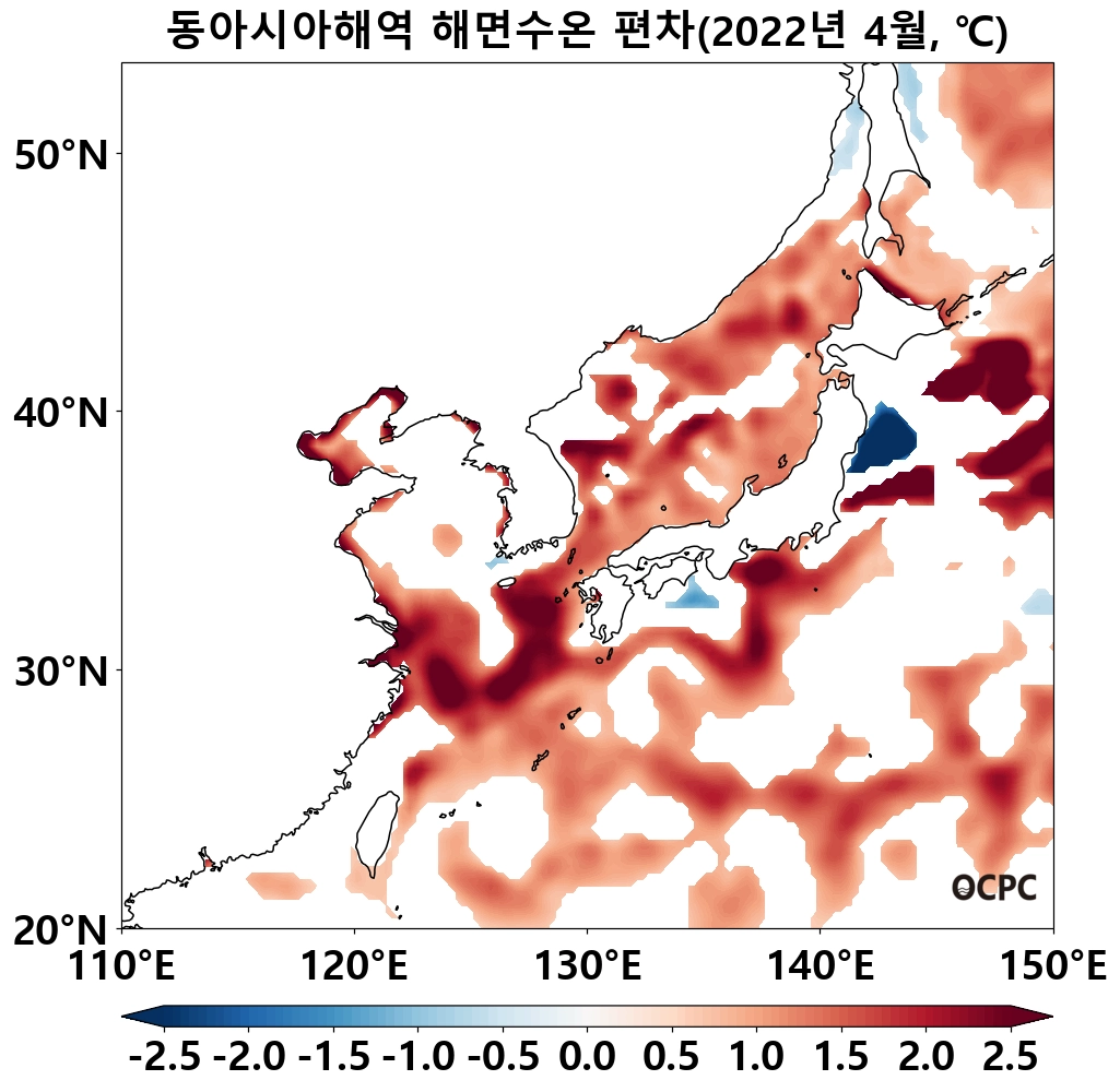 동해는 평년(7.7°C)보다 1.4°C, 동중국해는 평년(18.6°C)보다 1.5°C 높았으며, 지난 30년(4월) 중 가장 높았습니다.